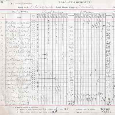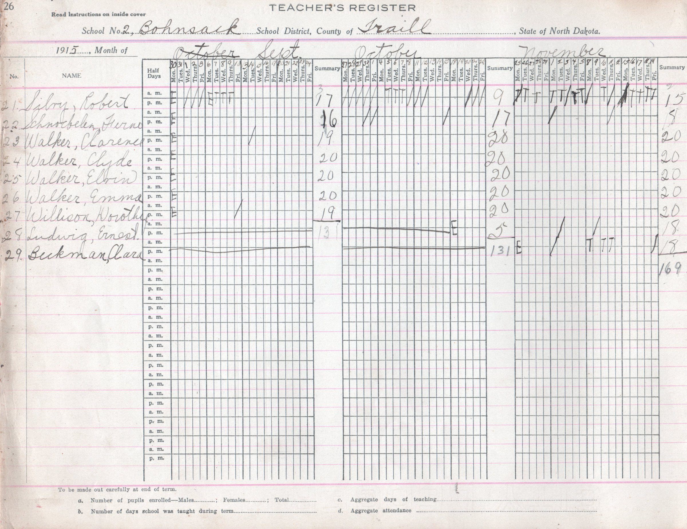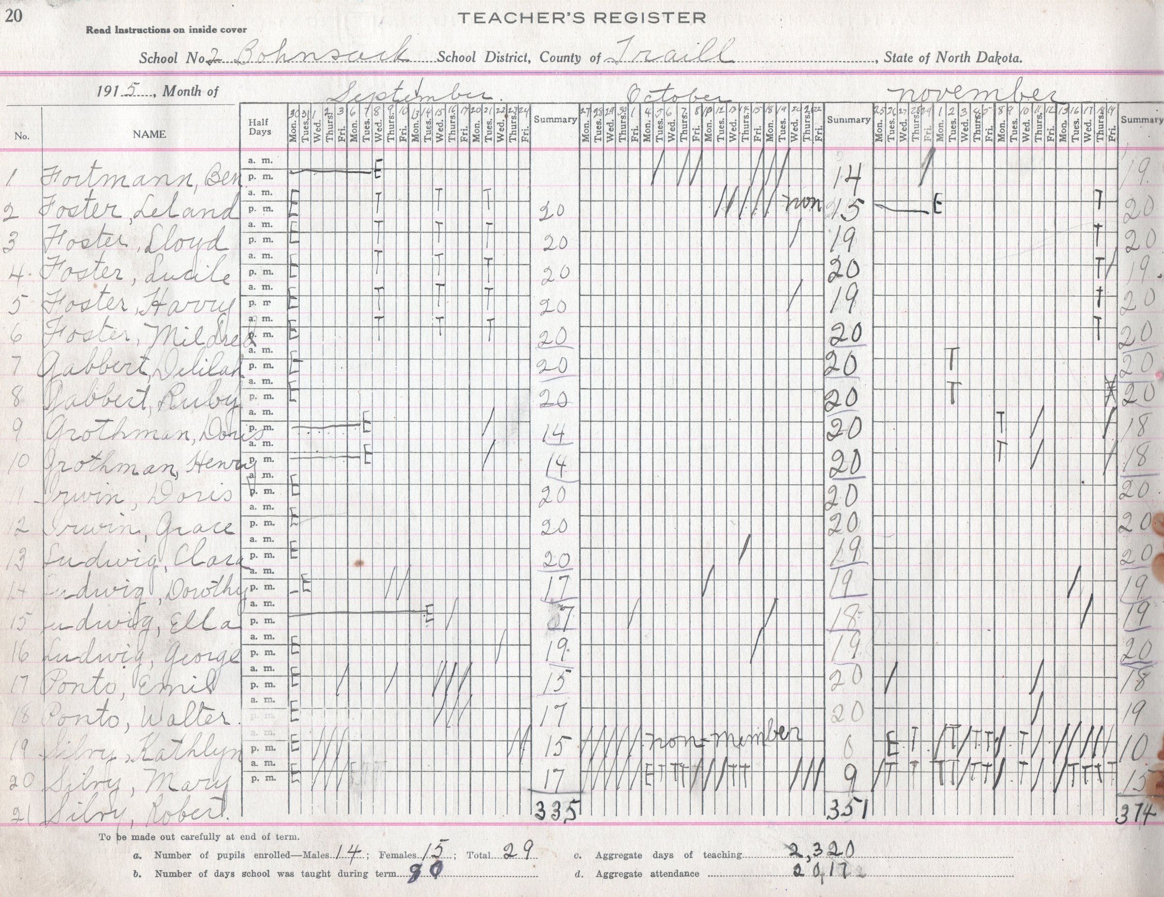 On her Register pages for September to December 1915 (shown below), Hazelle Irwin kept an attendance record for students, including Clara Beckman, Benny Fortman, Harry Foster, Leland Foster, Lloyd Foster, Lucile Foster, Mildred Foster, Deliliah Gabbert, Ruby Gabbert, Doris Grothman, Henry Grothman, Doris Irwin, Grace Erwin, Clara Ludwig, Dorothy Ludwig, Ella Ludwig, Ernest Ludwig, George Ludwig, Emil Ponto, Walter Ponto, Kathy Silvy, Mary Silvy, Robert Silvy, Ferne Schnoebelen, Clarence Walker, Clyde Walker, Elvin Walker, Emma Walker, and Dorothy Willison.