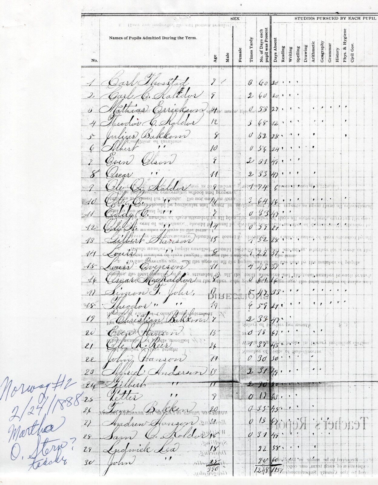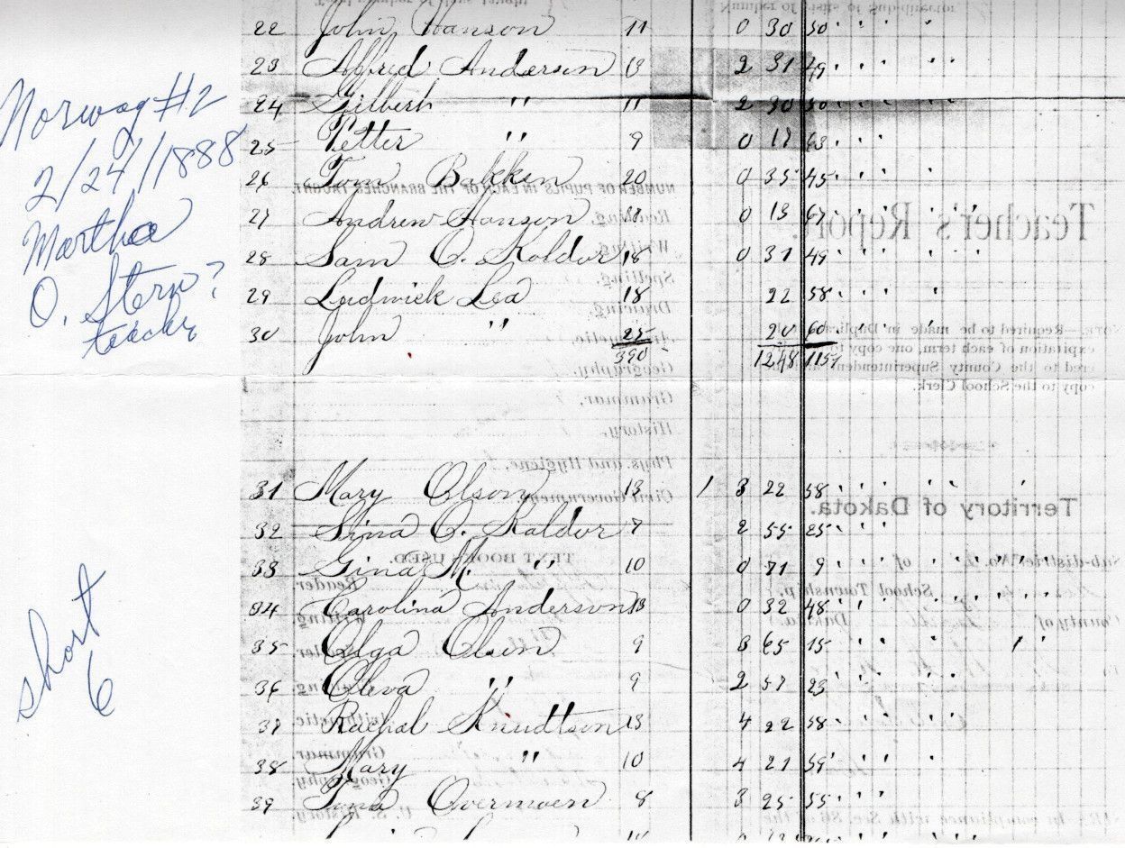 On 24 February 1888, Norway School No. 2 teacher, Martha O. Stern, reported the attendance of 39 students: Alfred Anderson, Caroline Anderson, Gilbert Anderson, Petter Anderson, Albert Bakkum, Christian Bakkum, Julius Bakkum, Tom Bakkum, Mathias Erickson, Louis Evenson, Andrew Hanson, Even Hanson, Gilbert Hanson, John Hanson, Louis Hanson, Simon Jahr, Theodor Jahr, Carl C. Kaldor, Eddy Kaldor, Gina Kaldor, Ole A. Kaldor, Ole C. Kaldor, Ole O. Kaldor, Oscar M. Kaldor, Sam O. Kaldor, Sina Kaldor, Theodor Kaldor, Mary Knudtson, Rachal Knudtson, John Lea, Ludwick Lea, Even Olson, Mary Olson, Olga Olson, Oliva Olson, Oscar Olson, Tona Overmoen, Ole K. Reer, Carl Thorstad.