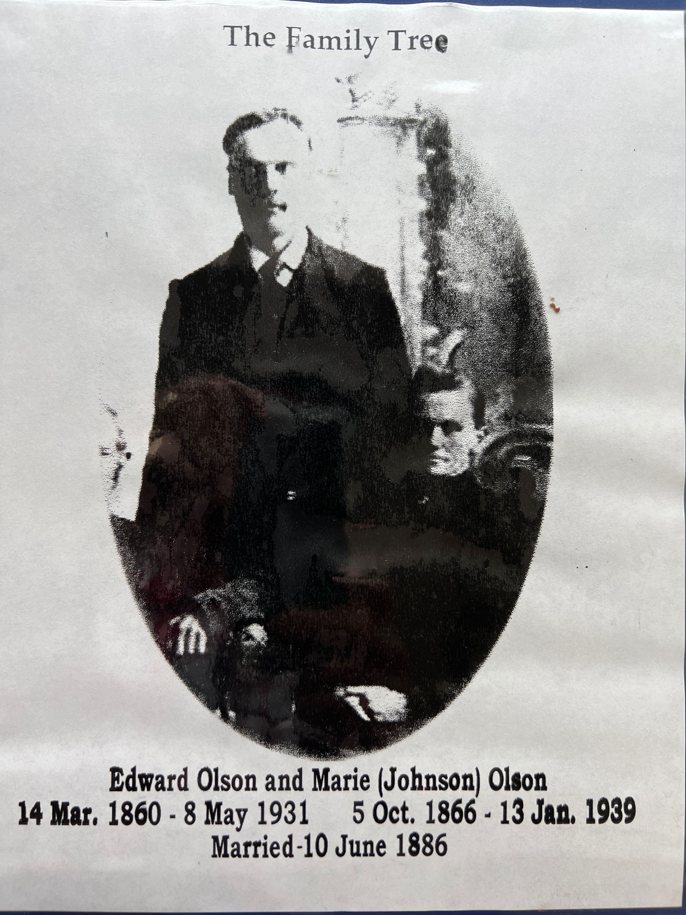 A three-ring binder on a family history of the family of Edward Olson (1860-1931) and his wife Marie (Johnson) Olson (1866-1939), compiled by Norma and Blaine Schultz, donated October 2000 (D1189-a). The binder also contains information about the August and Caroline (Konell) Schutlz family (D1189-b).Cataloged By