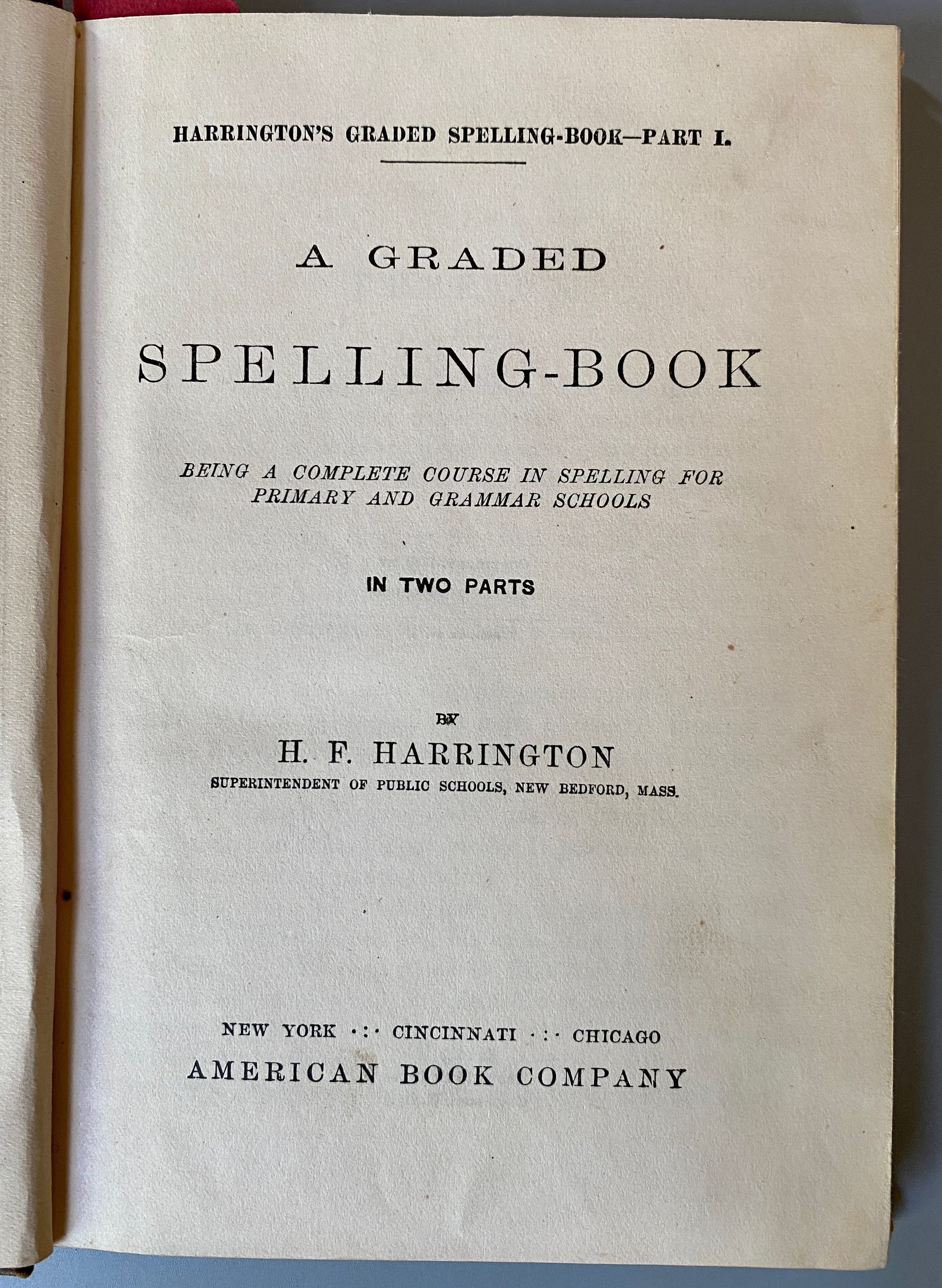 Harrington’s Spelling Book by H. F. Harrington, Copyright 1880 Harper & Bros. Published by American Book Co.Cataloged By