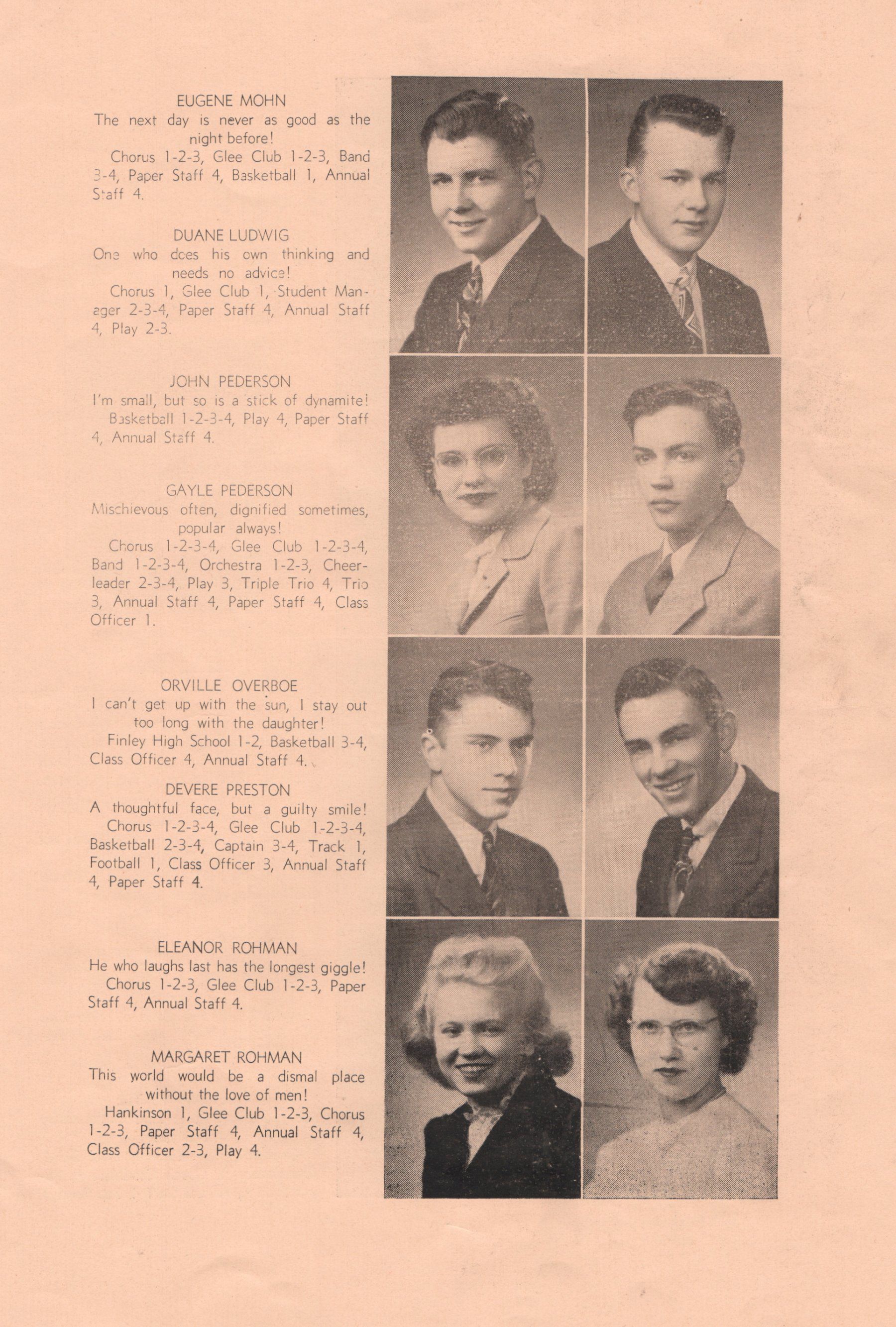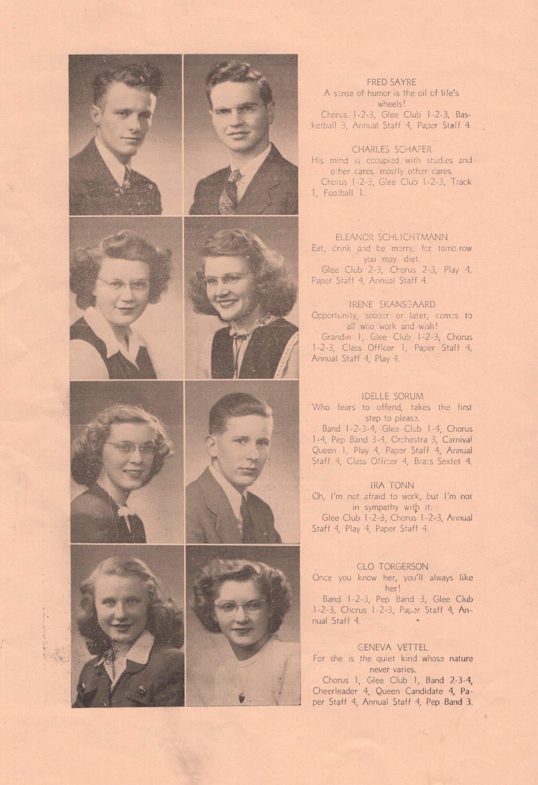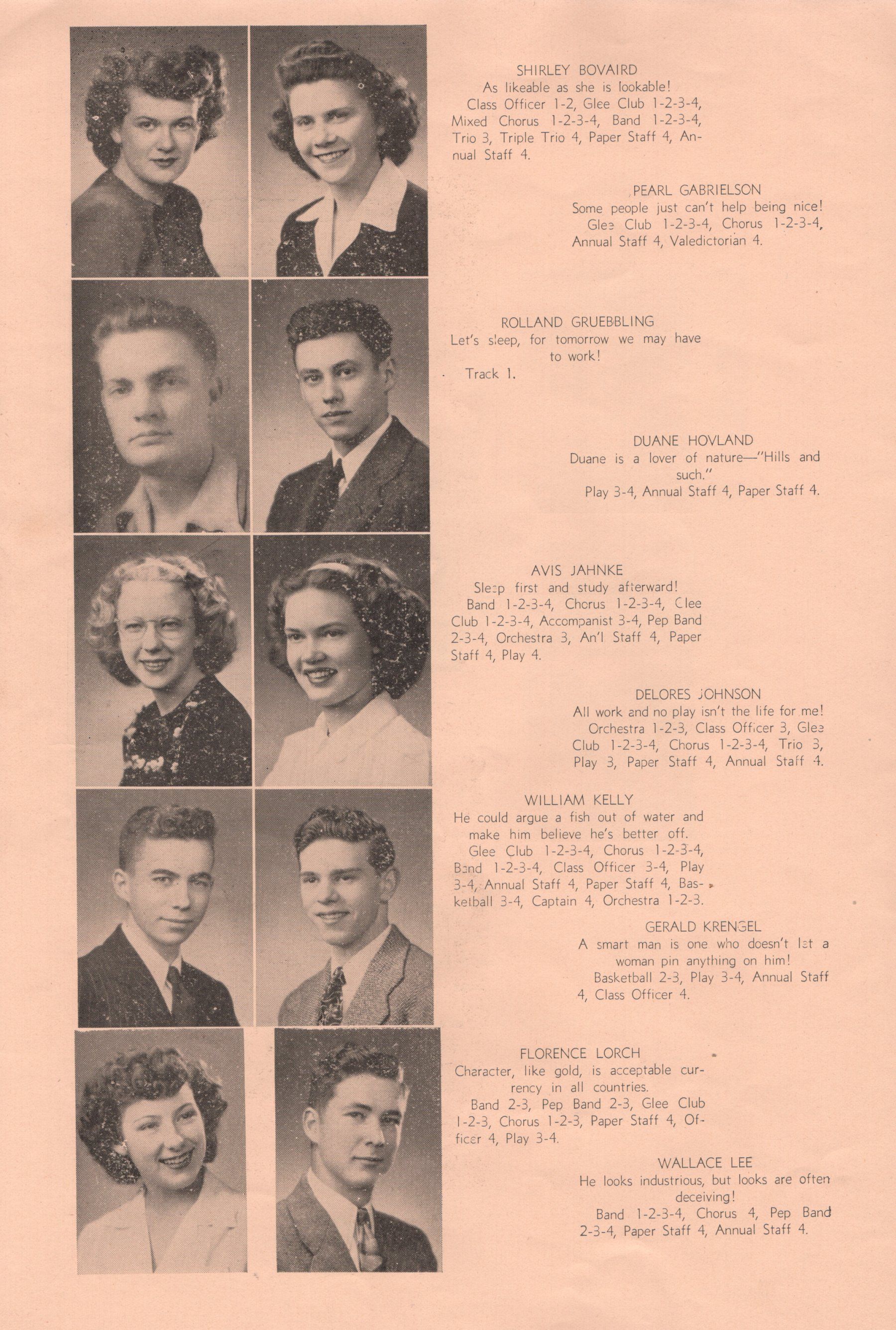 The 1946 Hillsboro High School Yearbook includes three pages of Class of 1946 Senior student photographs for: Shirley Bovaird, Pearl Gabrielson, Rolland Gruebbling Duane Hovland, Avis Jahnke, Delores Johnson, William Kelly, Gerald Krengel, Florence Lorch, Wallace Lee, Eugene Mohn, Duane Ludwig, Gayle Pederson, John Pederson, Orville Overboe, Devere Preston, Eleanor Rohman, Margaret Rohman, Fred Sayre, Charles Schafer, Eleanor Schlichtmann, Irene Skansgaard, Idelle Sorum, Ira Tonn, Glo Torgerson, and Geneva Vettel.