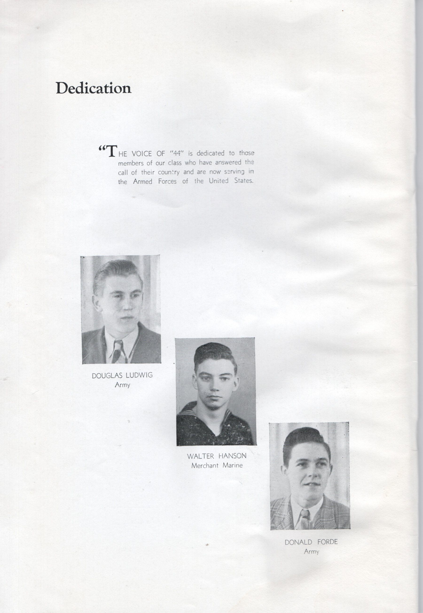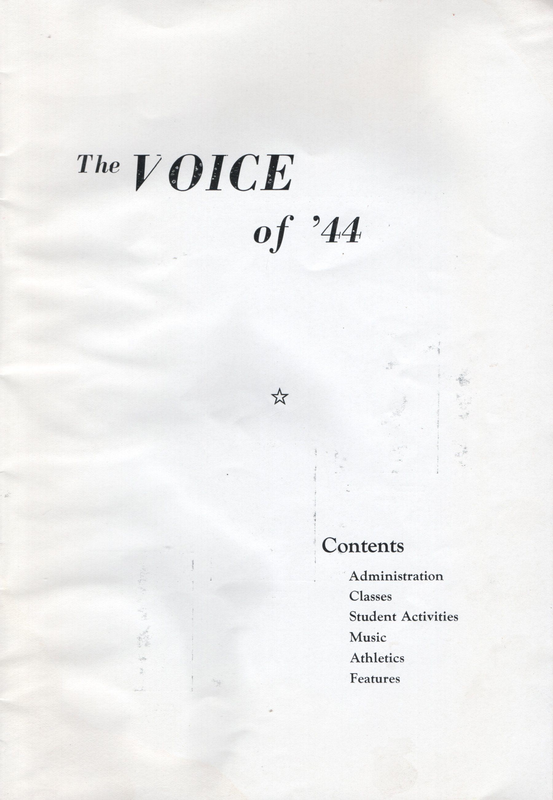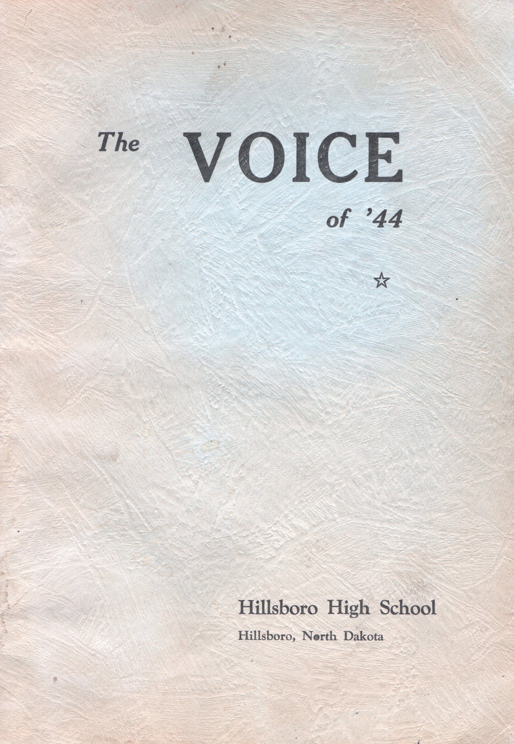 The Class of 1944 Hillsboro High School Yearbook, titled The Voice of '44, was dedicated to three members of their class, Douglas Ludwig, Walter Hanson, and Donald Forde, who were serving in WWII. This 1944 yearbook includes a title page, and three pages of Class of 1944 student photographs for: Gwendolyn Akason, Edith Anderson, Marvelle Bovaird, Muriel Bovaird, James Baglien, Jean Bakkum, Milton Beltz, Rollo Cassady, Ruth Doeden, Valdyss Espeseth, Milton Evenson, Marie Frendberg, Lilas Gunkel, Harold Hanson, Elizabeth Anne Kelly, Robert Koering, Doris Kozojed, Robert Lien, Florence Lovas, Dorothy Ludwig, Earl Muller, Marian Oien, Merlin Rudrud, Herbert Schlichtmann, Naomi Schuricht, Elaine Siegert, Meredith Sorley, Maxine Staska, Harold Vettel, and Kenneth Ydstie.