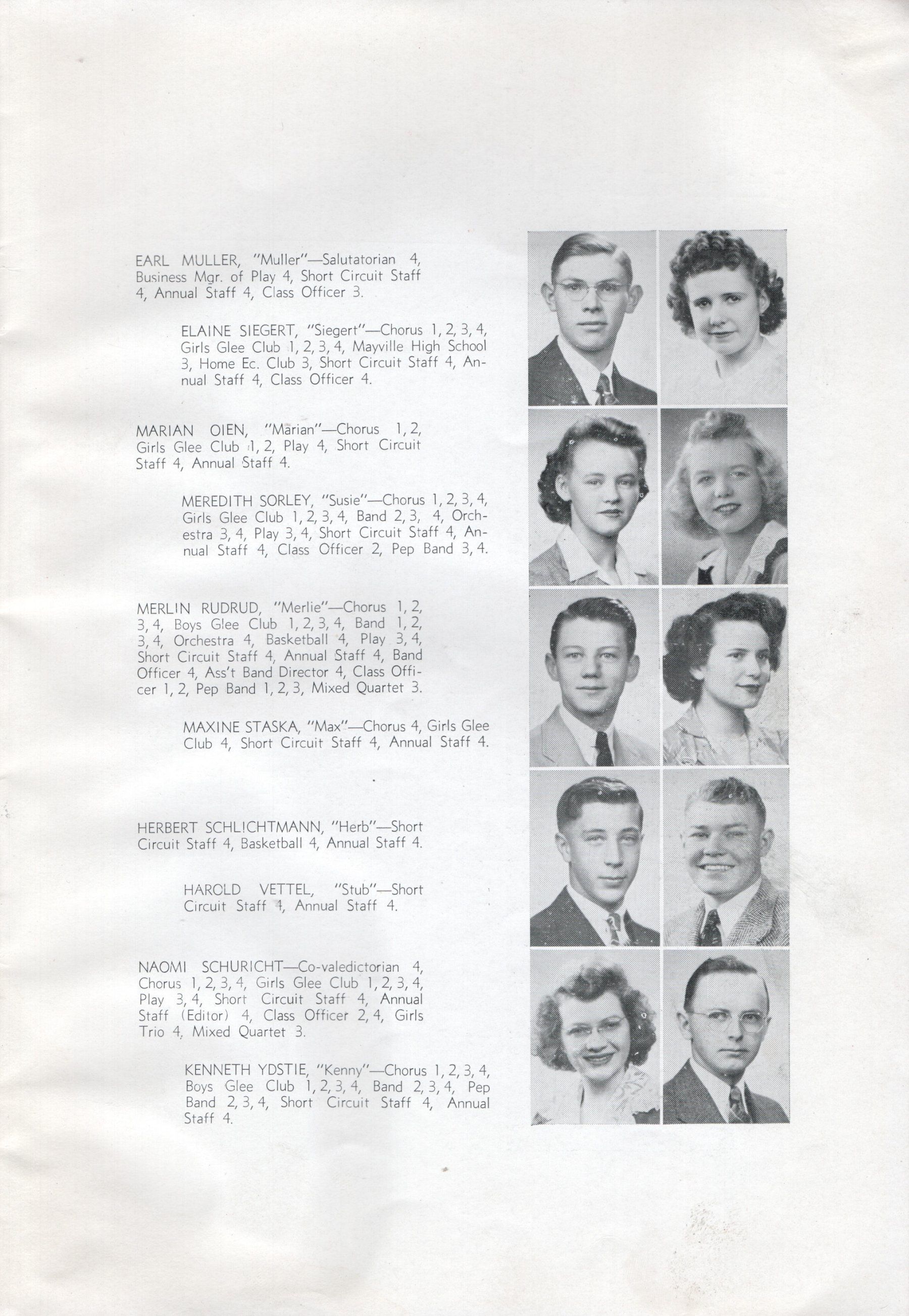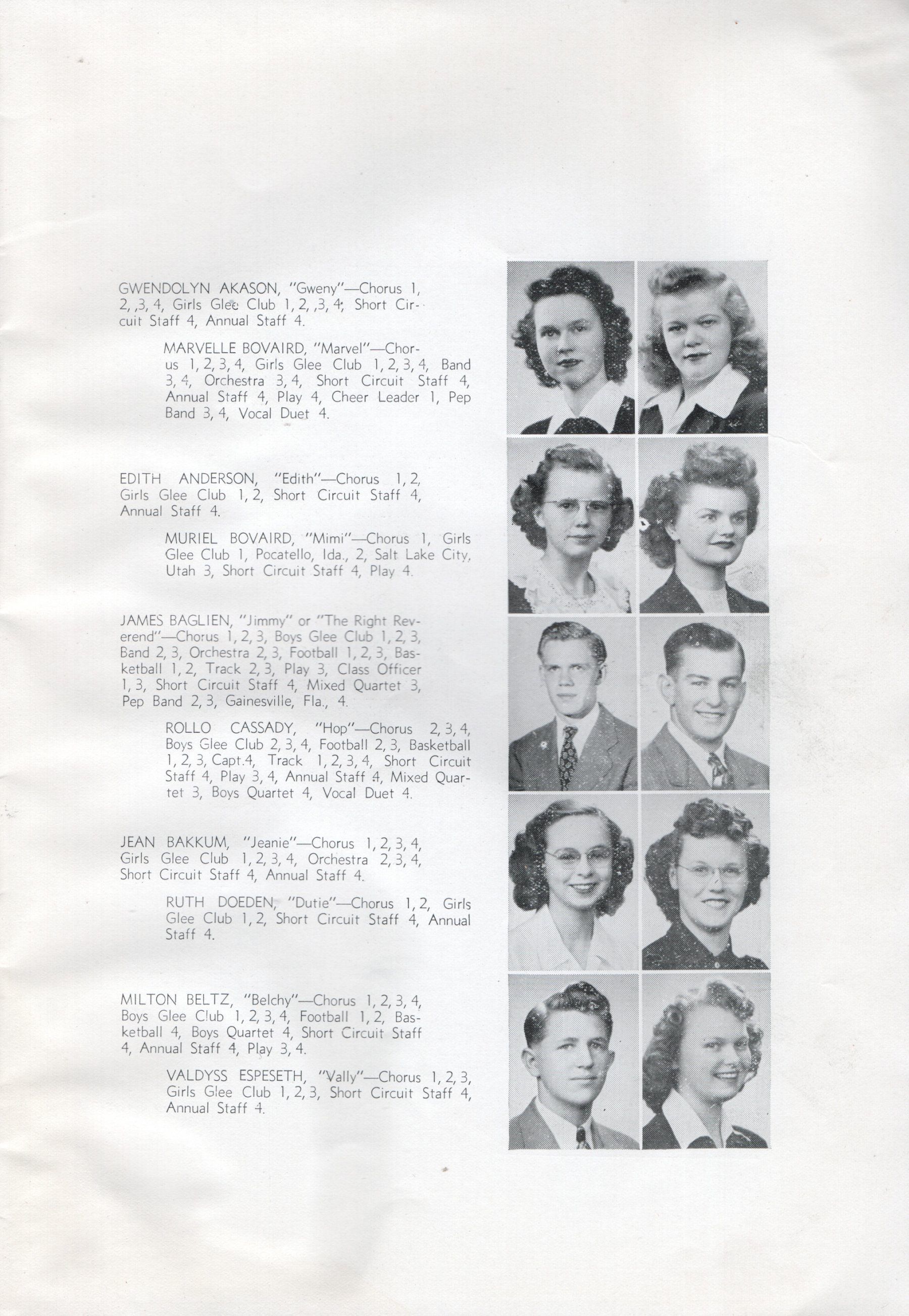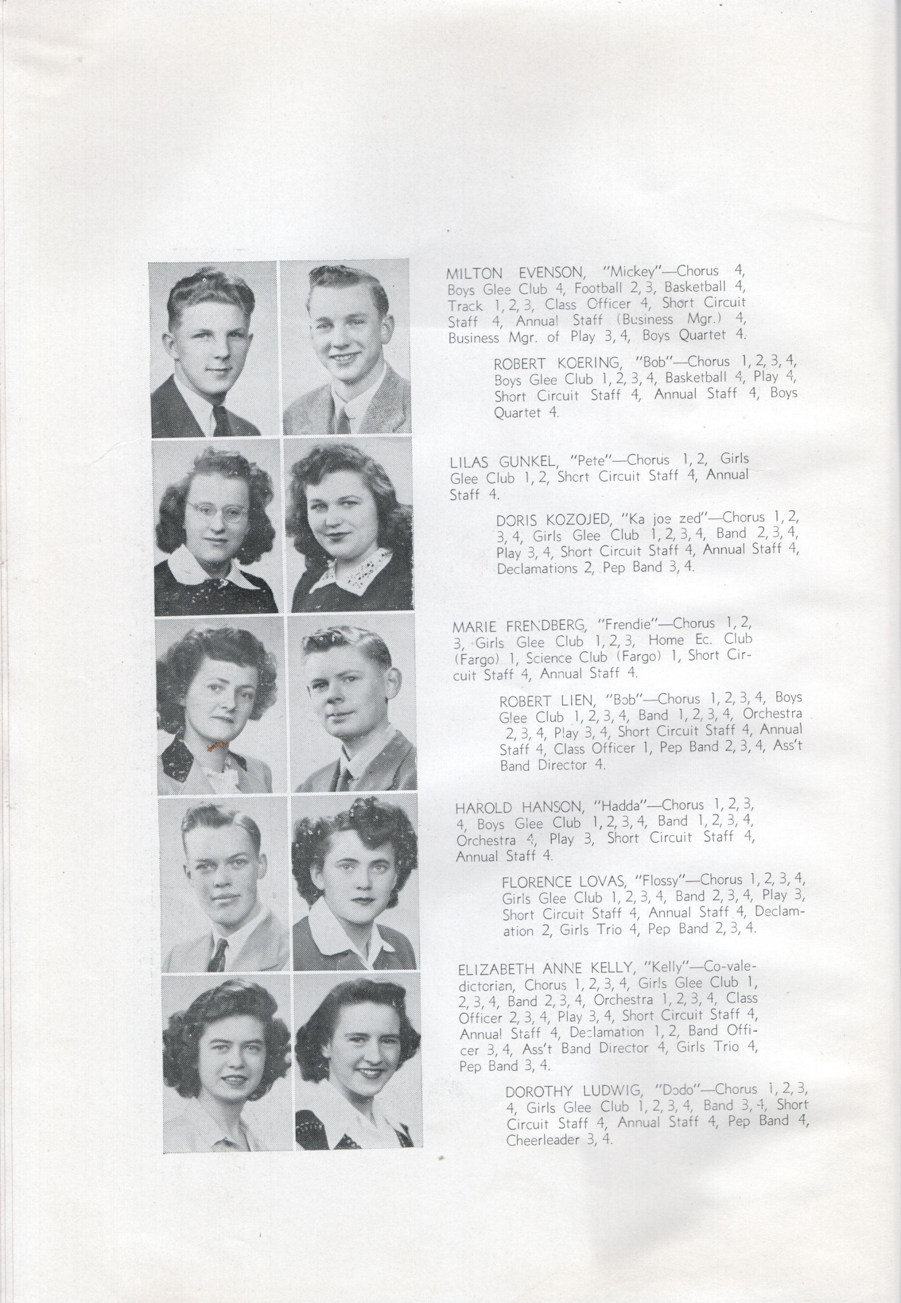The Class of 1944 Hillsboro High School Yearbook, titled The Voice of '44, was dedicated to three members of their class, Douglas Ludwig, Walter Hanson, and Donald Forde, who were serving in WWII. This 1944 yearbook includes a title page, and three pages of Class of 1944 student photographs for: Gwendolyn Akason, Edith Anderson, Marvelle Bovaird, Muriel Bovaird, James Baglien, Jean Bakkum, Milton Beltz, Rollo Cassady, Ruth Doeden, Valdyss Espeseth, Milton Evenson, Marie Frendberg, Lilas Gunkel, Harold Hanson, Elizabeth Anne Kelly, Robert Koering, Doris Kozojed, Robert Lien, Florence Lovas, Dorothy Ludwig, Earl Muller, Marian Oien, Merlin Rudrud, Herbert Schlichtmann, Naomi Schuricht, Elaine Siegert, Meredith Sorley, Maxine Staska, Harold Vettel, and Kenneth Ydstie.