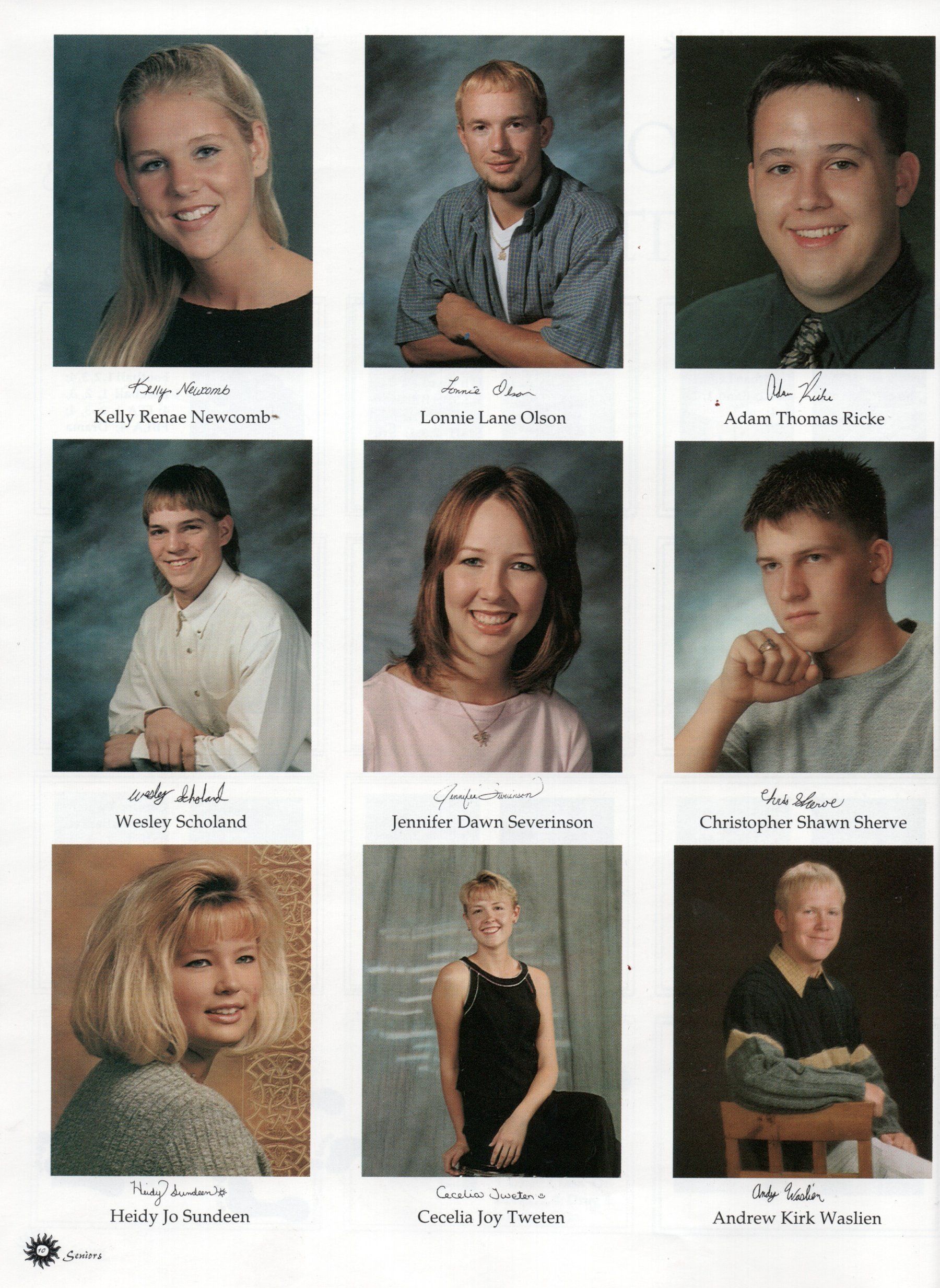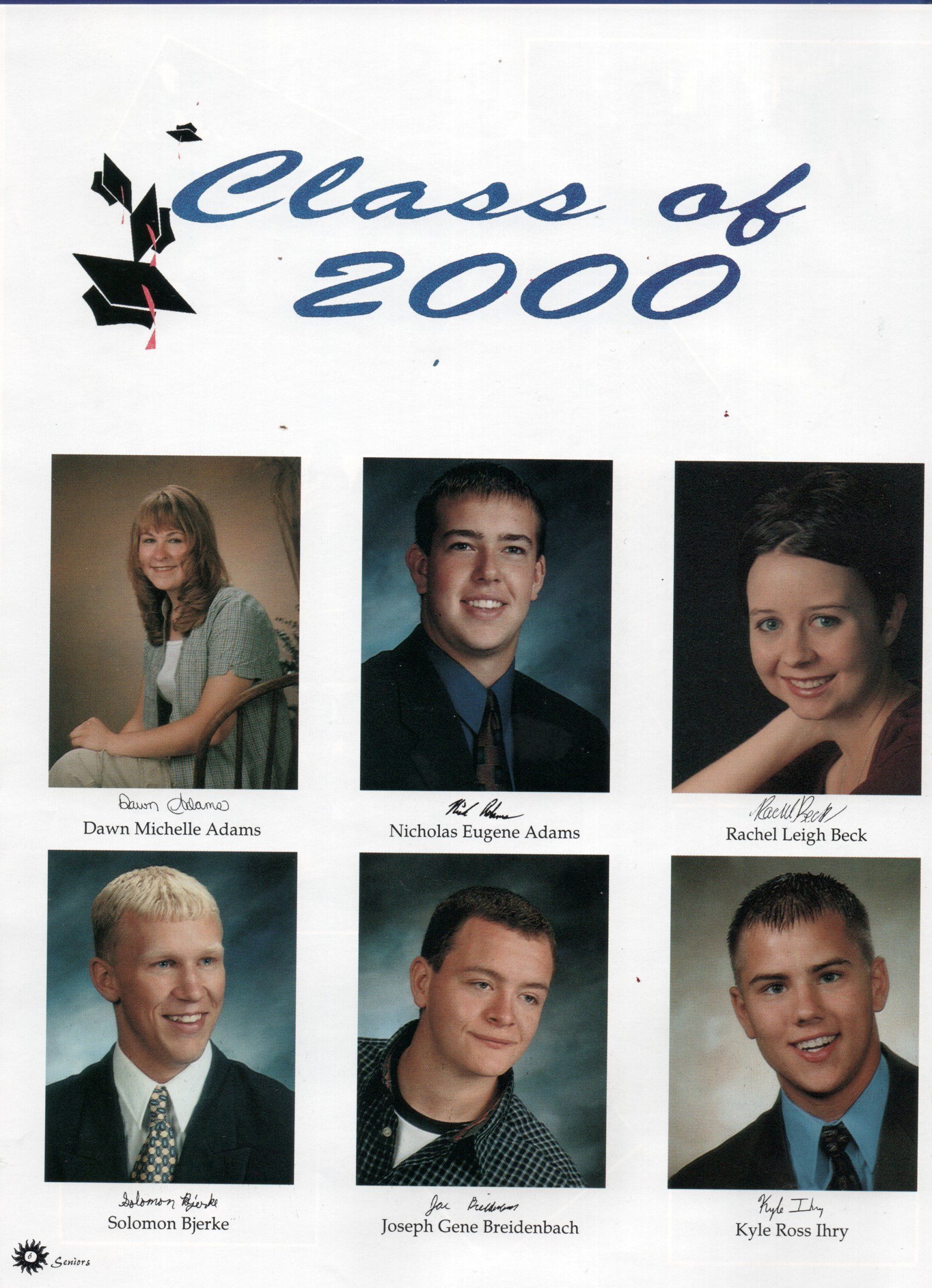The Senior Class of 2000 yearbook has 21 student photos: Dawn Adams, Nicholas Adams, Rachel Beck, Solomon Bjerke, Joseph Breidenbach, Kyle Ihry, Nikki Kostrewski, Michele Krogstad, Brian Langowski, Amanda Lazur, William Leddige, Jonathan Lee, Kelly Newcomb, Lonnie Olson, Adan Ricke, Wesley Scholand, Jennifer Severinsen, Christopher Sherve, Heidy Jo Sundeen, Cecelia Tweten, and Andrew Waslien.