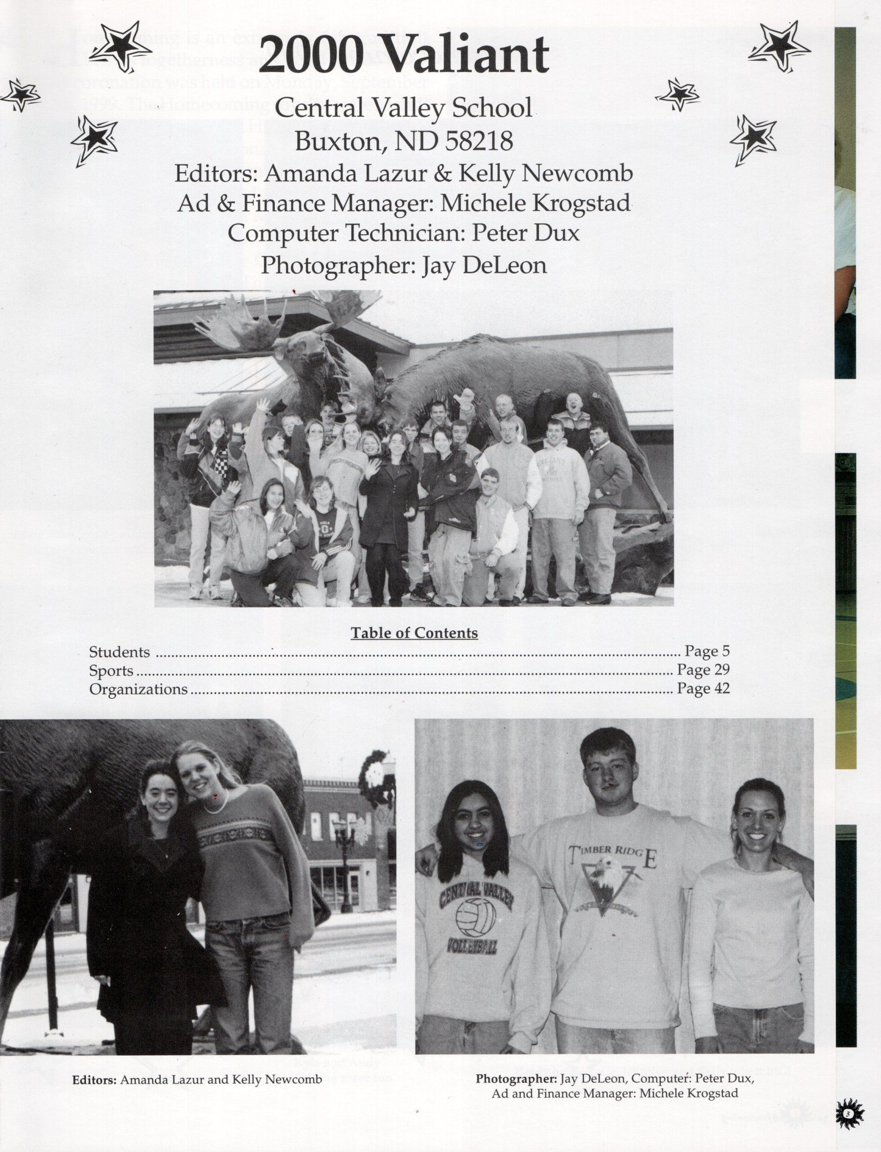 The Class of 2000 Central Valley High School Yearbook, titled "2000 Valiant", was produced by an Annual Staff, with Amanda Lazur and Kelly Newcomb as Editors, Michele Krogstad as Ad & Finance Manager, Peter Dux as Computer Technician, and Jay DeLeon as Photographer. The title page includes a Table of Contents.