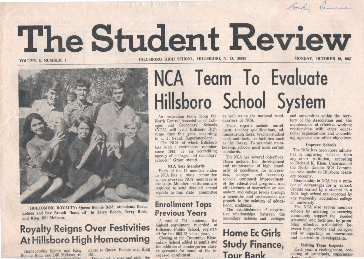 In 1967, from October to December (issue missing) the Hillsboro High School students published a newspaper titled "The Student Review". The newspaper staff included Mike Sandsmark and Mary Sorum, Co-Editors; Marilyn Wiger and Donna Salo, Associate Editors; LeeAnn Fankhanel, Mary Kamesch, Patty Thompson, Nancy Hanson, Patty Rohman and Pam Rohman, Business Staff; Sharon Kritzberger, Laurie Kaldor, Janice Erickson, Roger Rotvold, Vicki Heckman, Neil Hutchinson, Kathy Sadler, Ardith Rue, Pam Rohman, Bev Brandt, Barry Jeffers, Gary Euren, and Terry Reed, Reporters; Richard Flieth, Terry Beach, Steve Letnes, and Bill McLean, Sports; Sue Gilbertson, Wayne Koering, Tom Eblen, Roger Thompson, Bog Tweten, Bill Vettel, Bonnie Reed, Steve Basol, Gary Mjoness, Richard McInnes, Charles Kilgore, Keith Gunderson, Jay Orvik and Jerry Kraby, Circulation; Cheryl Muller, Becca Letnes, Sandy Leverson, Mary Ellen Ludwig, and Linda Dickoff, Typists; and Sherry Ramberg, Pam Rutherford, and Gary Hawkins, Cartoons.