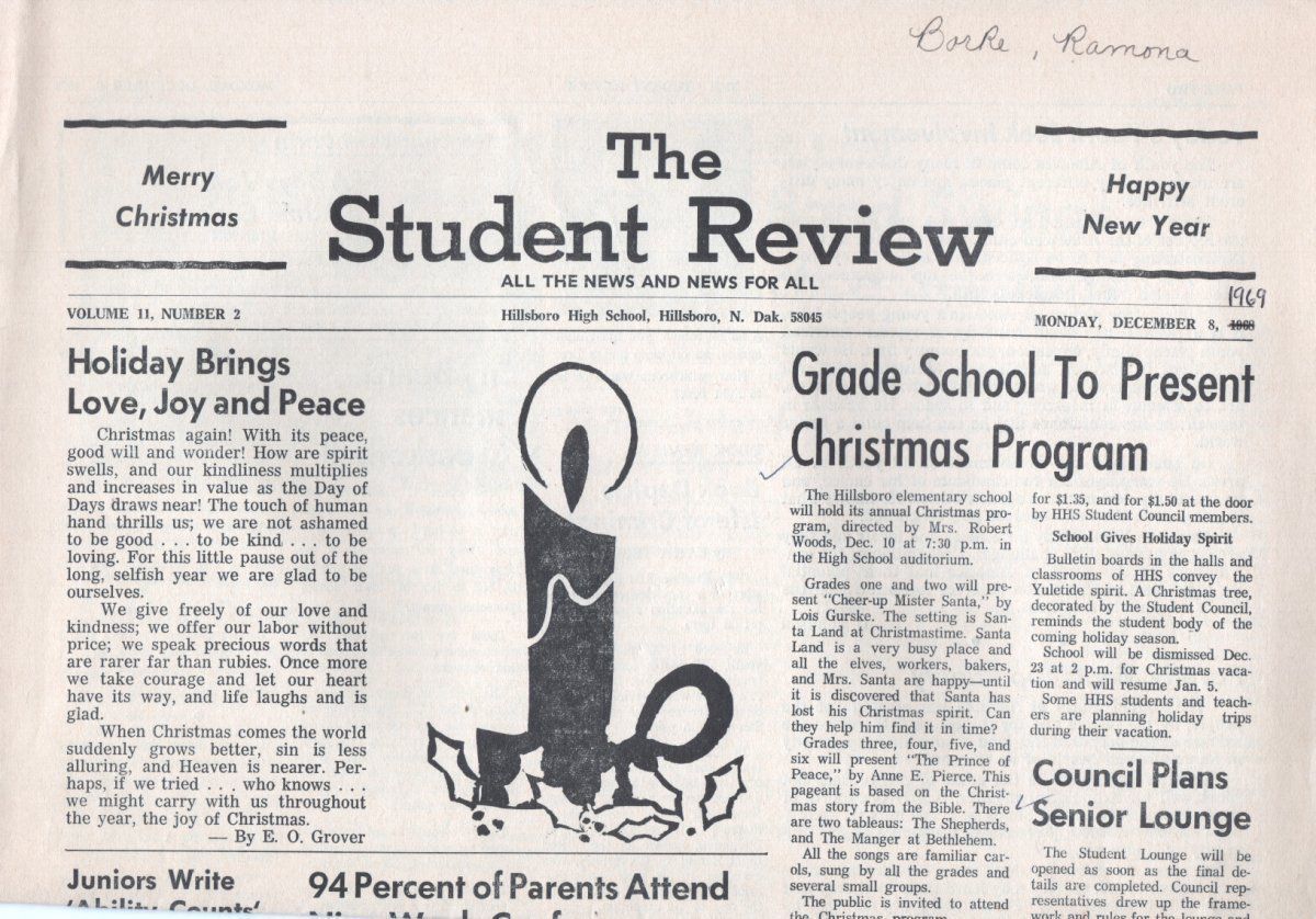 In 1969, from October (issue missing) to December, the Hillsboro High School students published a newspaper titled "The Student Review". The newspaper staff included Beth Bohnsack and Cynthia Johnson, Co-Editors; Kathy Koering and Anita Steenson, Associate Editors; Jeff Steenson, Sports Editor; Cindy Kraby, Barbara Tweten, and Ramona Borke, Business Staff; Joyce Crotty, Carol Seim, Betty Pedersen, Patti Ydstie, Debbie Wiger, Kathy Smith, Greg Downs, Royce Haakenson, Cece Eblen, Sandy Beach, Kathy Thompson, and Vicki Klemetson, Reporters; Lise Eisenhardt, Cuck Rutherford, Dan Allen, Gary Nysveen and Doug Kress, Sports; Linda Worner, Pam Ydstie, DeAnn Svaleson, Debbie Larson, Shirley Salo, Nancy Fankhanel, Rita Rohman, and Donna Elton, Typists; Judy Letnes, Joe Conner, Wayne Dickhoff, Bob Kritzberger, Duane Dumas, Paulette Foss, Dick Mueller, and Joann Schmaltz, Circulation; and Jeff Olsen, and Dennis Halverson, Photographers.