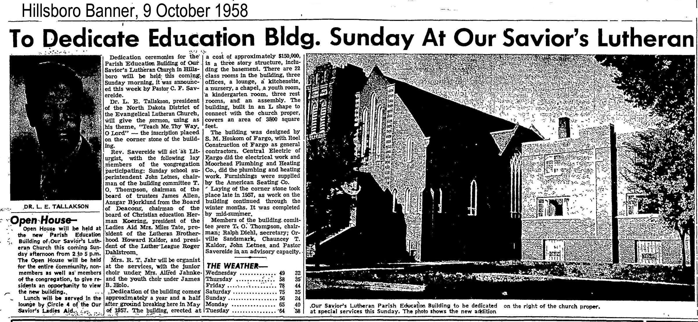 Our Savior's Lutheran Church was organized on 25 June 1917, with the Reverend O. P. Stavaas as the first pastor. Our Savior's Lutheran Church was formed from the former Synod Lutheran Church, with Rev. J. R. Rorvik its first pastor, who served until 1902. A brick building was completed in 1928 after the first church was destroyed by fire in January 1924. A parish education addition was completed and dedicated in 1958, as reported in the 9 October 1958 Hillsboro Banner.Cataloged By