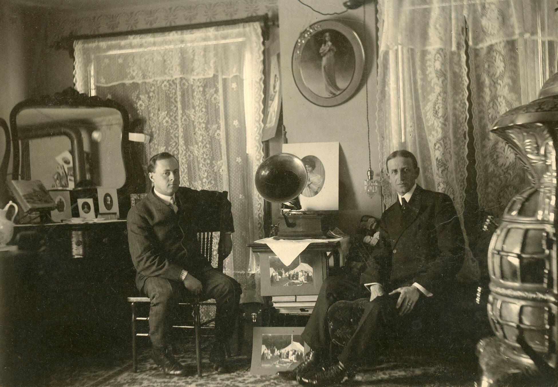 C. Sandven & B. Davis sitting by a phonograph in the upstairs of the Potterud HomeCataloged By