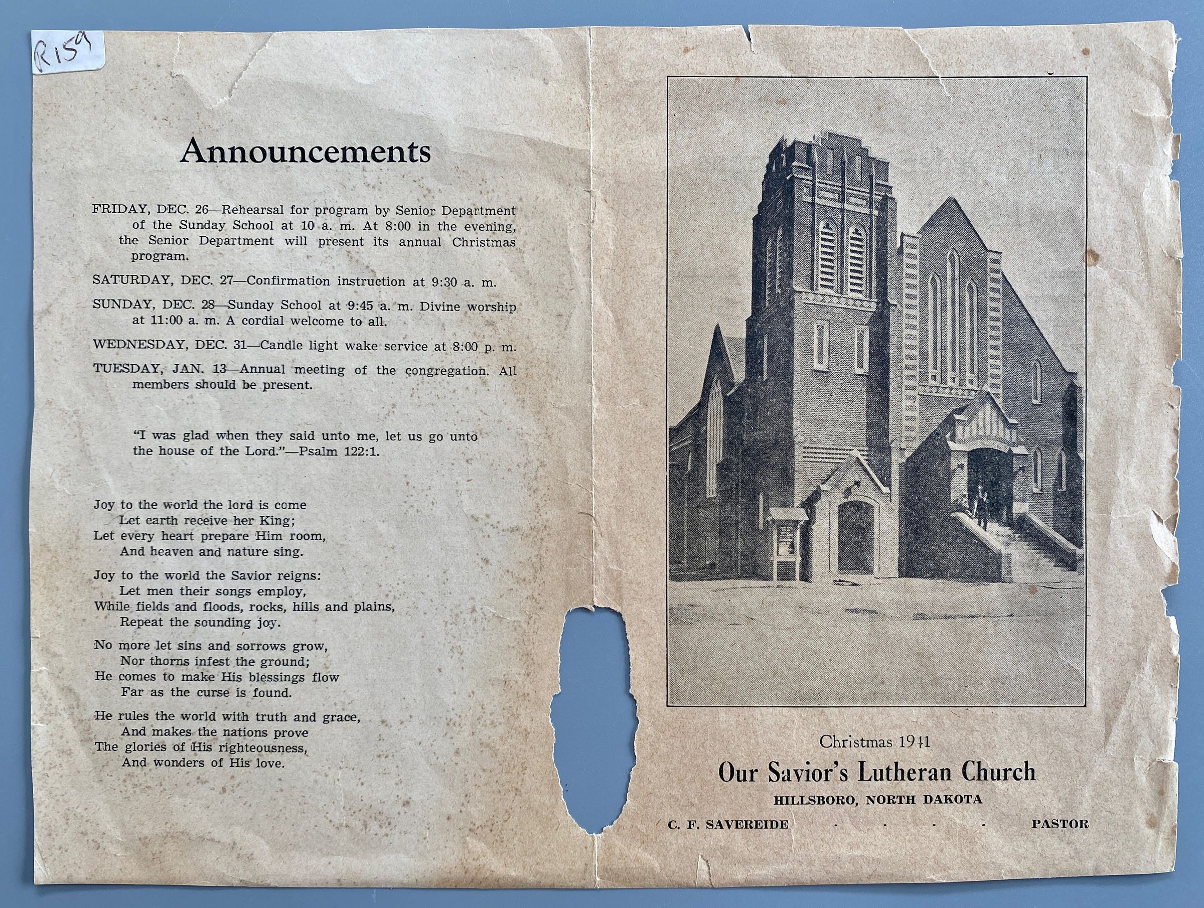 1941 Our Savior’s Lutheran Church Christmas Service Bulletin. Pastor Savereide began his service at Our Savior's Lutheran in 1941.Cataloged By