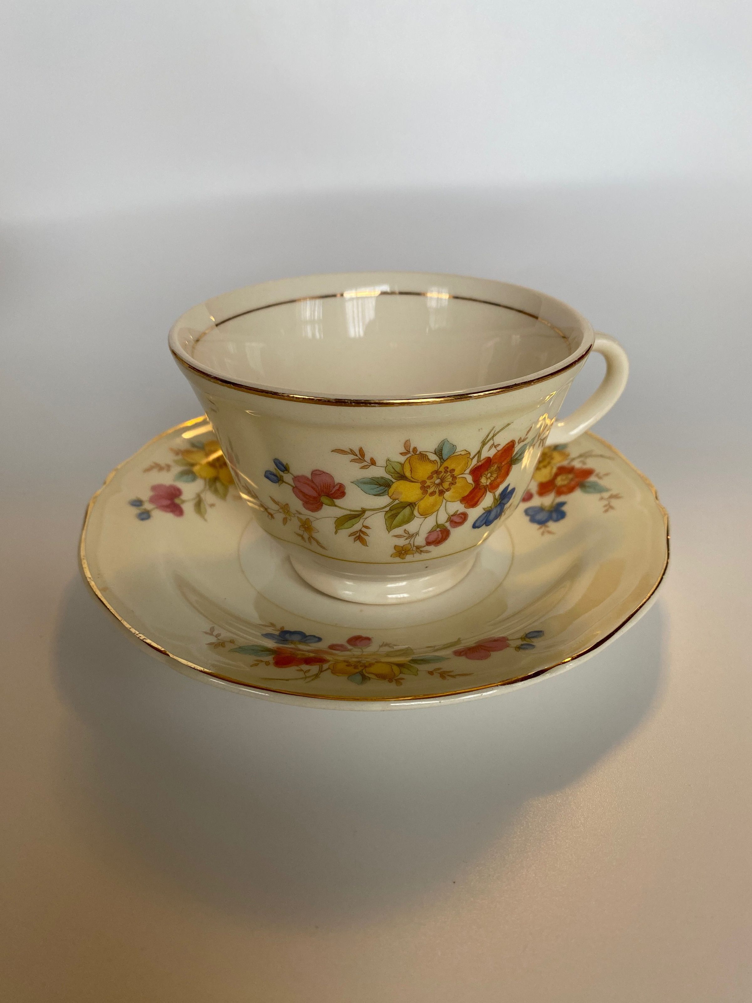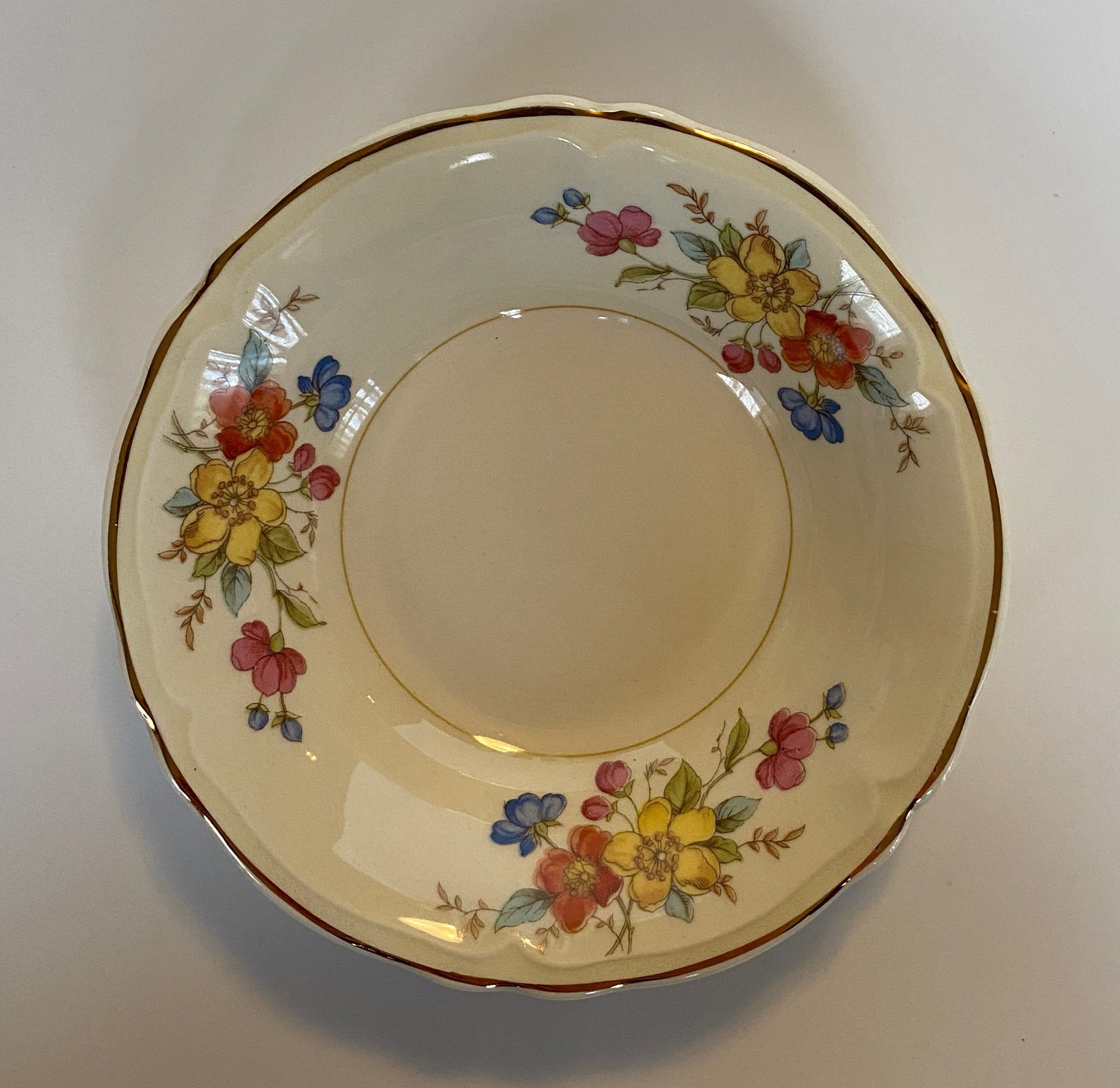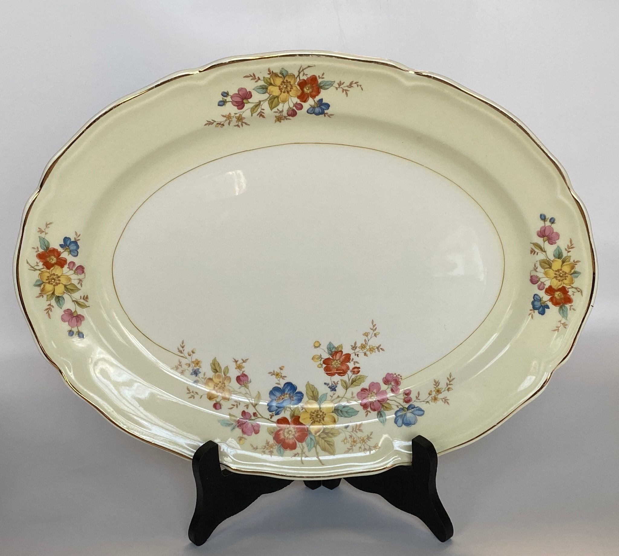 Set contains - 7 dinner plates, 7 cups and saucers, six dessert plates, 8 fruit bowls, sugar bowl & creamer, and platter.