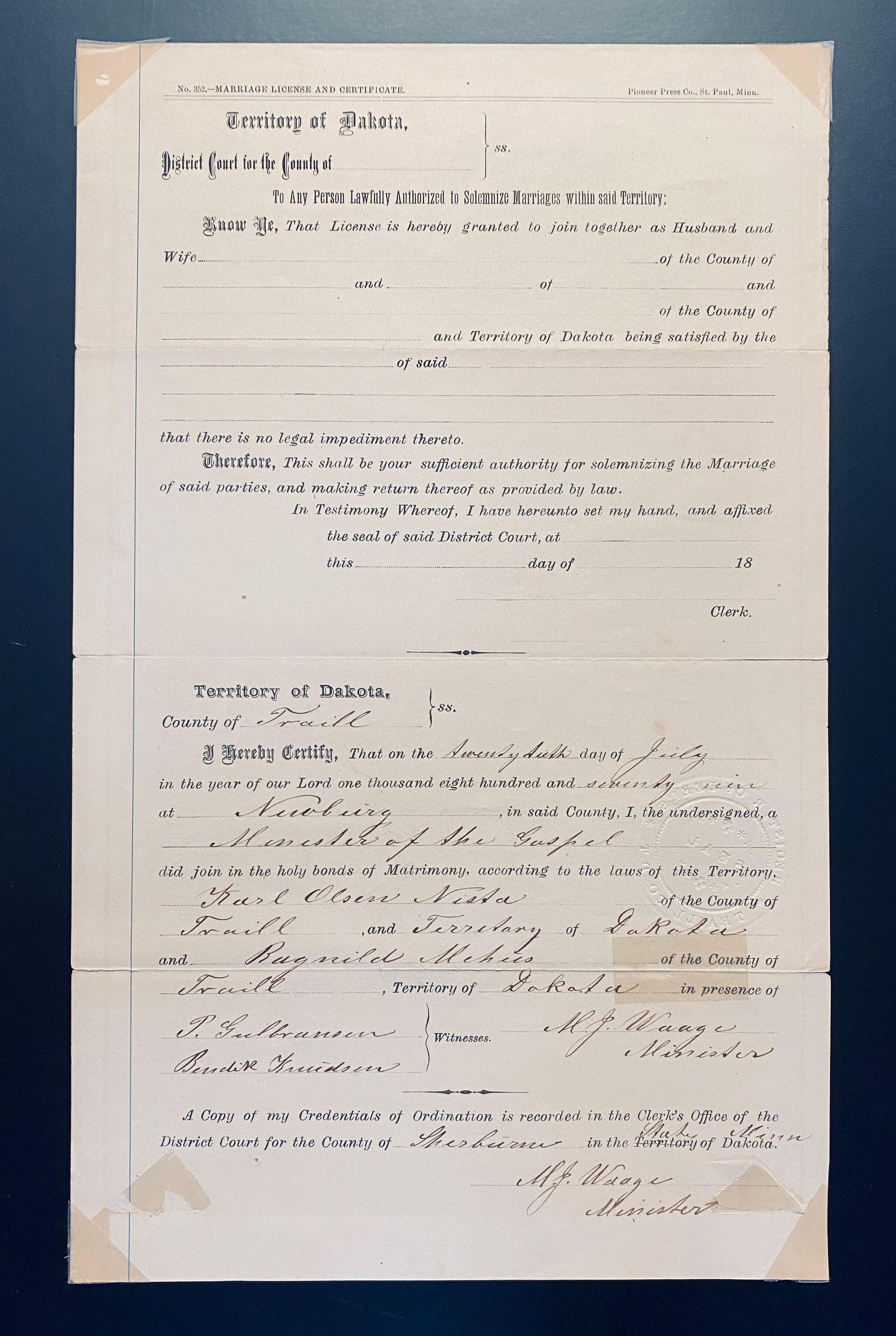 1879 Marriage Certificate, Karl Nista and Ragnild MehusCataloged By