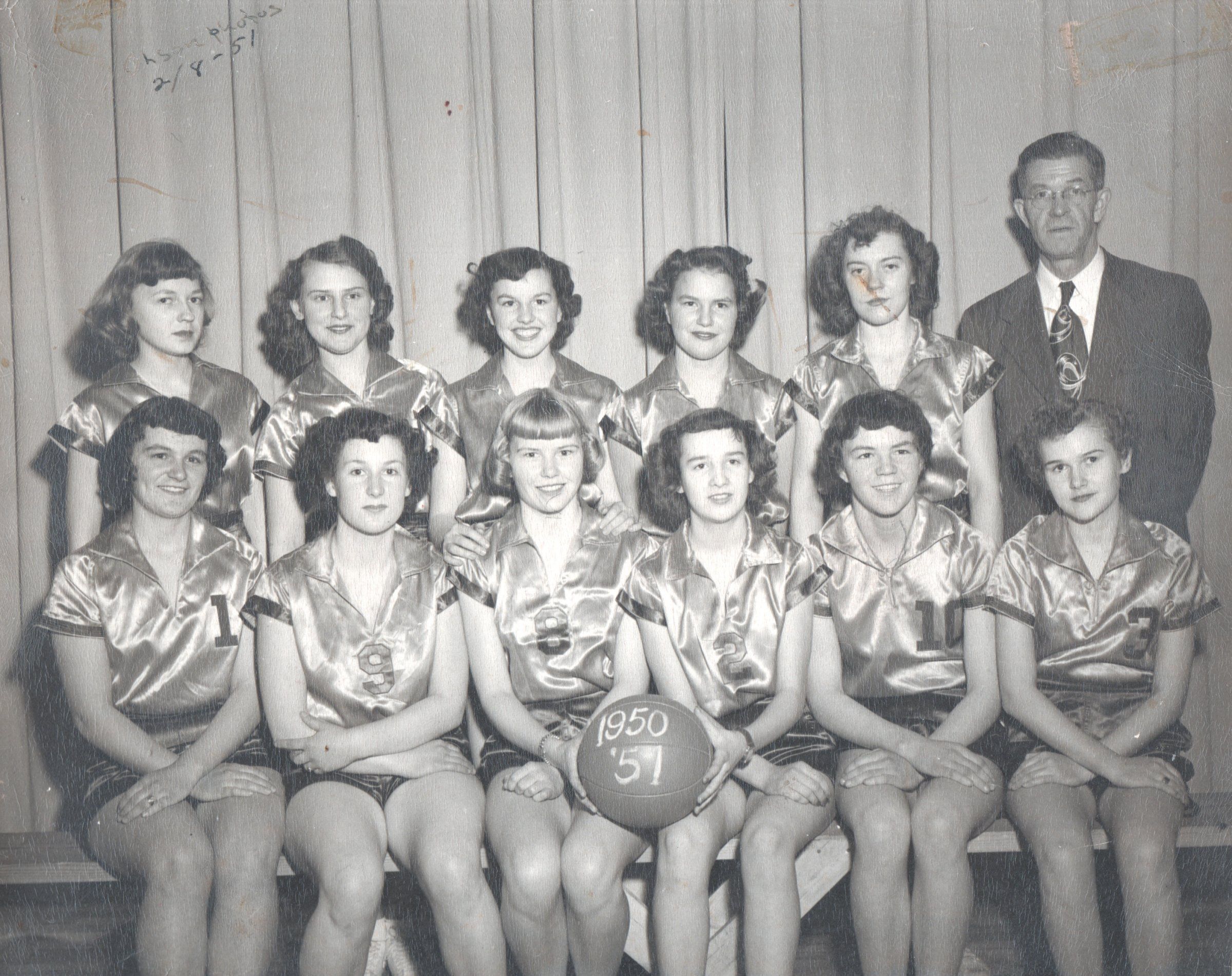 This photograph of the 1950-51 Caledonia High School girls' basketball team was taken on 8 February 1951 by Olson Photo, Hillsboro, Traill County, ND. Team members include, front, left-to-right: Janet Peckham, Mary Vettel, Geraldine Anderson, Patsy Cotton, Nancy Peckham and Gwen Wright; back, left-to-right: Carol Braseth, Yvonne Koval, Shirley Stigen, Jean Stigen, Roberta Wright and Coach Peckham.