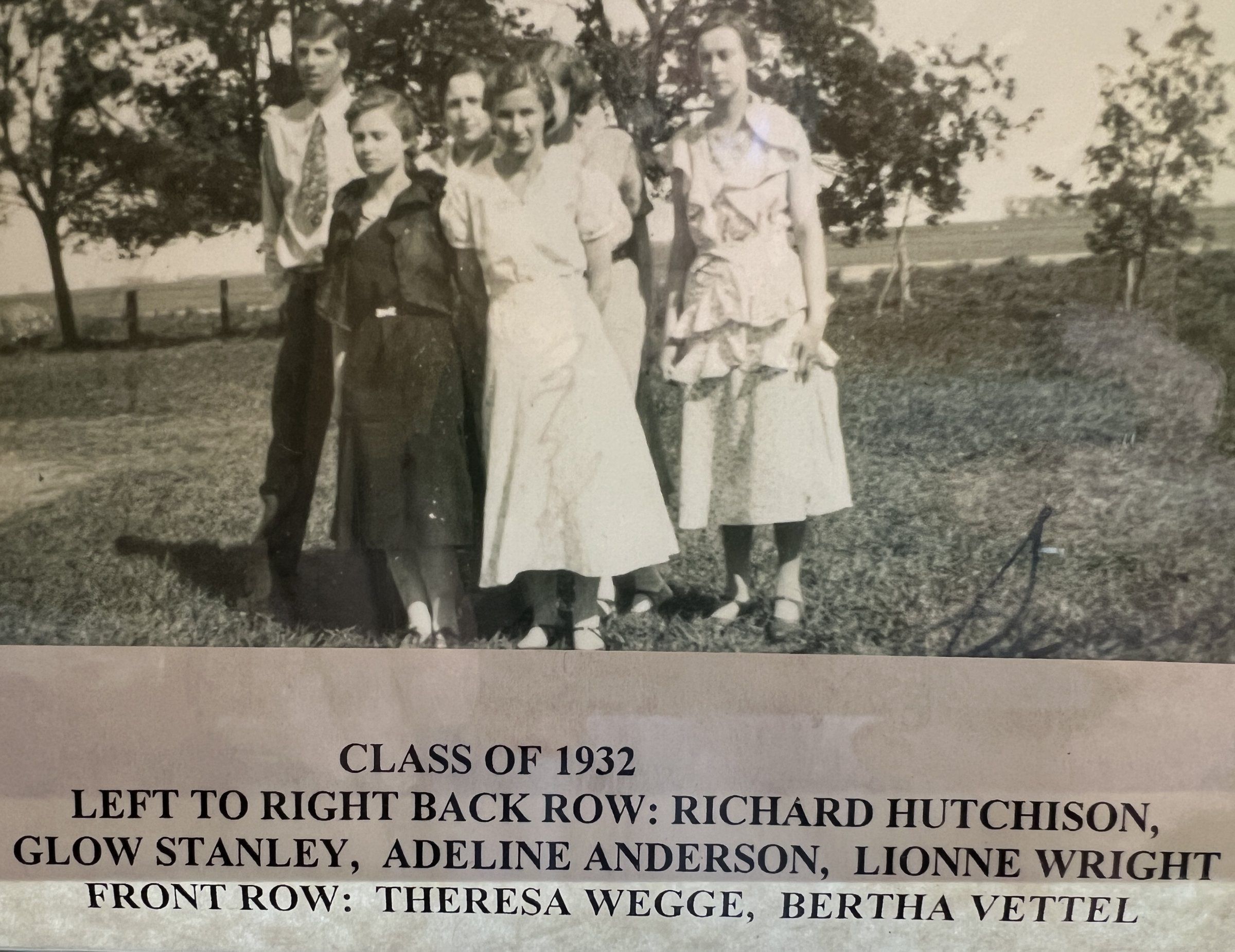 This photograph of the Caledonia High School Class of 1932 was taken by Olson Photo, Hillsboro, Traill County, ND. In the back row, left to right: Richard Hutchinson, Glow Stanley, Adeline Anderson and Lionne Wright. In the front row, left to right: Theresa Wegge and Bertha Vettel.