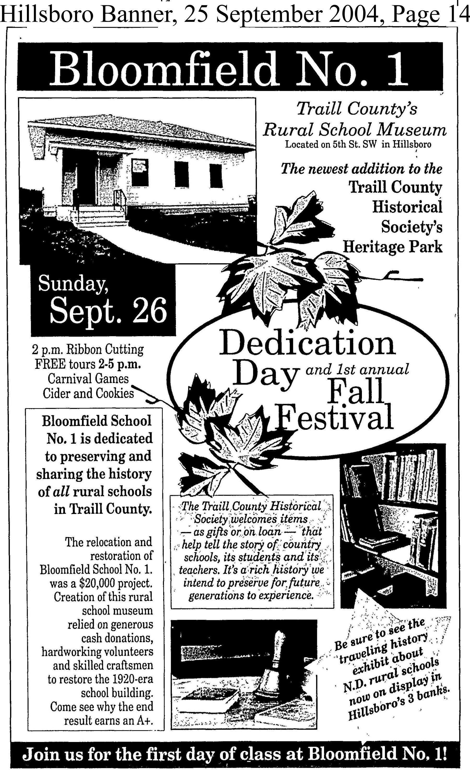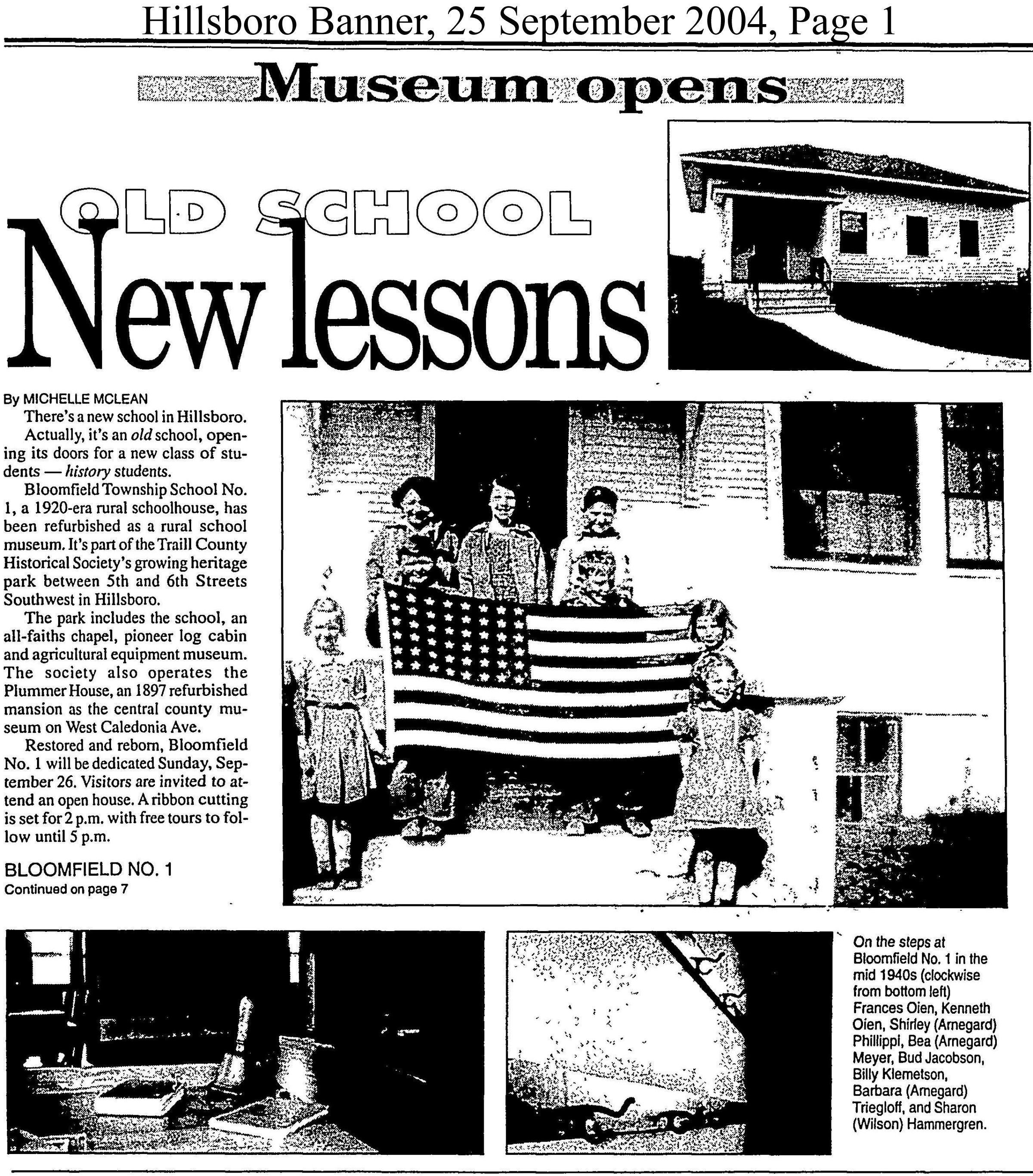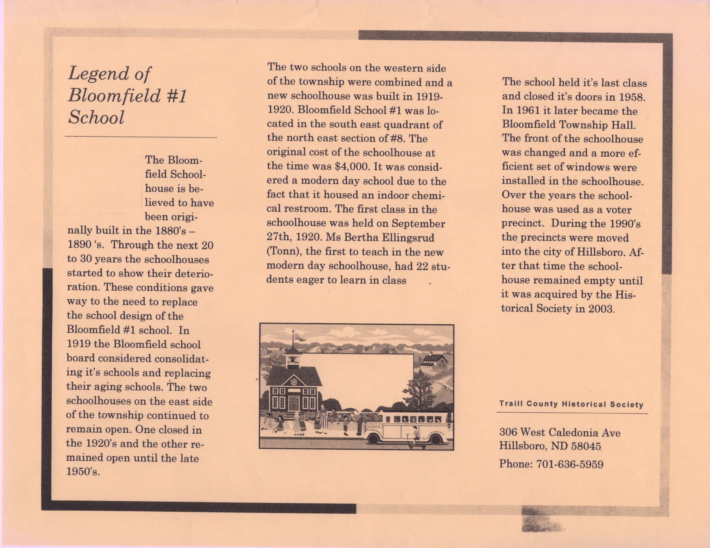 The TCHS moved the Bloomfield No. 1 school building to its Pioneer Museum grounds in Hillsboro where it was restored to serve as an example of the many one-room rural schools that once were in Traill County. Relocation and restoration were described in 2004 news reports in the Hillsboro Banner and Traill County Tribune (see articles).