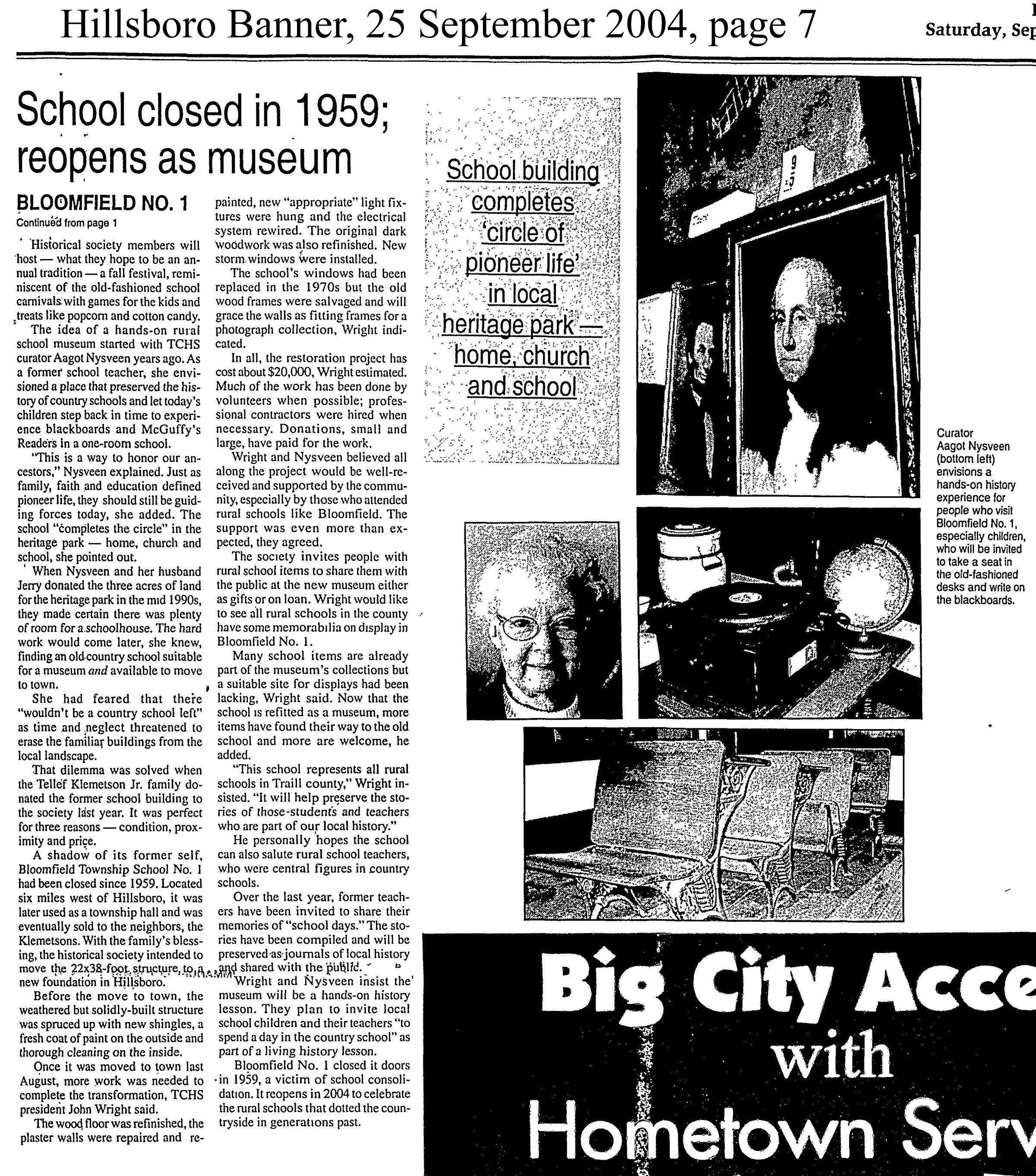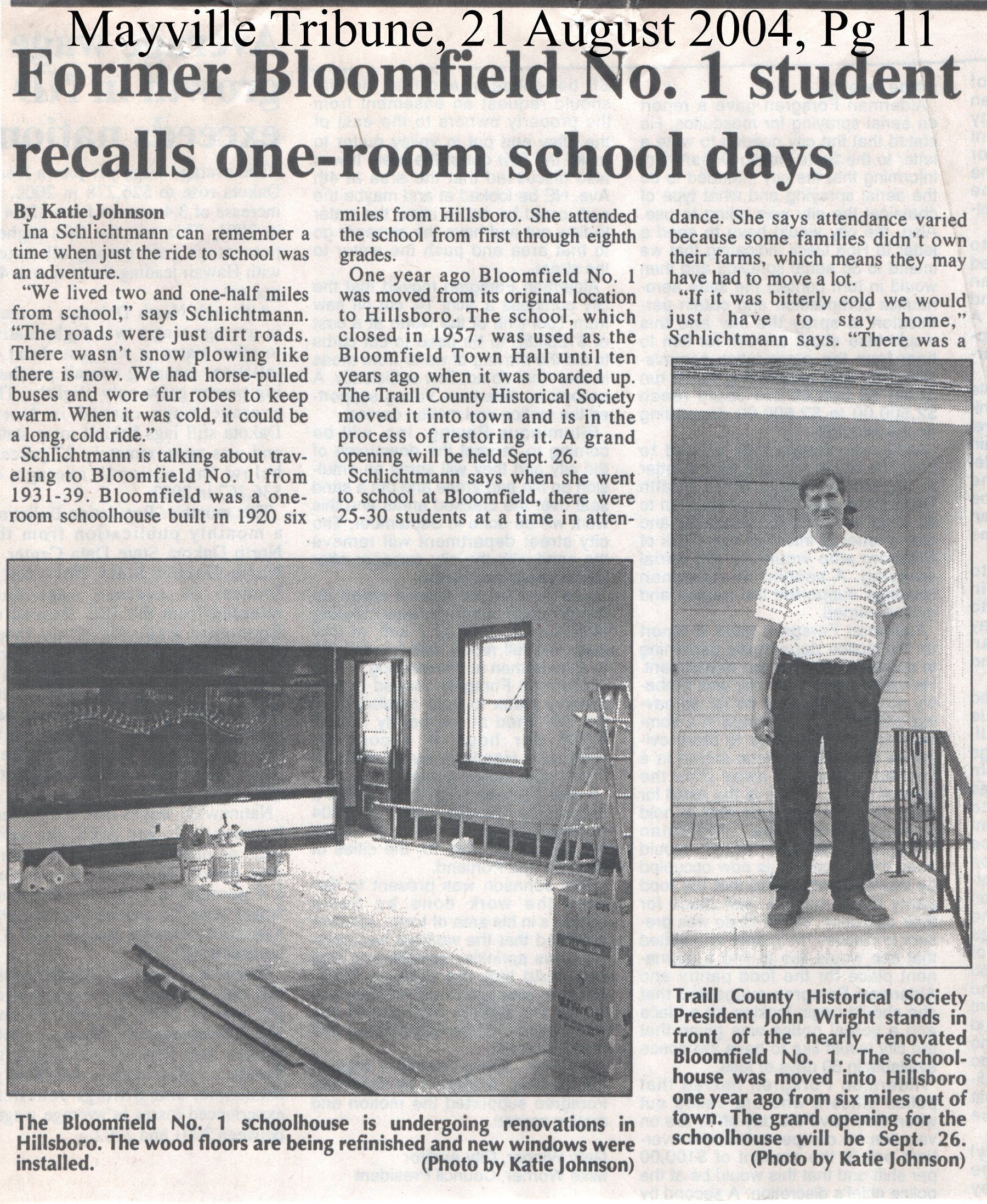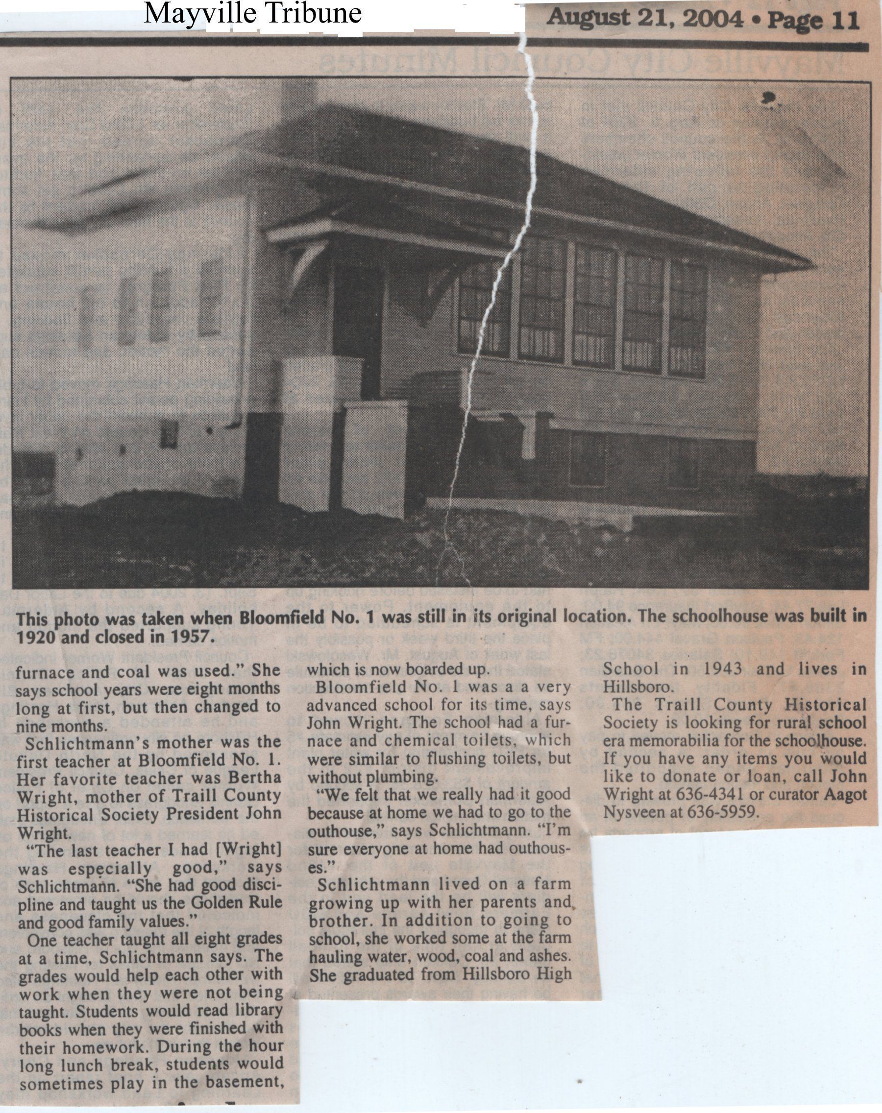 The TCHS moved the Bloomfield No. 1 school building to its Pioneer Museum grounds in Hillsboro where it was restored to serve as an example of the many one-room rural schools that once were in Traill County. Relocation and restoration were described in 2004 news reports in the Hillsboro Banner and Traill County Tribune (see articles).