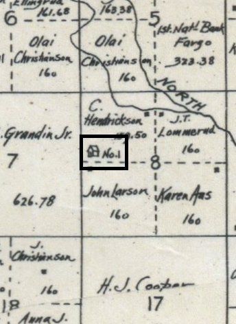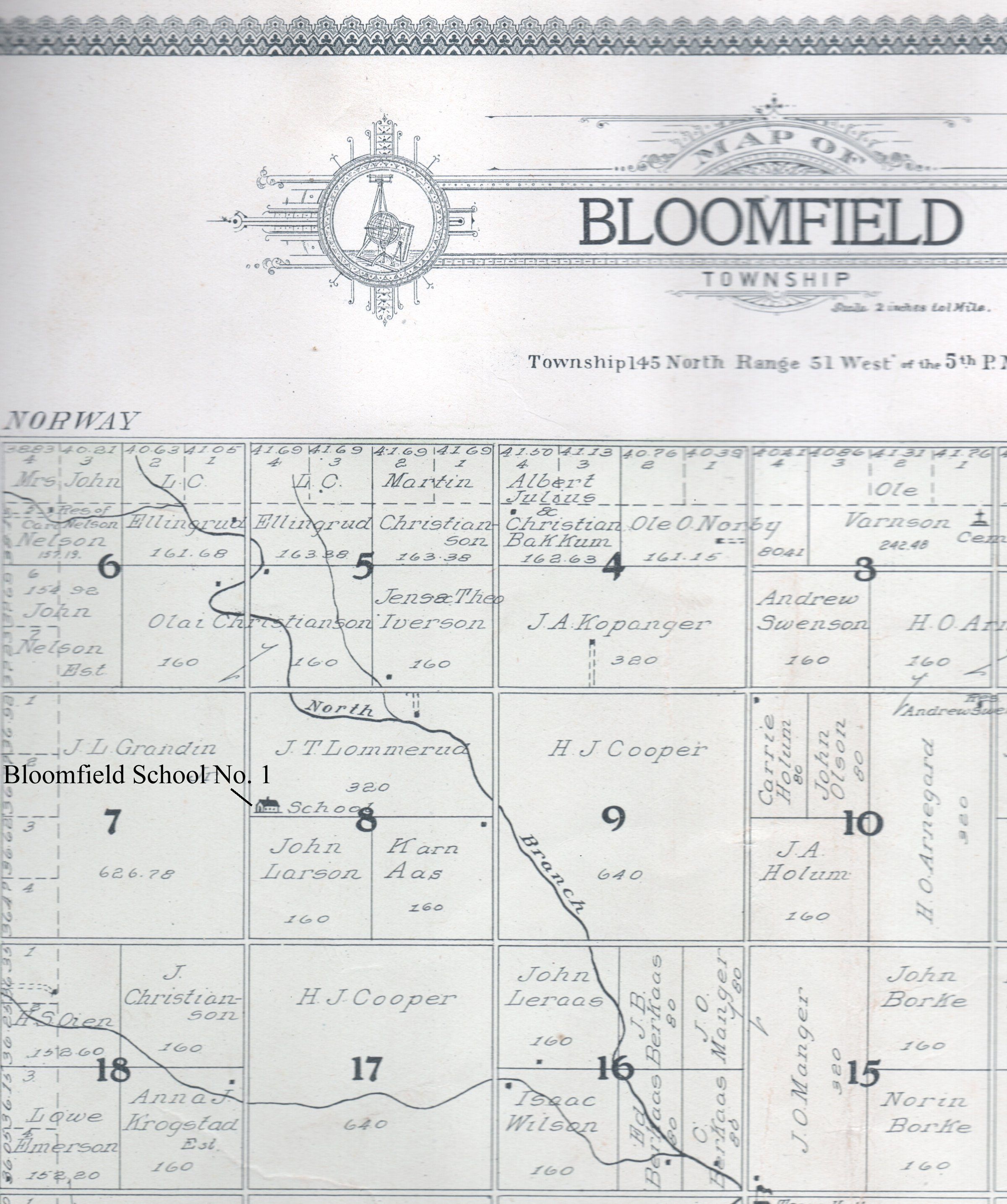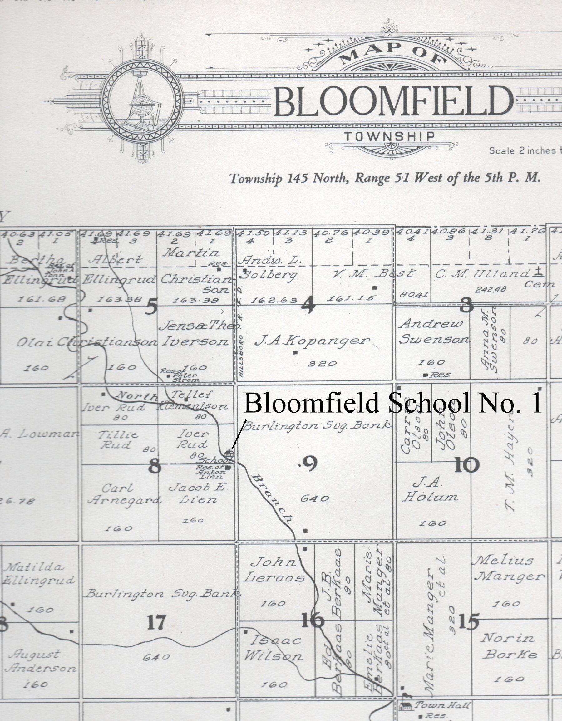 Bloomfield School No. 1 was originally located in the NW Qtr. of Sect. 8 in Bloomfield Township, as illustrated in a 1900 map (see 1900 map) and in the1909 Standard Atlas for Traill County (see 1909 map). Five years later, in 1919, the Bloomfield Township School Board combined the two schools on the western side of the township into a new Bloomfield No. 1 school built in the SE Qtr. of Sect. 8, as shown in the 1927 Standard Atlas of Traill County (see 1927 map). This school held classes for almost 40 years, closing in 1958. The building served as a Township Hall until the 1990s. The Bloomfield No. 1 schoolhouse was acquired by the Traill County Historical Society (see handout).