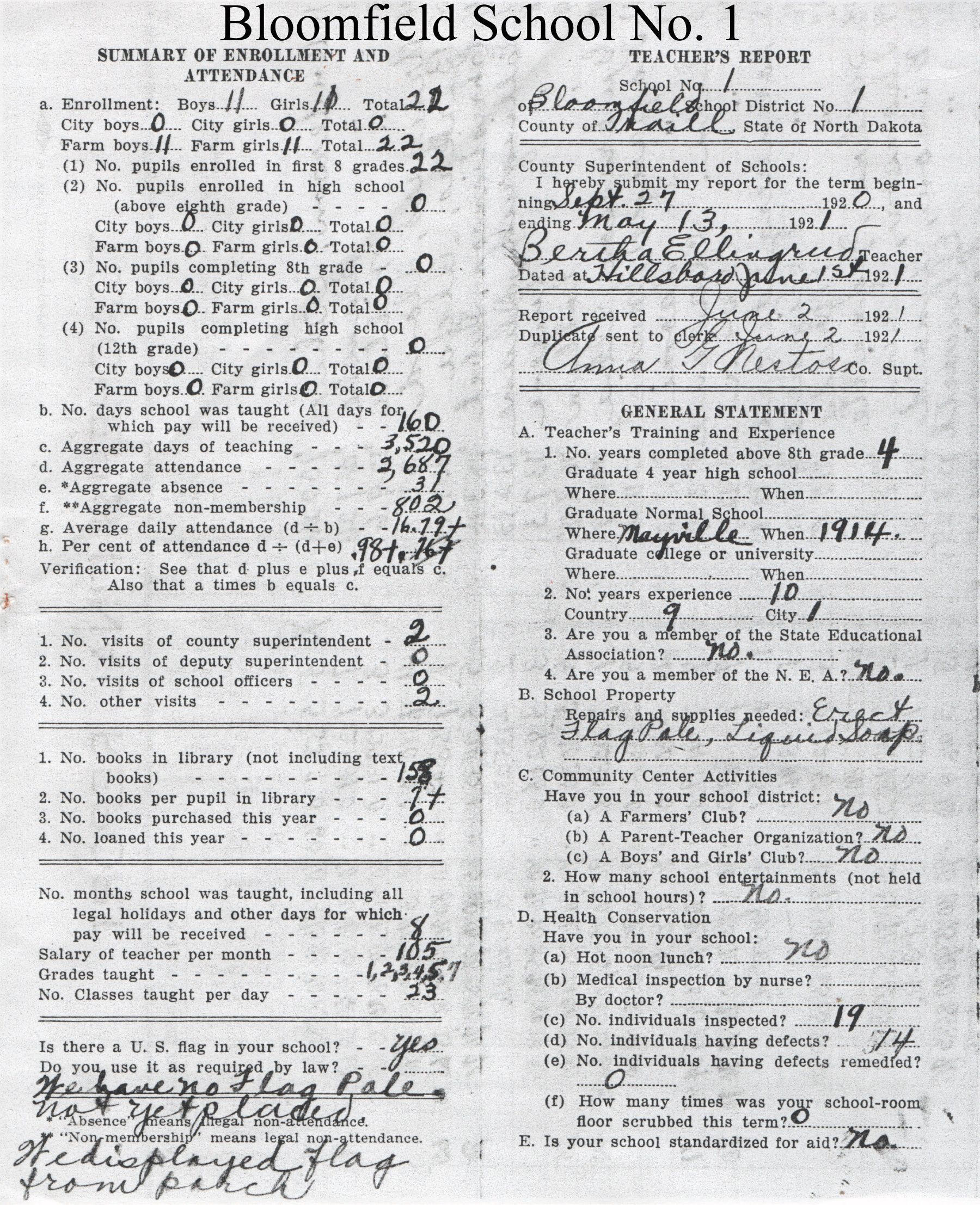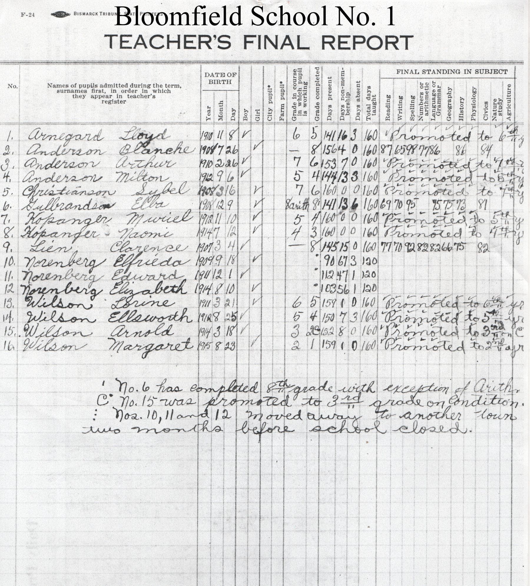 On 13 May 1921, Bloomfield School No. 1 teacher Bertha Ellingrud reported attendances and studies pursued for 16 students, including Arthur Anderson, Blanche Anderson, Milton Anderson, Lloyd Arnegard, Sybel Christianson, Ella Gulbrandson, Muriel Kopanger, Naome Kopanger, Clarence Lien, Edward Norenberg, Elfrieda Norenberg, Elizabeth Norenberg, Arnold Wilson, Ellsworth Wilson, Lorine Wilson, and Margaret Wilson.Acquisition