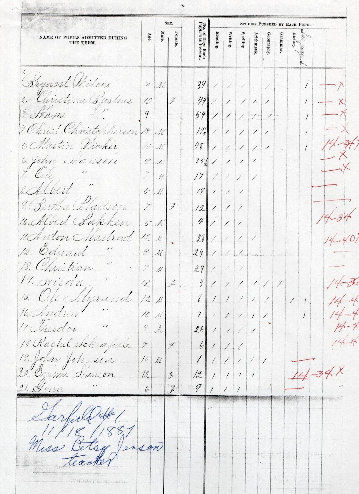 0n 27 May 1887, Garfield School No. 1 teacher Betsy Jenson reported attendances and studies pursued for 21 students: Albert Bakken, Christina Bjertnes, Hans Bjertnes, Christ Christopherson, Albert Hanson, Emma Hanson, Gina Hanson, John Hanson, Ole Hanson, John Johnson, Anton Mastrud, Christian Mastrud, Edward Mastrud, Hilda Mastrud, Andrew Myrand, Ole Myrand, Theodor Myrand, Bertha Pladson, Rachel Schrafale, Martin Vicker, and Bryant Wilcox.