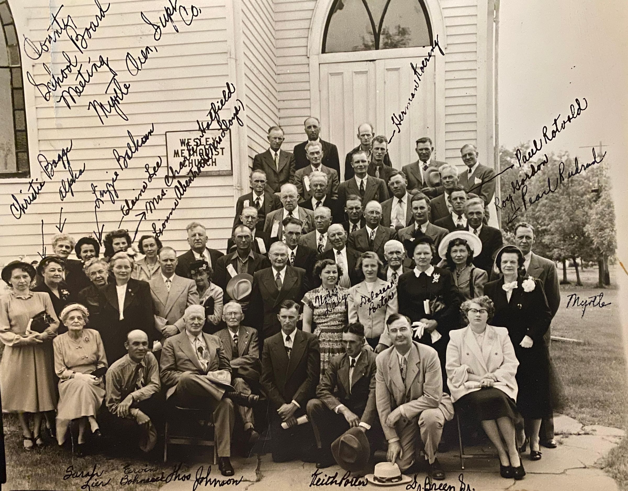 County School Board Meeting outside of Methodist Church, Hillsboro, ND. Some names listed on photo.Subject Person or Organization