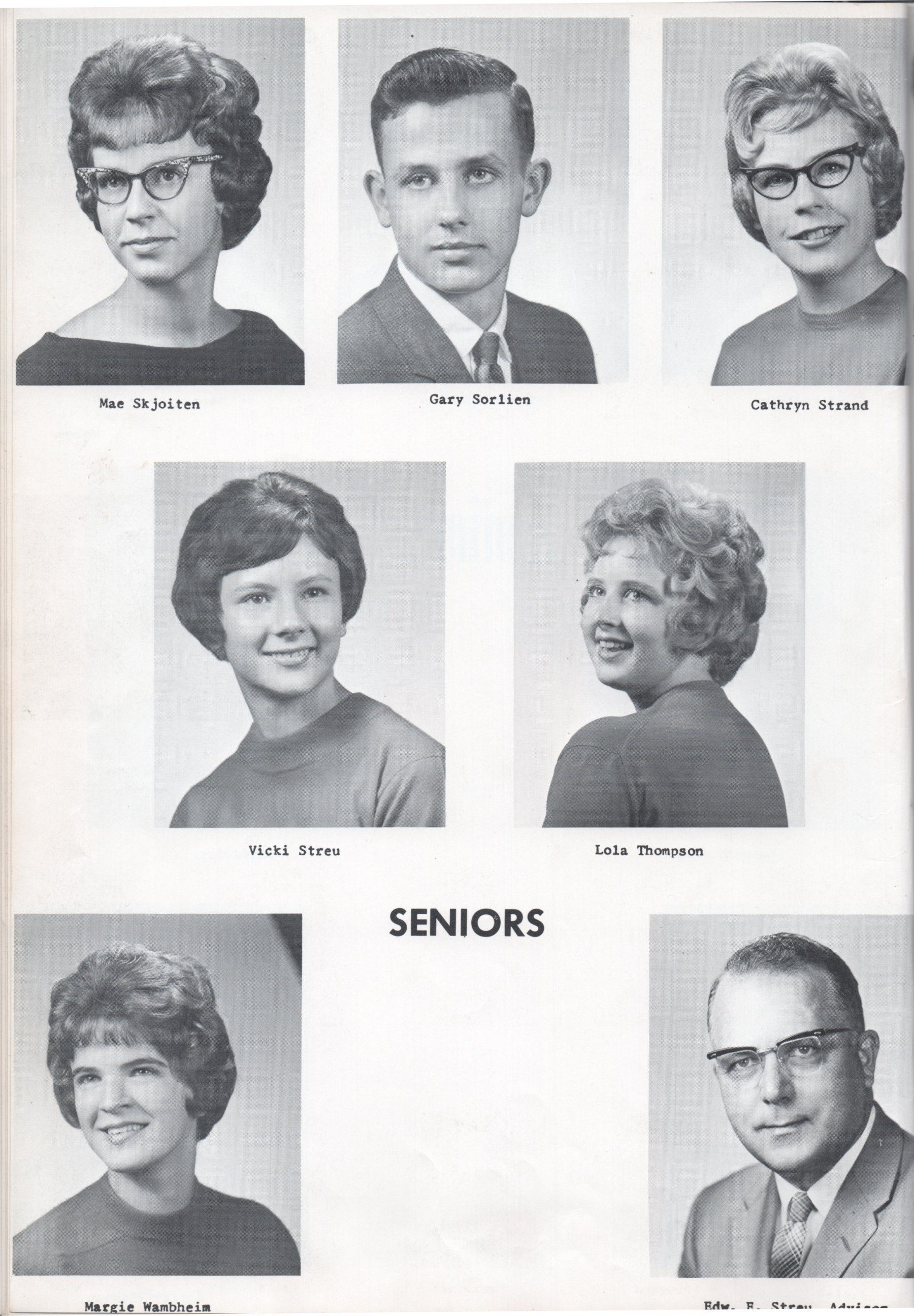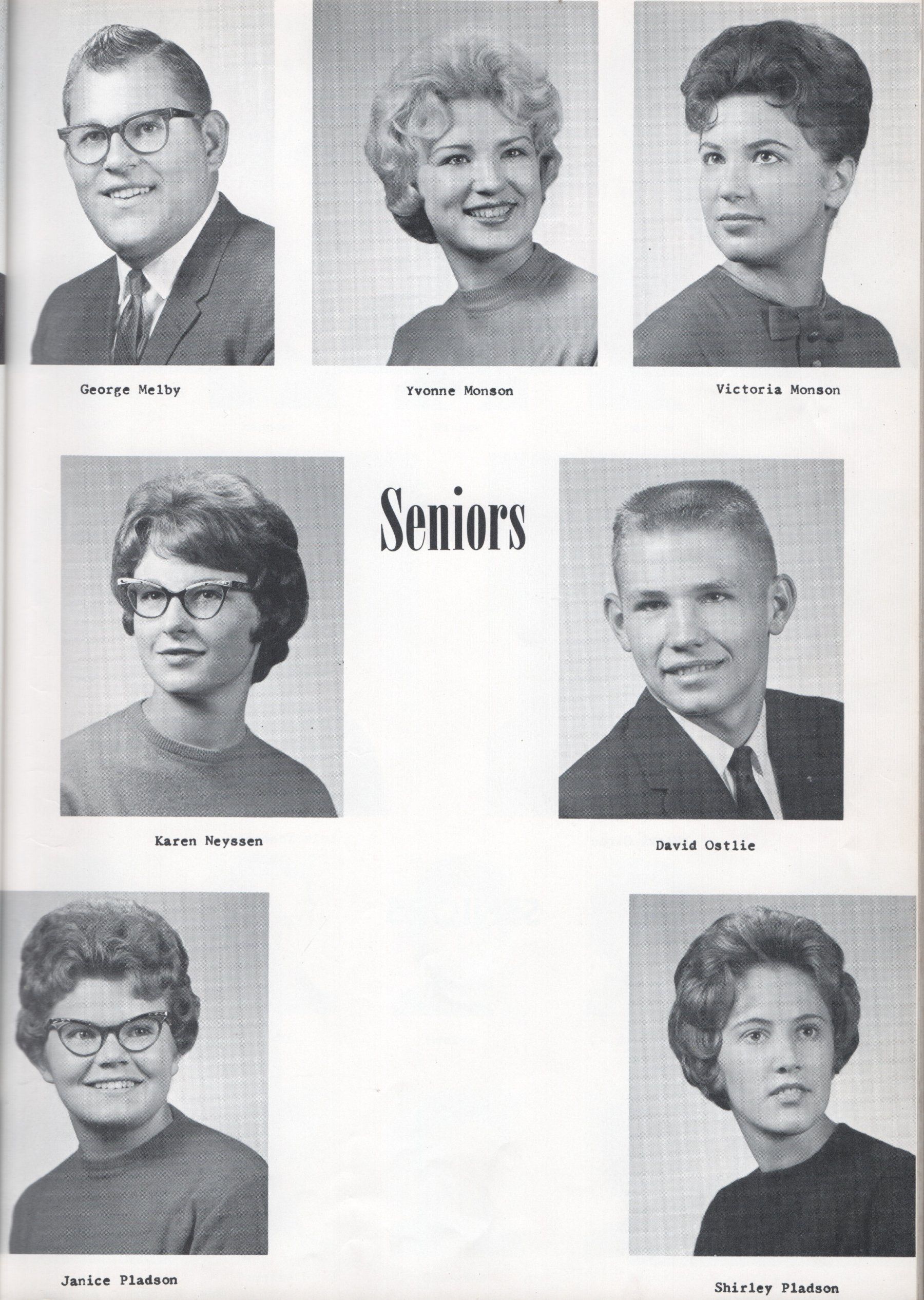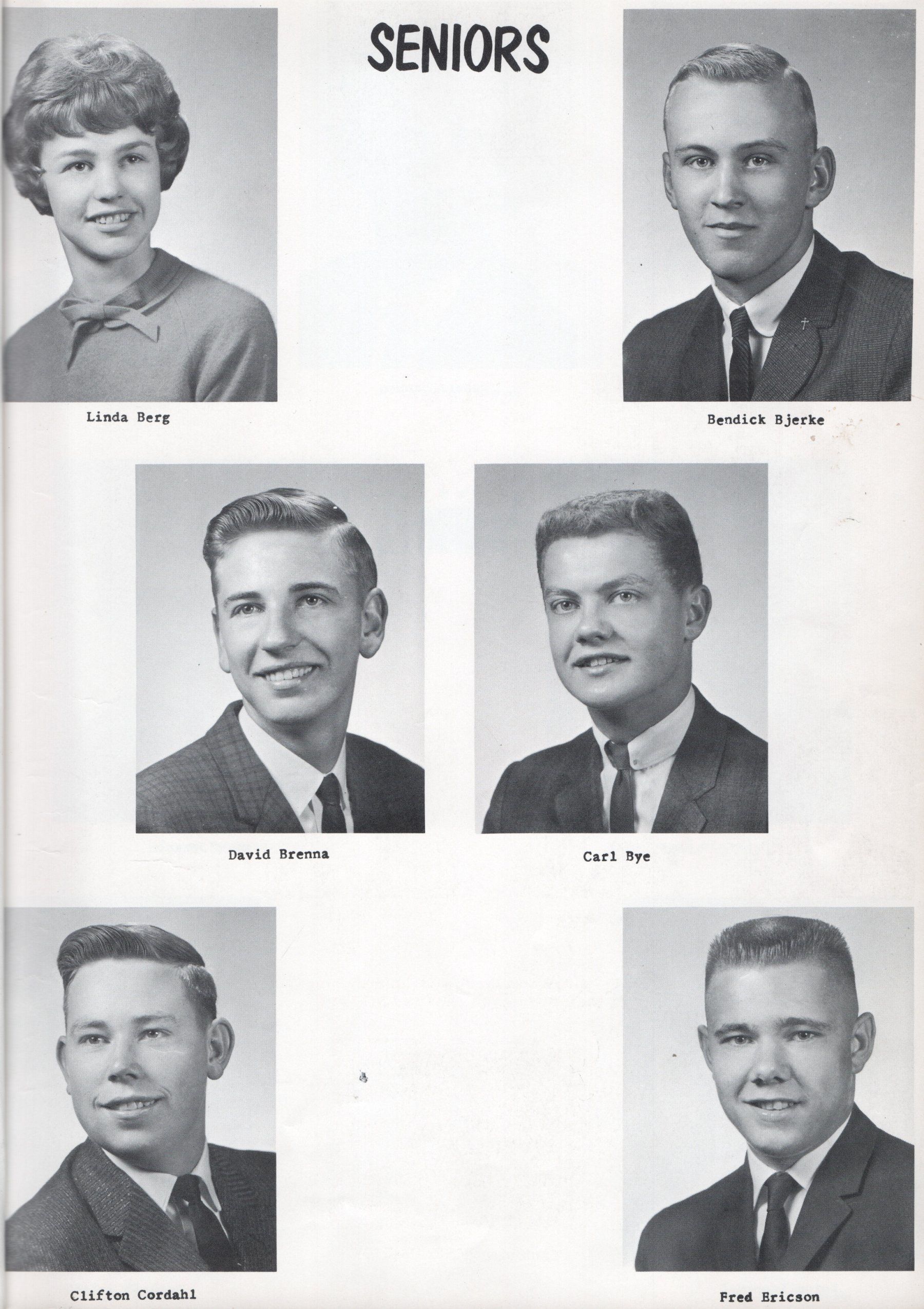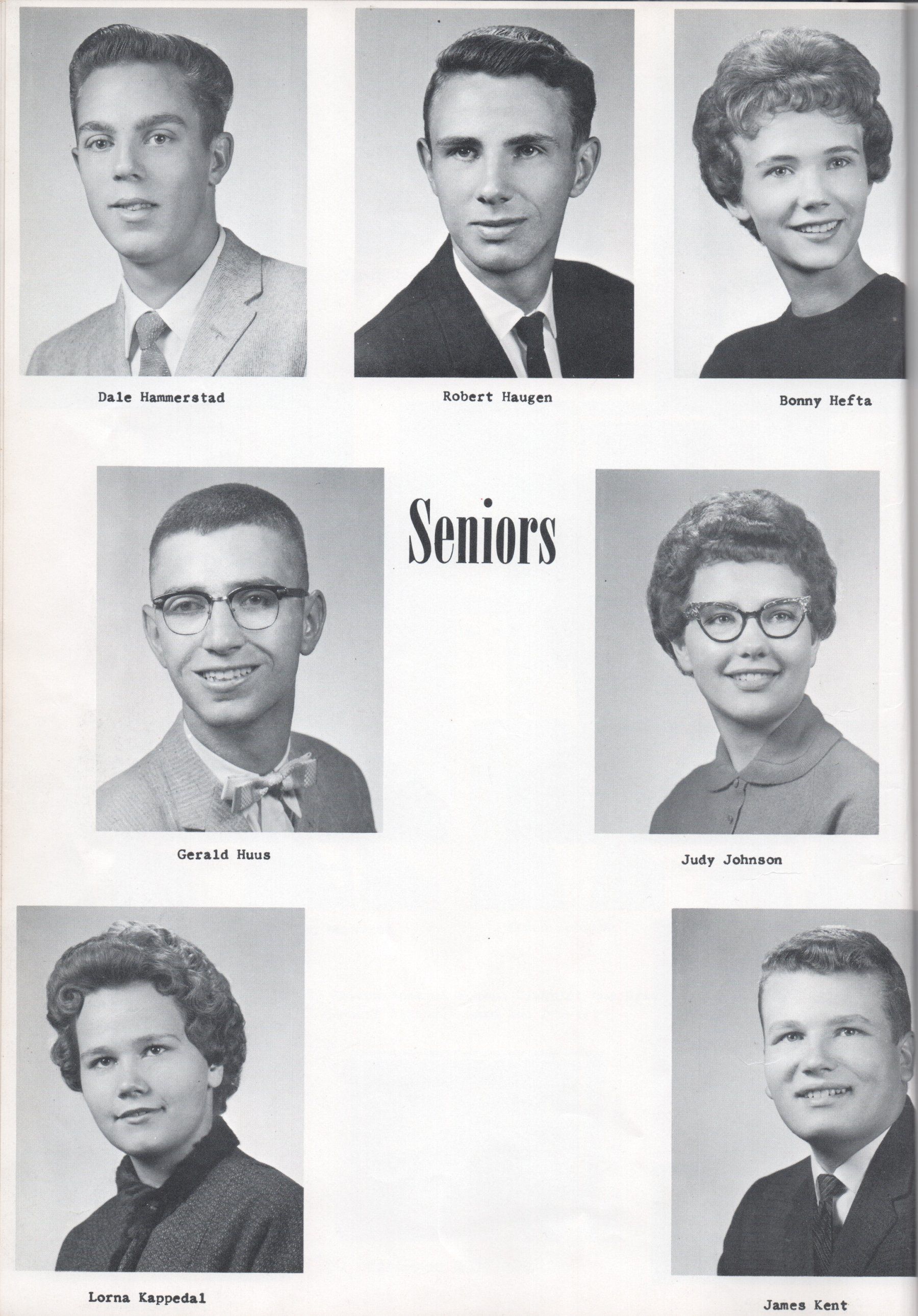 The 1962 yearbook includes four pages of Senior student photographs for: Linda Berg, Bendick Bjerke, David Brenna, Carl Bye, Clifton Cordahl, Fred Ericson, Dale Hammerstad, Robert Haugen, Bonny Hefta, Gerald Huus, Judy Johnson, Lorna Kappedal, James Kent, George Melby, Victoria Monson, Yvonne Monson, Karen Neyssen, David Ostlie, Janice Pladson, Shirley Pladson, Mae Skjoiten, Gary Sorlien, Cathryn Strand, Vicki Streu, Lola Thompson, and Margie Wambheim. Not pictured: Shirley Wenzel