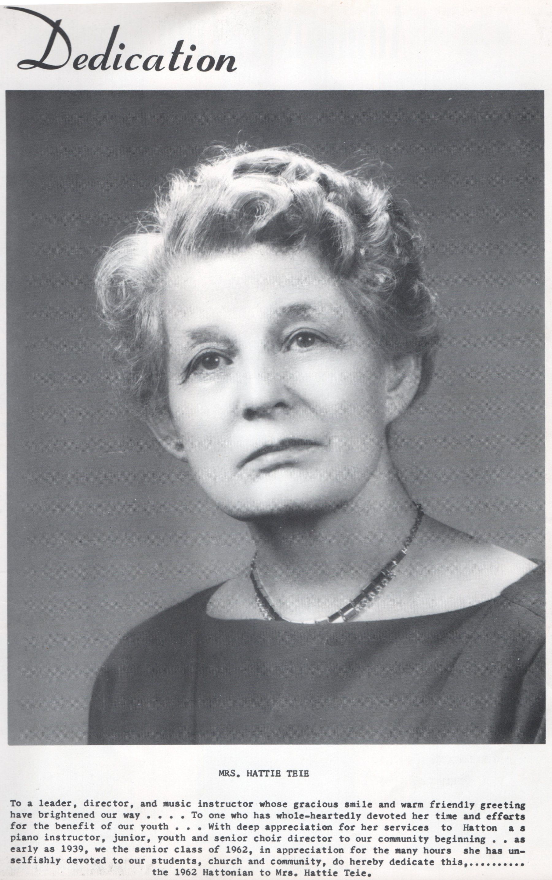The Class of 1962 Hatton High School Yearbook, titled Hattonian 62 was dedicated to. Mrs. Hattie Teie, music instructor.