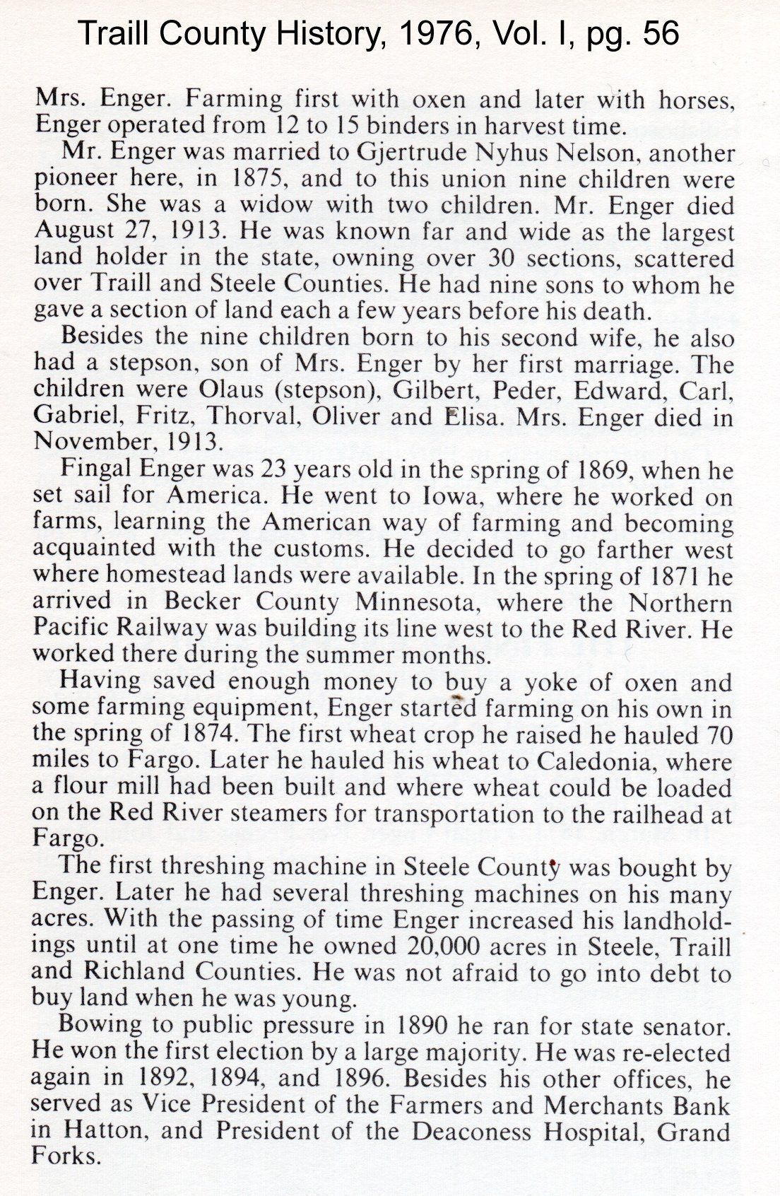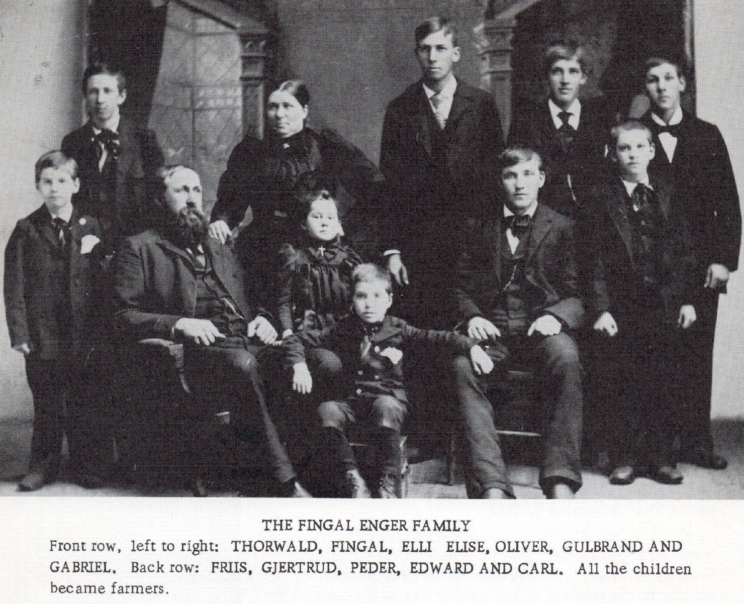 In 1875, Fingal Enger married Gjertrud Nyhus Nelson, a widow with a son, Olaus. Fingal and Gjertrud had nine children (photo, below), eight sons (Gilbert [Gulbrand], Peder, Edward, Carl, Gabriel, Fritz, Thorval, and Oliver) and one daughter (Elisa). Over time, Fingal Enger became one of the largest landholders in North Dakota, owning some 20,000 acres in Steele, Traill and Richland counties. He employed up to thirty men operating several threshing machines during harvest.