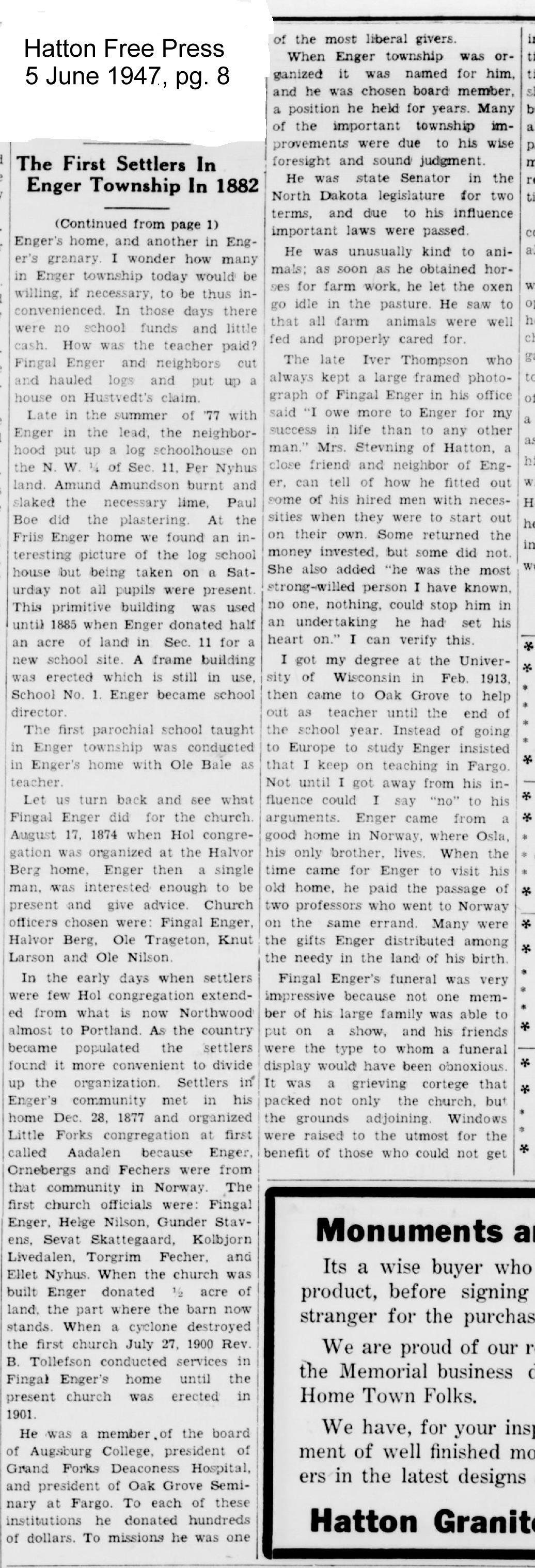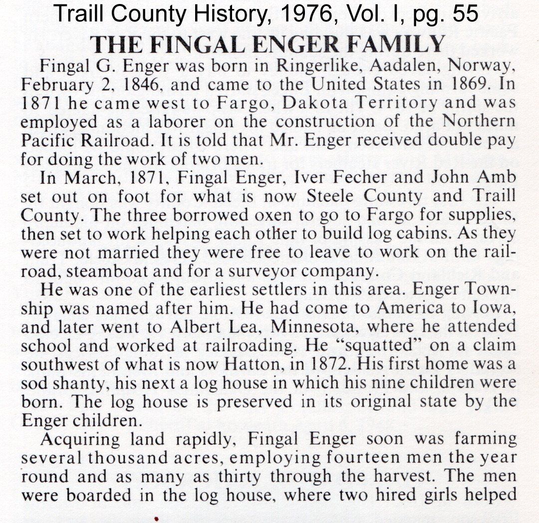 Fingal Enger was featured in as the "Goose River Giant" in an article written by Erling Rolfsrud in the fall edition of the 1971 North Dakota Horizons, a quarterly magazine. This article was reproduced in the 30 December 1971 issue of the Hatton Free Press newspaper (available online at ndarchives.historyarchives.online/home by searching for the Hatton Free Press newspaper and then for the name: Fingal Enger).