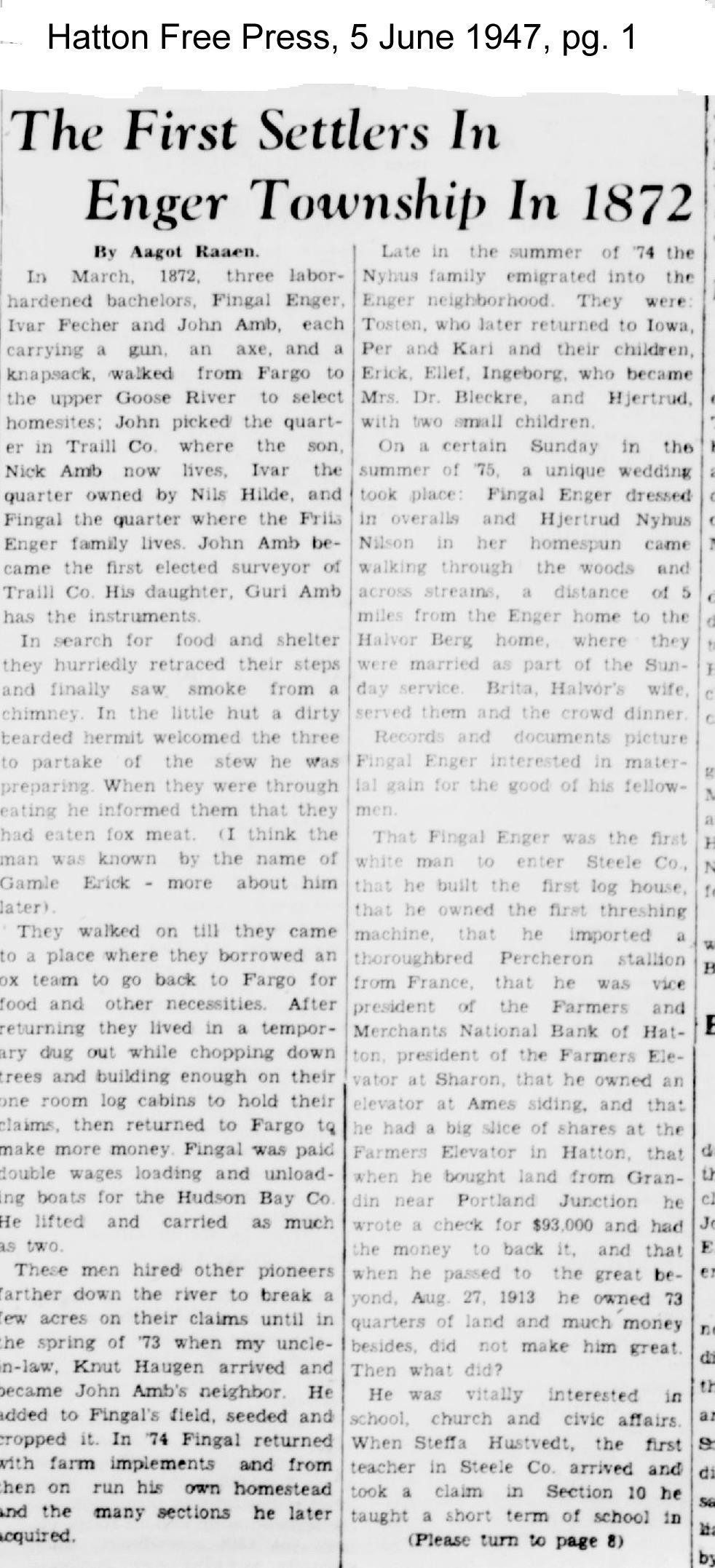 This Enger family history folder contains documents describing the life of Fingal Enger and his wife Gjertrud Nelson (photo, left). As described on pages 55 and 56 in Volume I of the Traill County History book published in 1976, and on pages 1 & 8 of the 5 June 1947 issue of the Hatton Free Press newspaper (see below), Fingal Enger came from Fargo on foot in March 1871 with John Amb and Iver Fecher to what is now Traill and Steele Counties. They were some of the earliest pioneers in the area.
