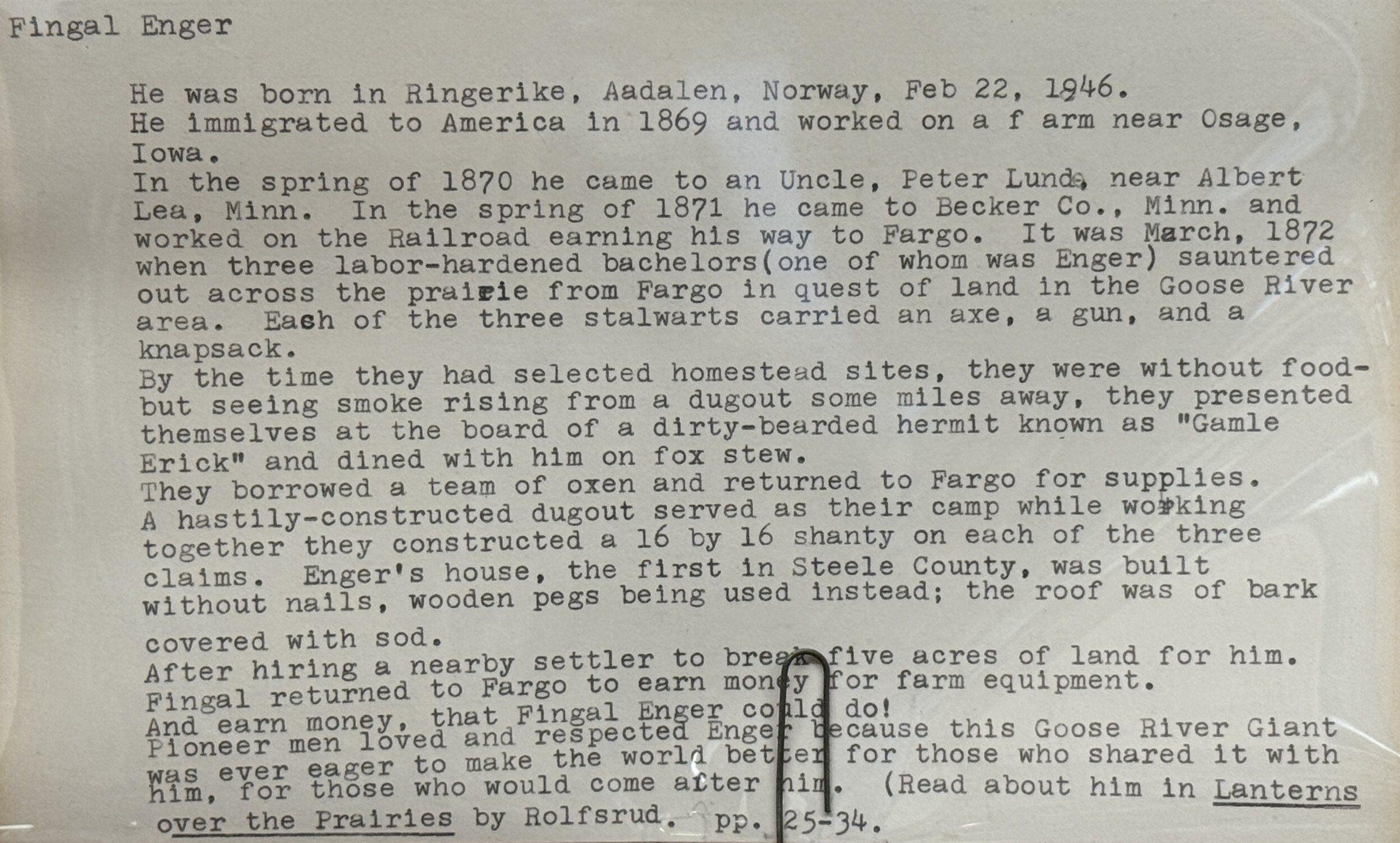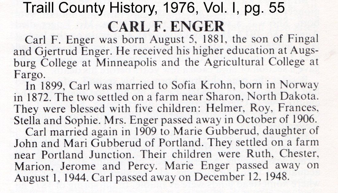 This Enger family history folder at the Plummer House Museum includes an Enger Family Book available for viewing. The folder also includes a Traill County History document briefly describing the life of one of Final and Gjertrud's sons, Carl Enger (see below).Acquisition