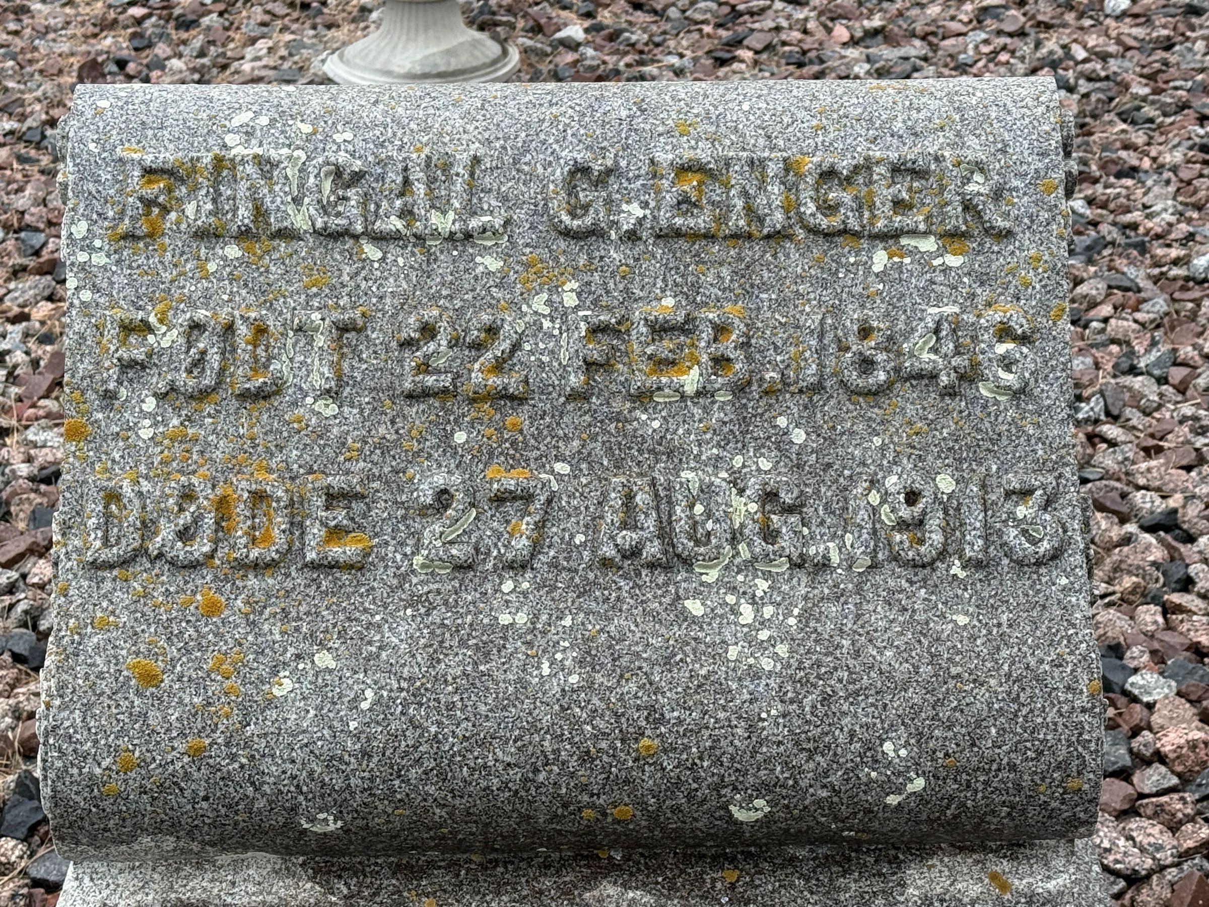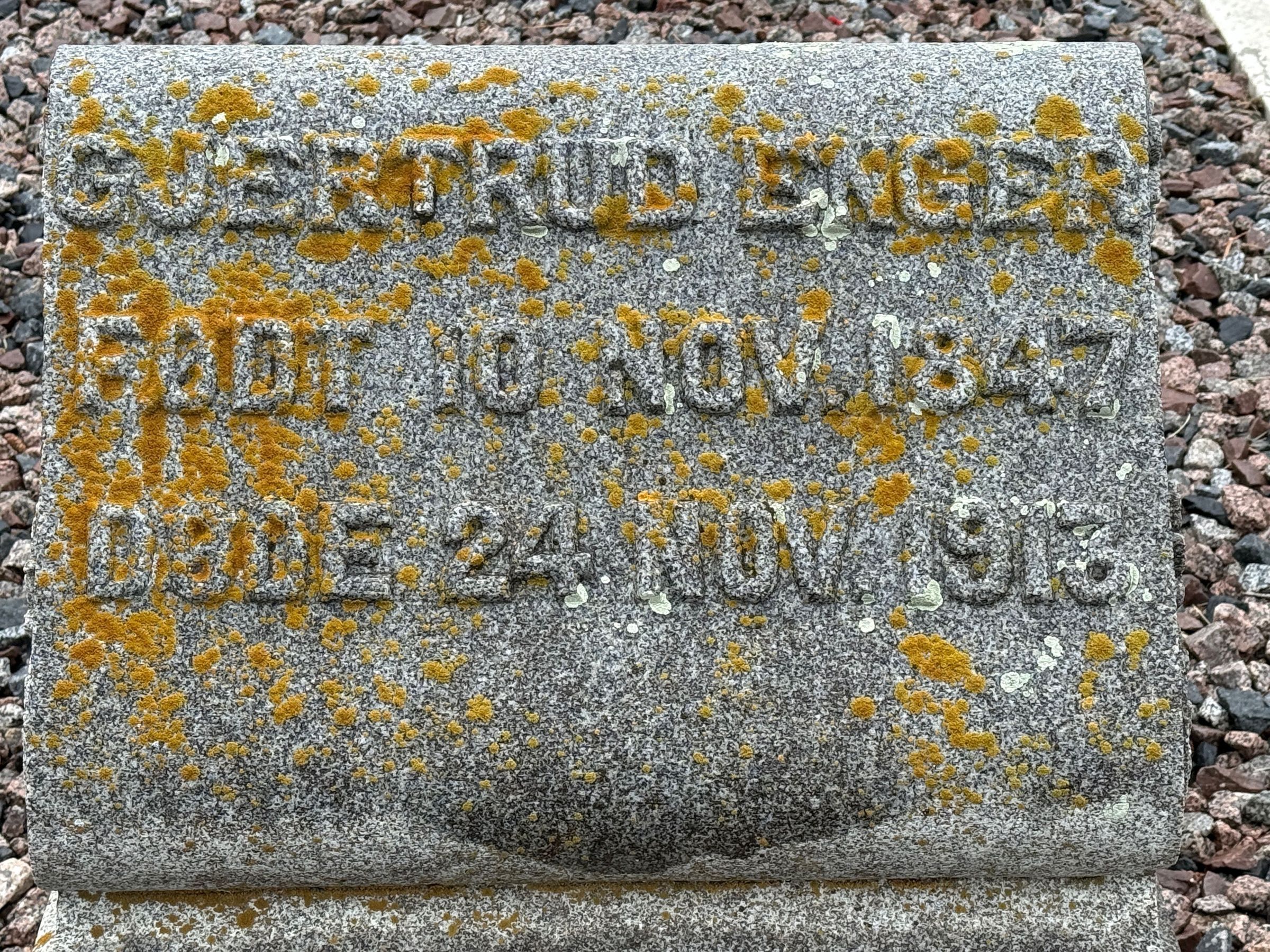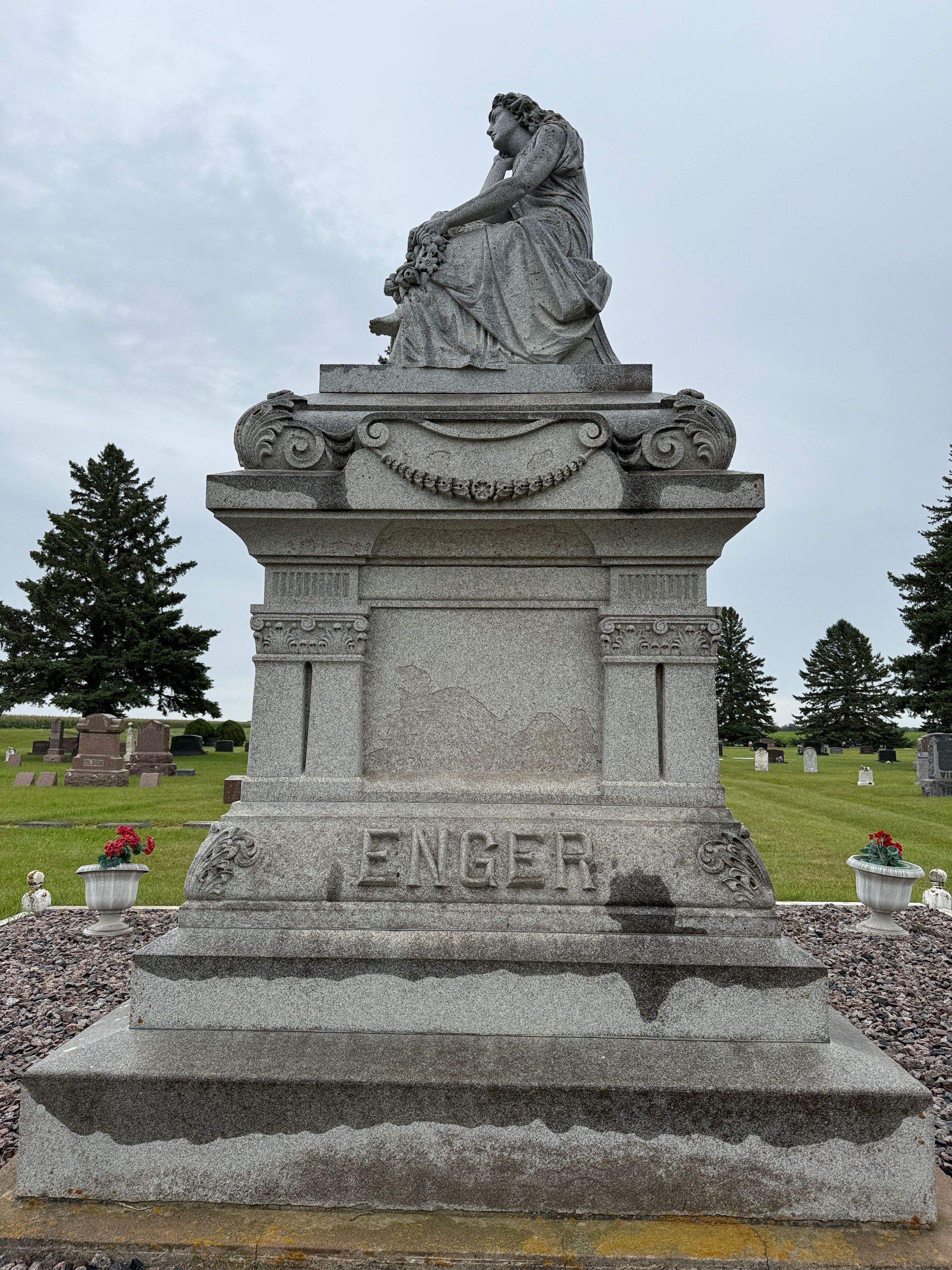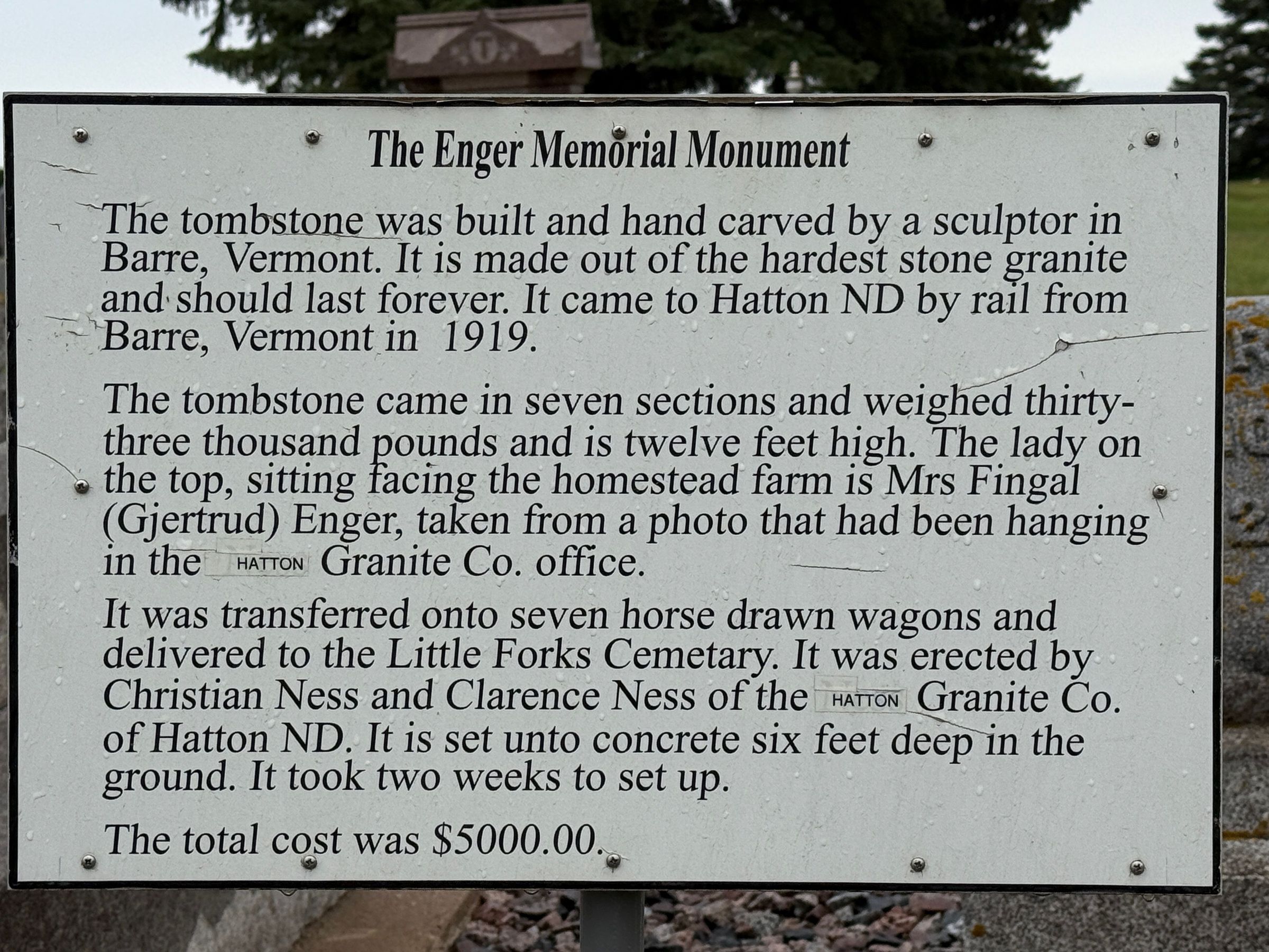 Fingal and Gjertrud (Nelson) Enger were buried in the cemetery of the Little Forks Lutheran Church located southwest of Hatton, ND, on land donated for the Church by Fingal Enger. In 1919, a hand-carved tombstone of granite from Vermont was erected at the cemetery as an Enger Memorial Monument (photo, below). A sign describing the monument is located at the monument (see below). Fingal Enger and Gjertrud (Nelson) Enger grave-marker by the monument (see below).