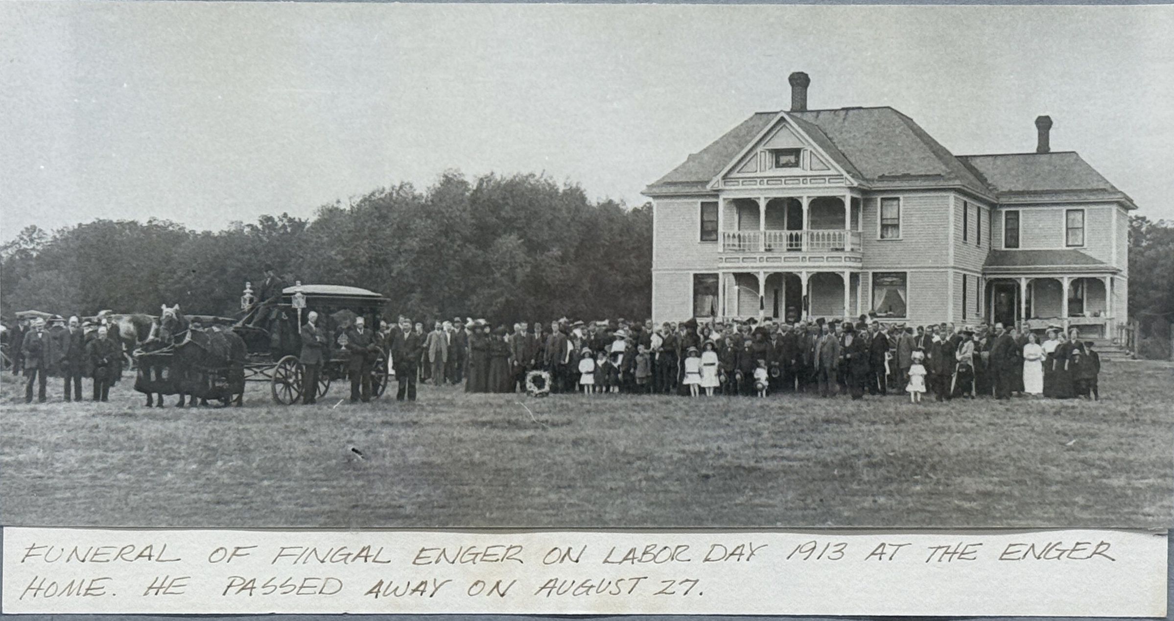 Fingal Enger passed away on 27 August 1913. A funeral was held at the Enger home (photo, below). Gjertrud (Nelson) Enger died in November 1913. They willed a section of land to each of their nine sons.