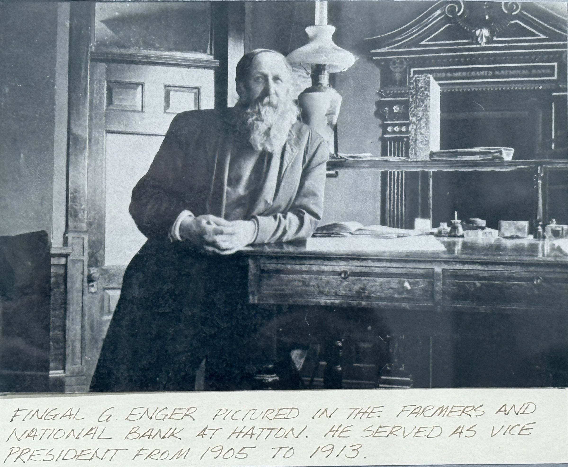 In 1890, Fingal Enger was elected State Senator, and served again in 1892, 1894 and 1896. He also served as Vice President of the Farmers & National Bank from 1905 to 1913 (photo, below). Enger Township in Steele County, west of and adjacent to Viking Township in Traill County, was named in honor of Fingal Enger.