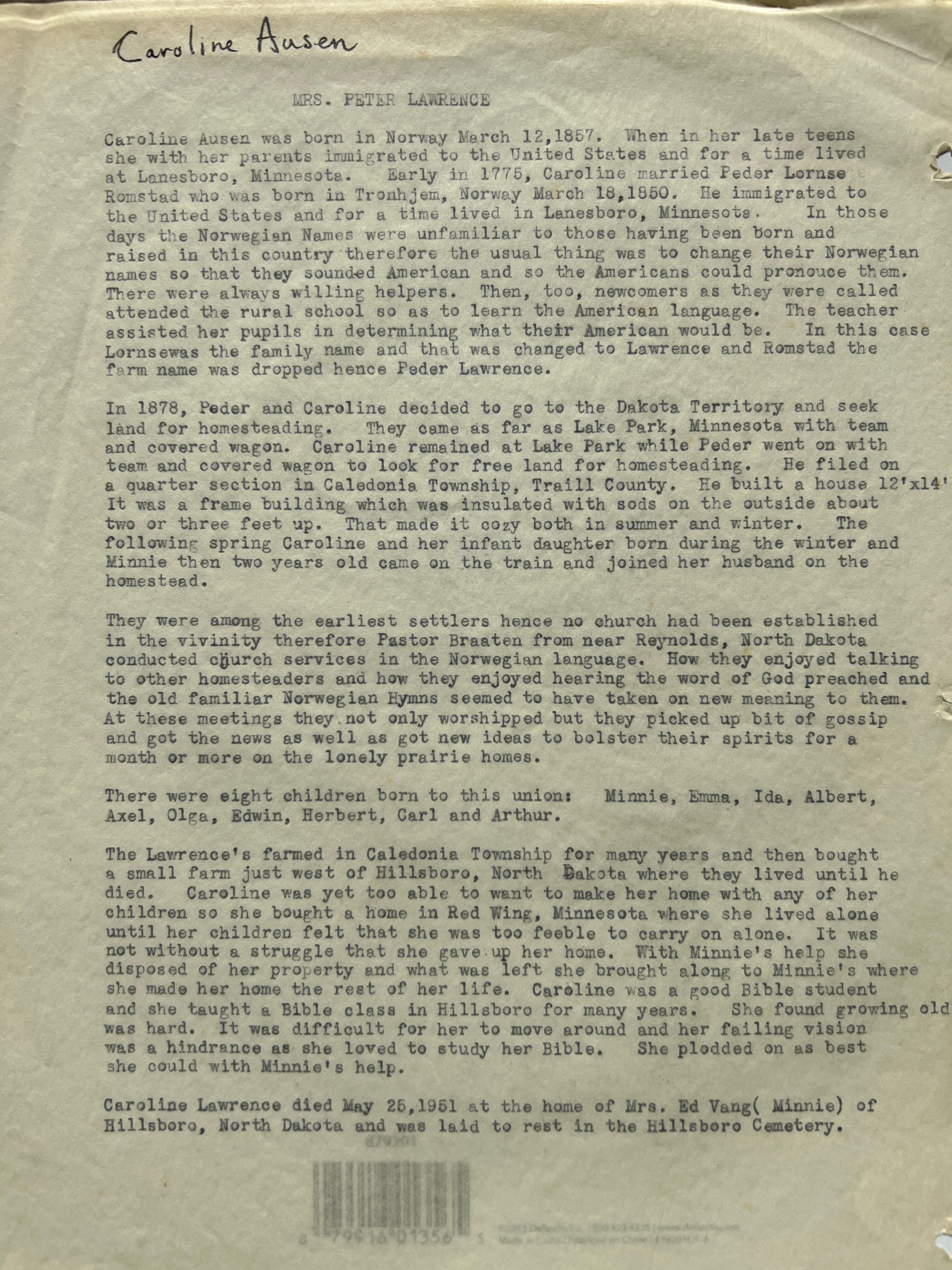 A one-page account of the life of Caroline Ausen, and her husband Peter Lawrence, who came from Norway and Minnesota to homesteaded by Caledonia in 1878, and later bought a farm just west of HIllsboro. They had eight children, Minnie, Emma, Ida, Albert, Axel, Olga, Edwin, Herbert, Carl and Arthur Lawrence.Cataloged By