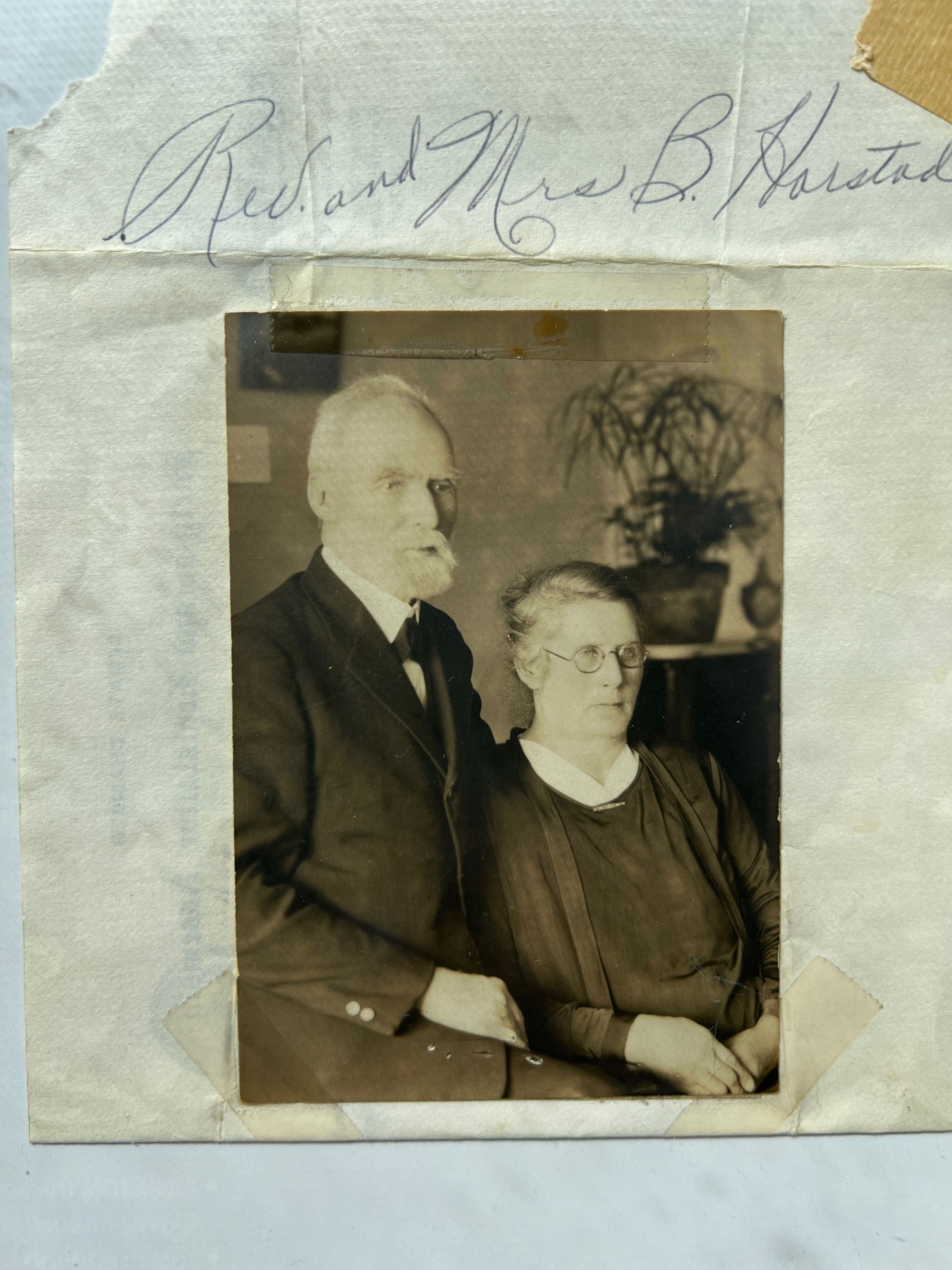 This file contains a photograph of Rev. and Mrs. B. J. Harsted owned by the late Leonard Beal of Hillsboro. Rev. Harsted helped organize and served as the first pastor of Highland Lutheran Church near Buxton, ND, as described on page 44 of the Buxton Centennial (1880-1980) book.Cataloged By