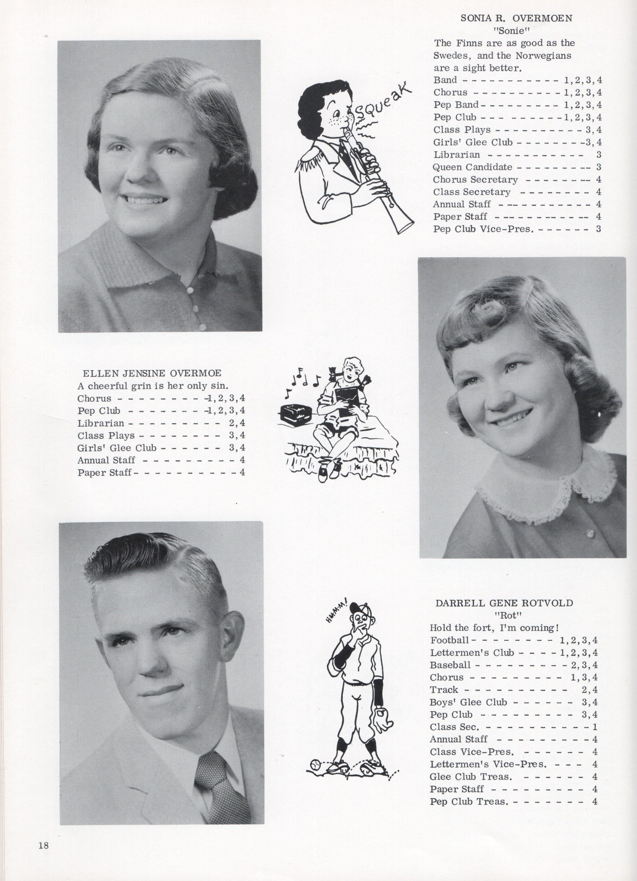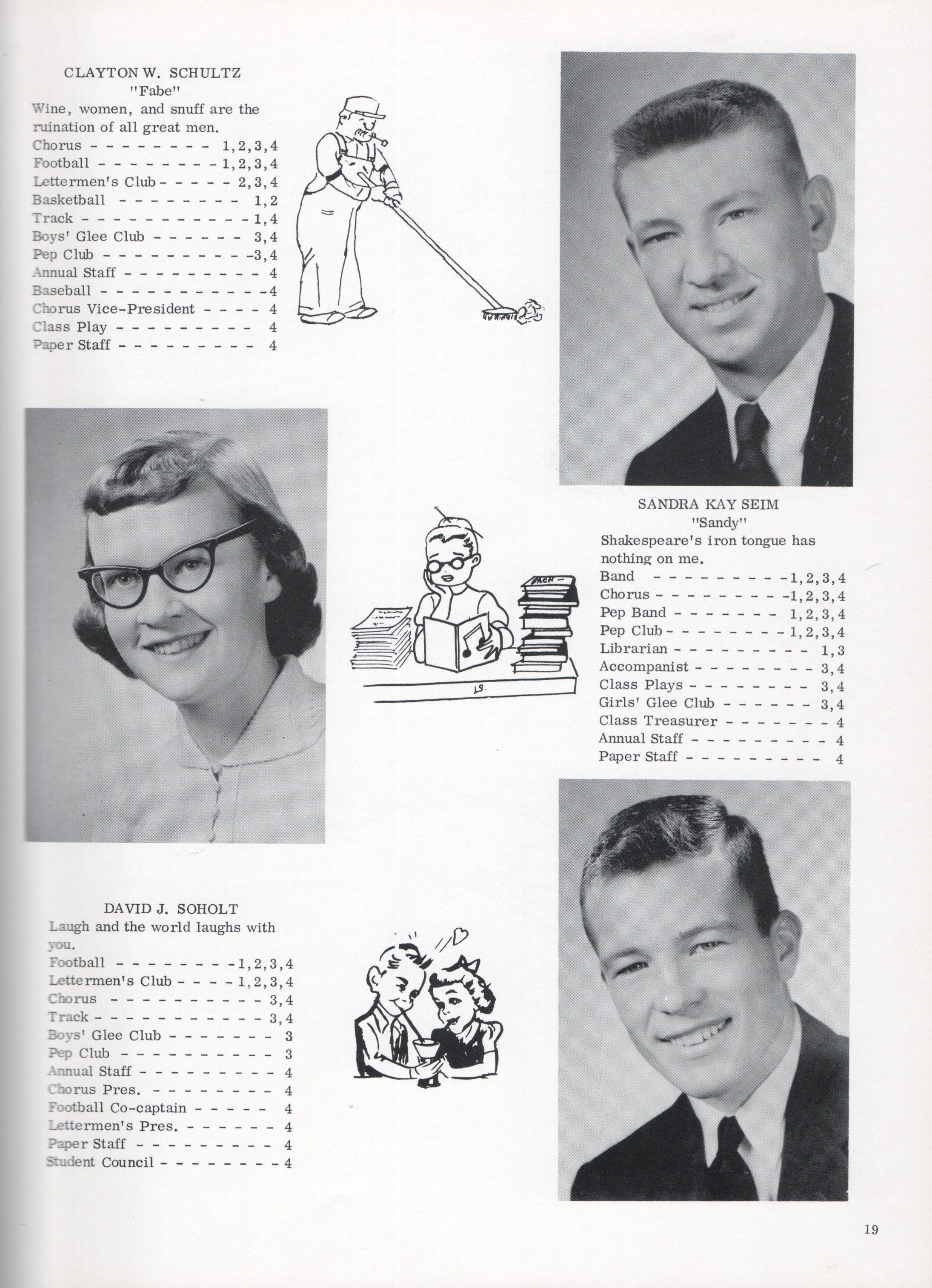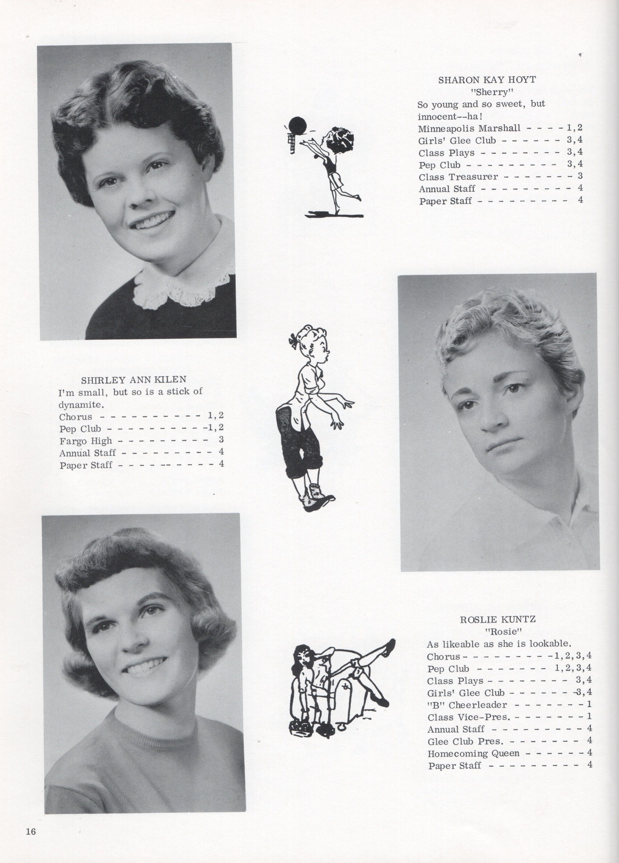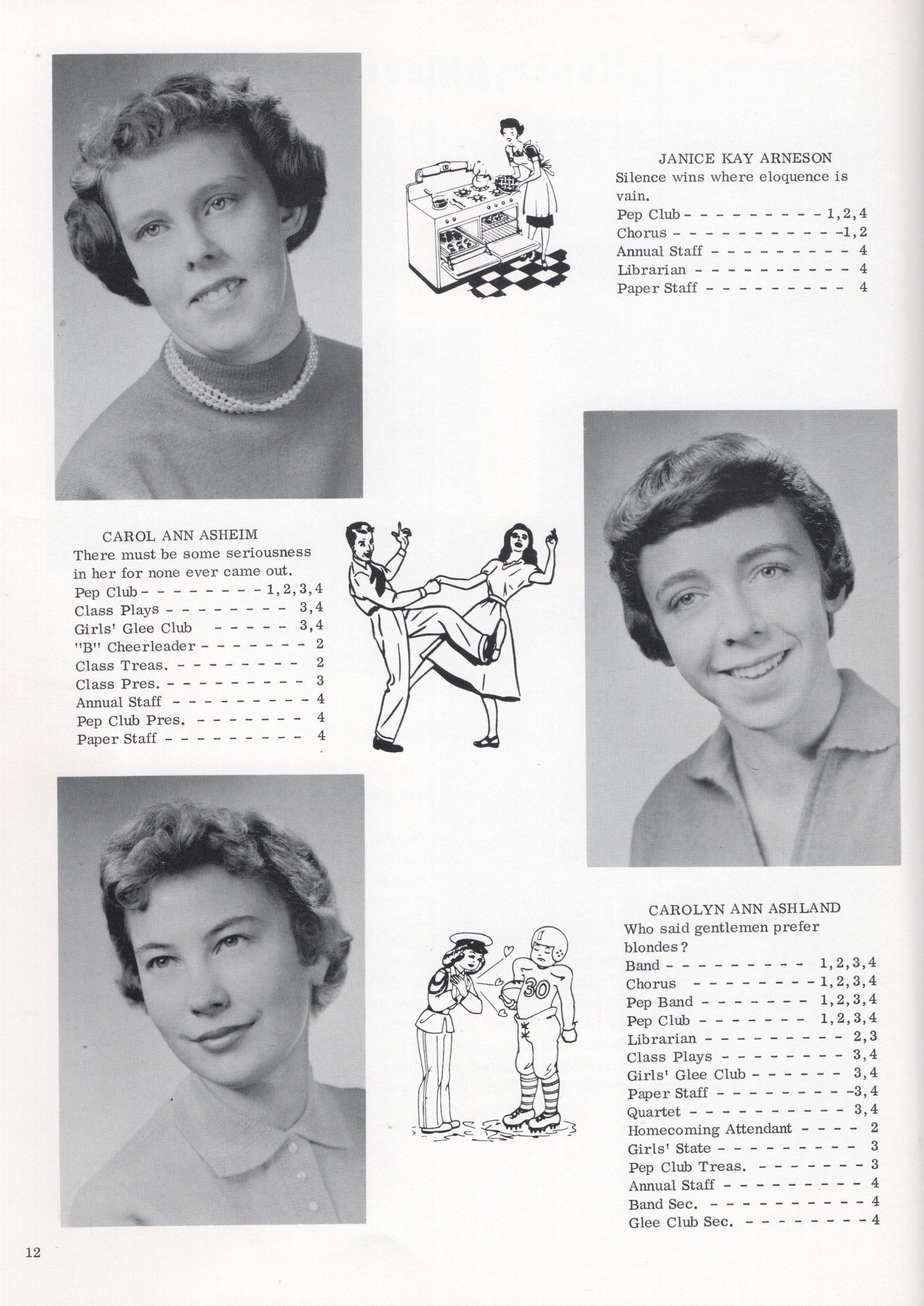 This 1958 yearbook includes nine pages of Class of 1958 Senior student photographs for: Janice Kay Arneson, Carol Ann Asheim, Carolyn Ann Ashland, Mary Margaret Bly, Karen R. Buringrud, Barbara Marie Falconer, Julian Fankhanel, Barbara Carol Fleischer, Joseph Gadberry Jr., Margaret June Grant, Janet Gail Grove, Nancy L. Holmes, Sharon Kay Hoyt, Shirley Ann Kilen, Roslie Kuntz, Kay Marie Ludwig, Rosalie L. Lien, John Oman, Sonia R. Overmoen, Ellen Jensine Overmoe, Darrel Rotvold, Clayton Schultz, Sandra Kay Seim, David Soholt, and Ronald Thorsrud.