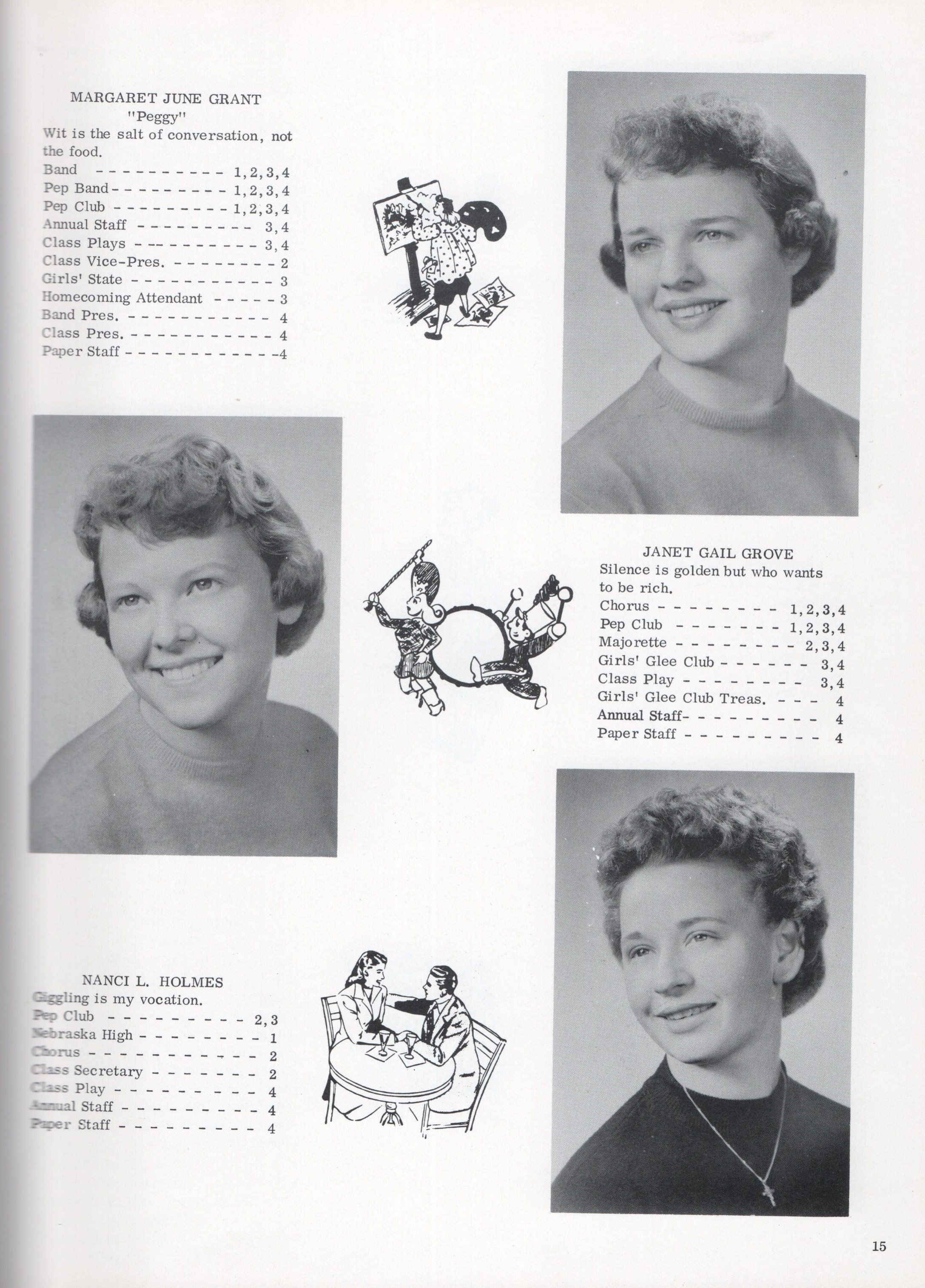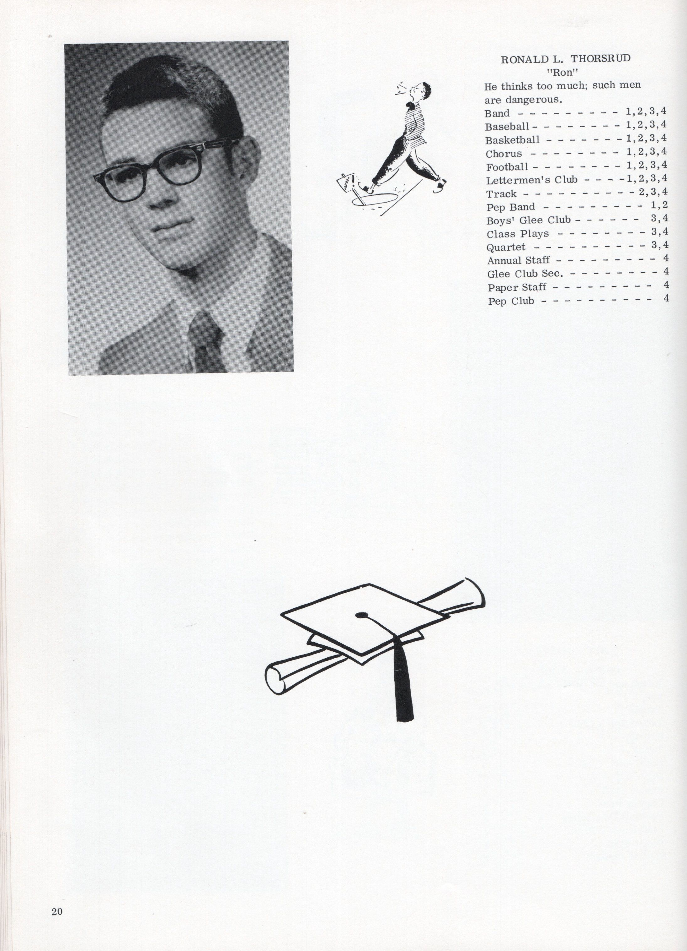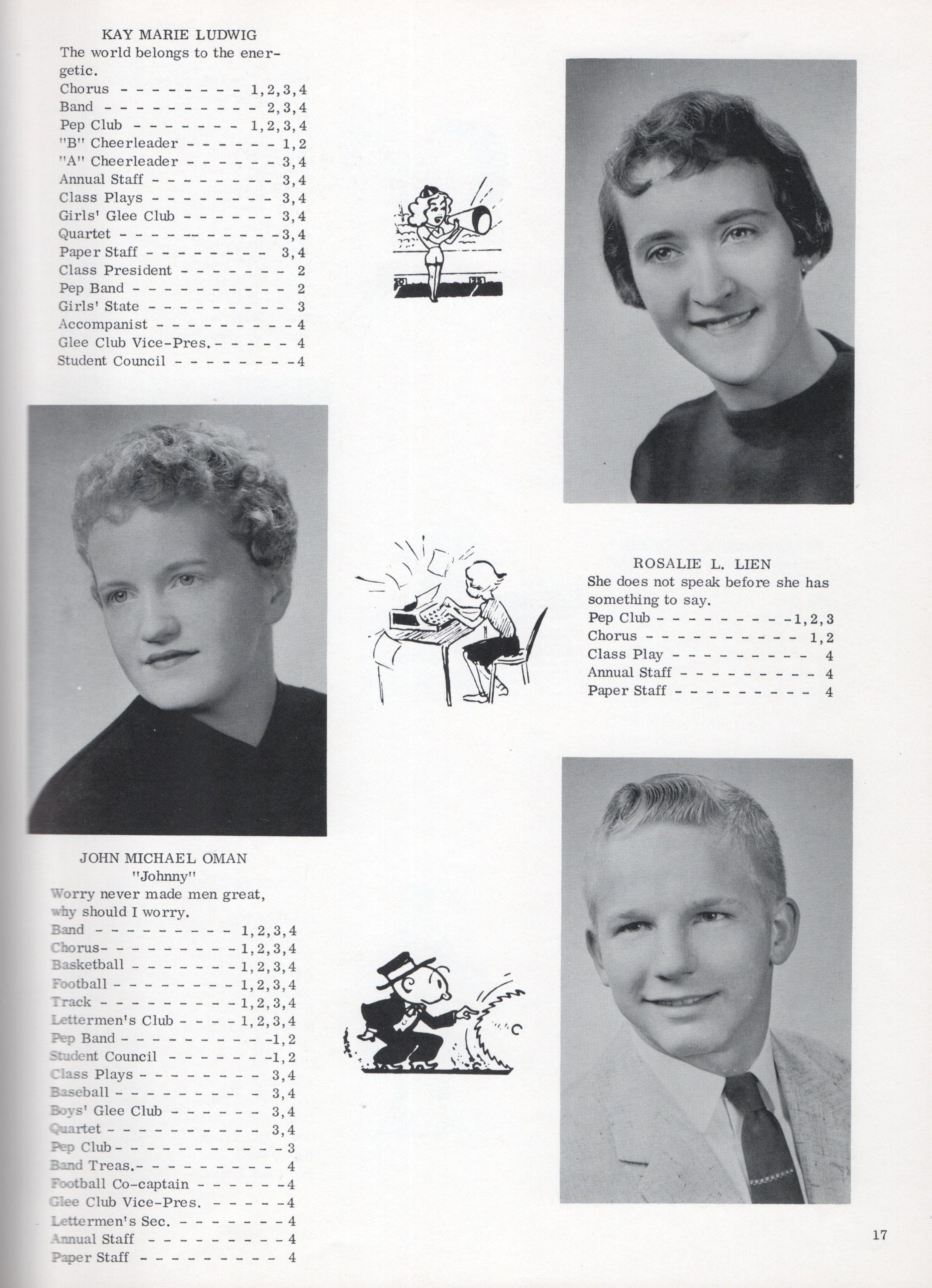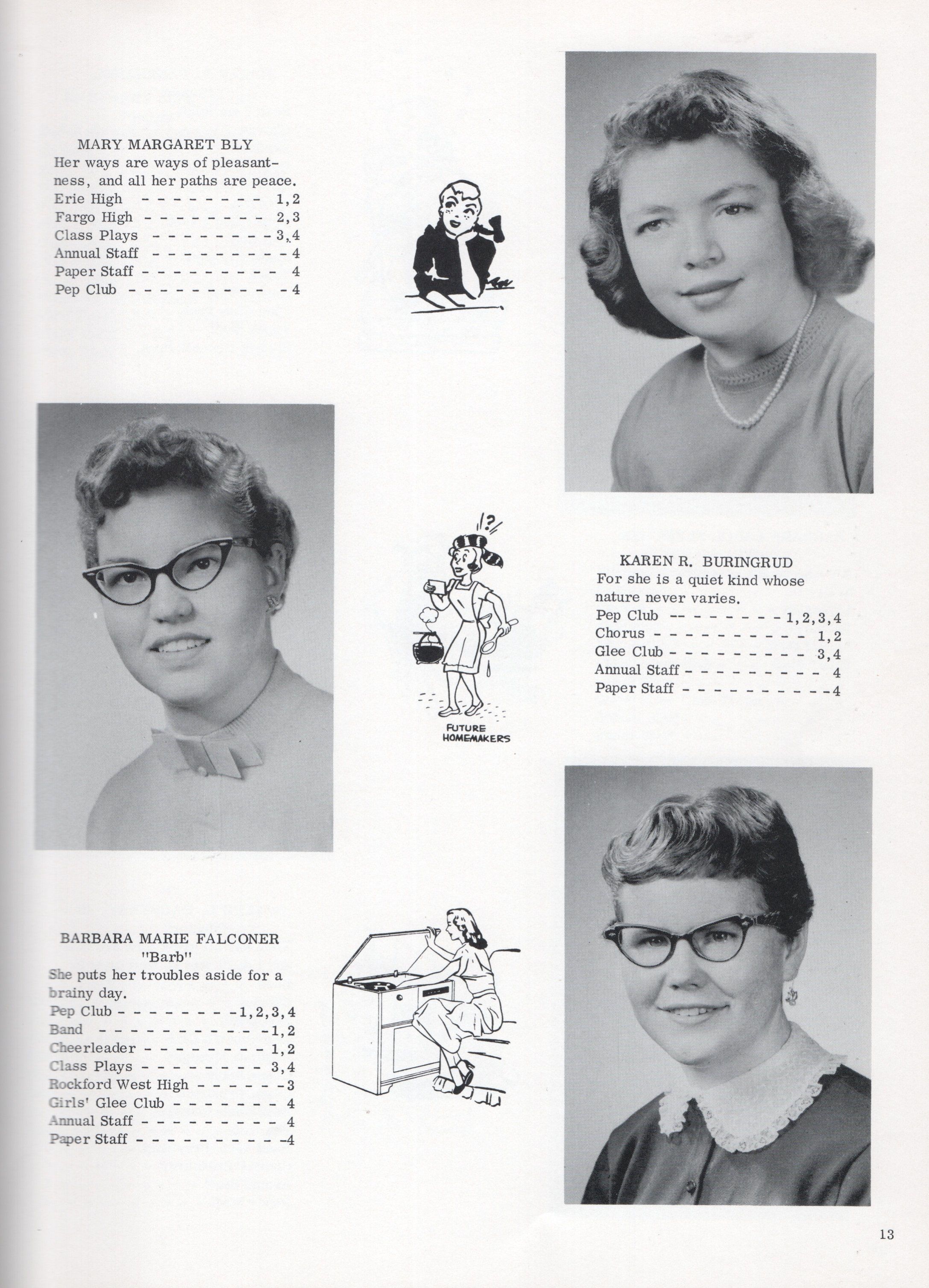 This 1958 yearbook includes nine pages of Class of 1958 Senior student photographs for: Janice Kay Arneson, Carol Ann Asheim, Carolyn Ann Ashland, Mary Margaret Bly, Karen R. Buringrud, Barbara Marie Falconer, Julian Fankhanel, Barbara Carol Fleischer, Joseph Gadberry Jr., Margaret June Grant, Janet Gail Grove, Nancy L. Holmes, Sharon Kay Hoyt, Shirley Ann Kilen, Roslie Kuntz, Kay Marie Ludwig, Rosalie L. Lien, John Oman, Sonia R. Overmoen, Ellen Jensine Overmoe, Darrel Rotvold, Clayton Schultz, Sandra Kay Seim, David Soholt, and Ronald Thorsrud.