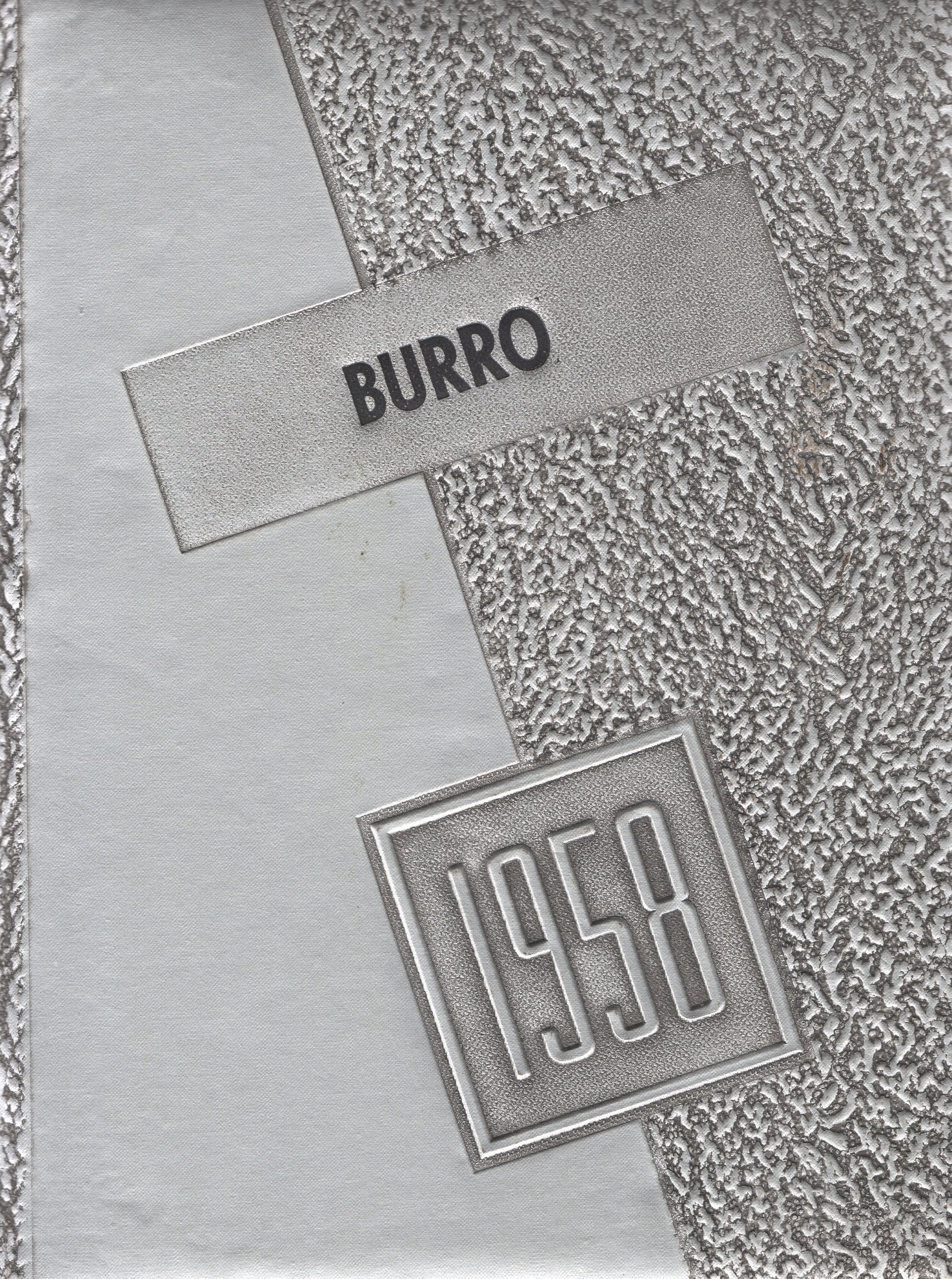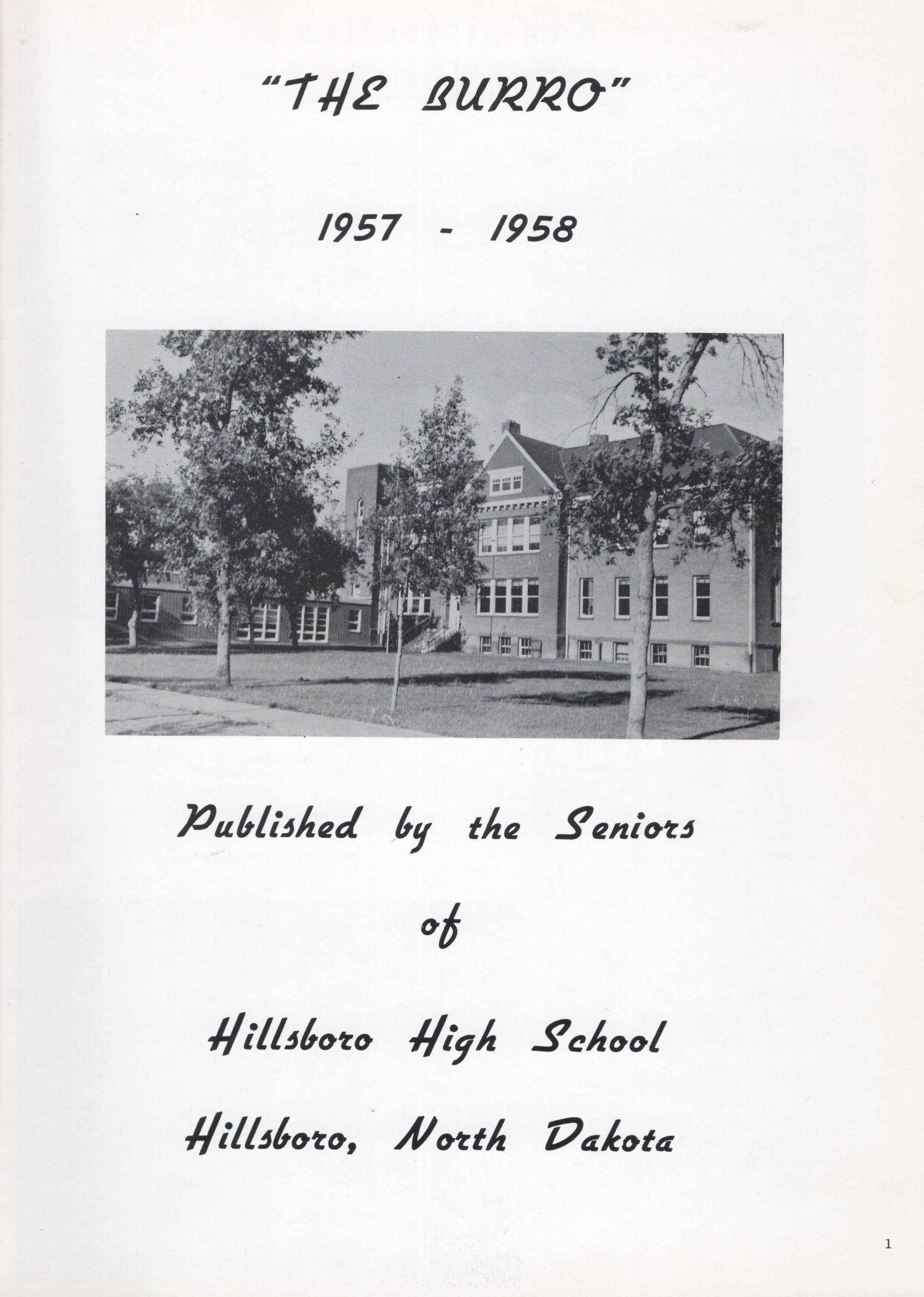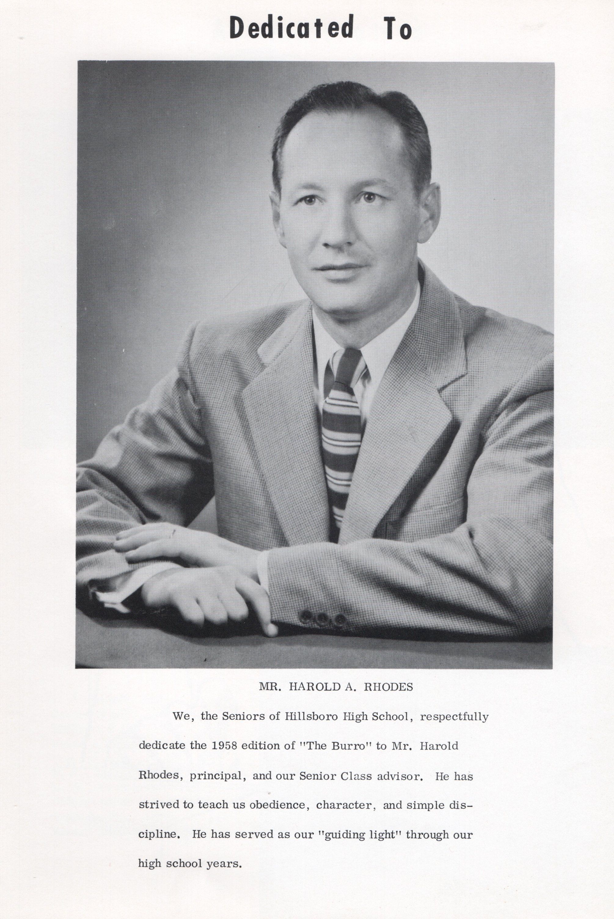 The Class of 1958 Hillsboro High School Yearbook, titled: The Burro 1957 - 1958, was dedicated to Mr. Harold A. Rhodes, principle.