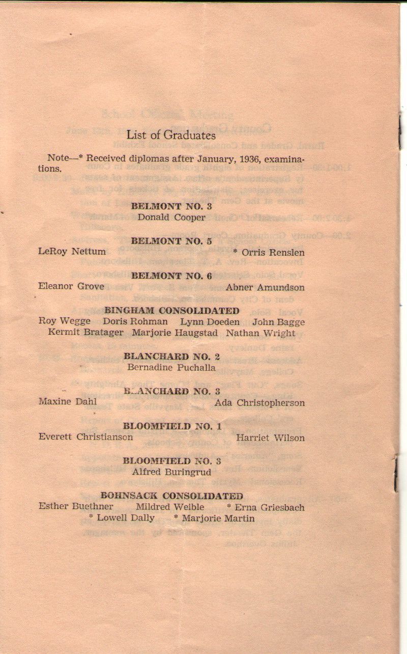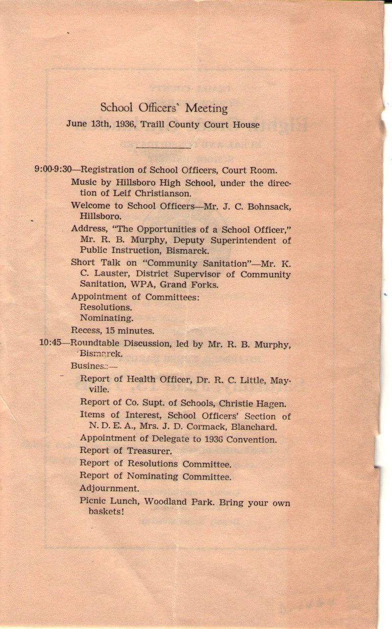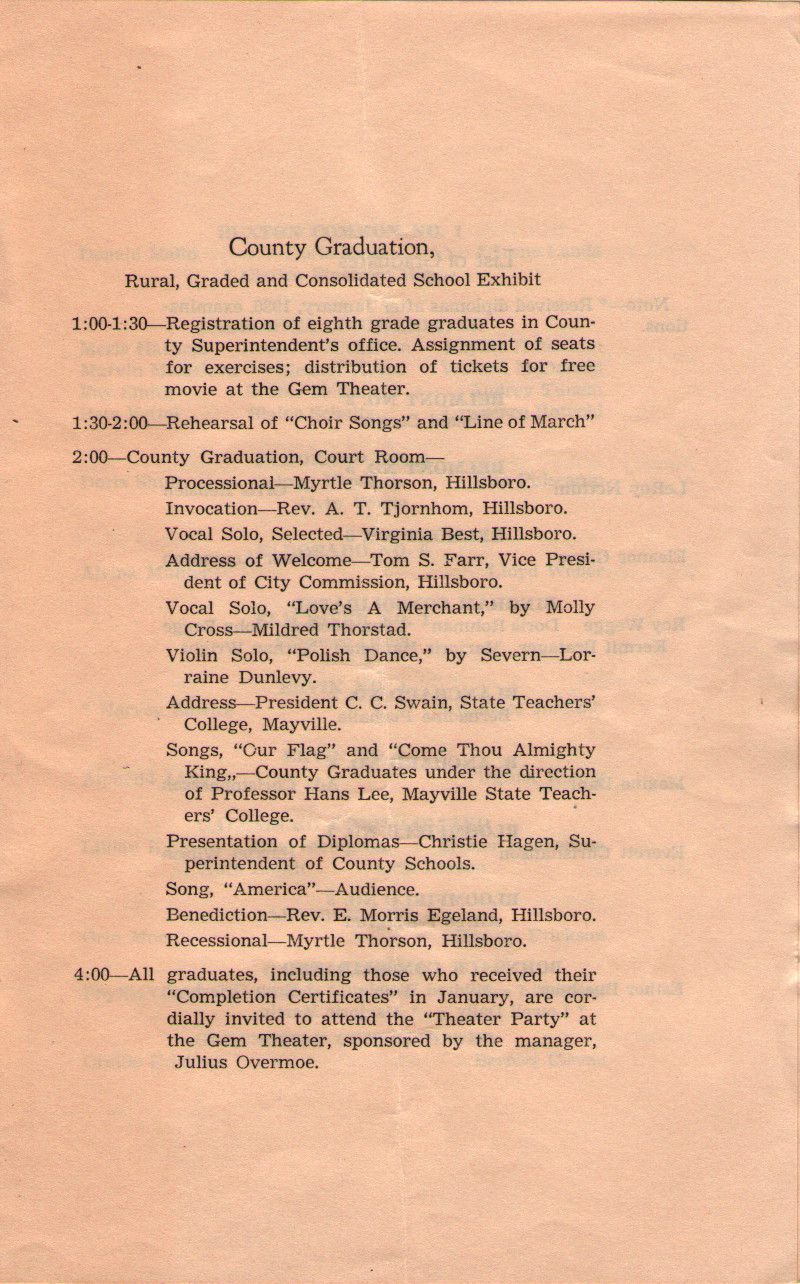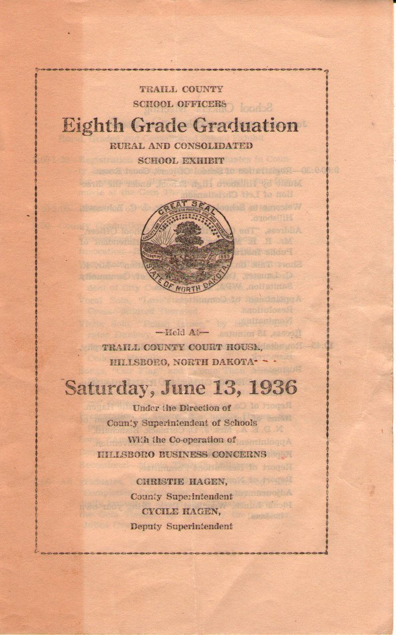 On 13 June 1936, Traill County Superintendent of Schools, Christie Hagen, directed the Annual Eighth Grade Graduation program for rural and consolidated schools was held at the Traill County Court House in Hillsboro, ND. The program began at 9 am with a Meeting of Traill County School Officers. The program for rural school graduates began at 1 pm.