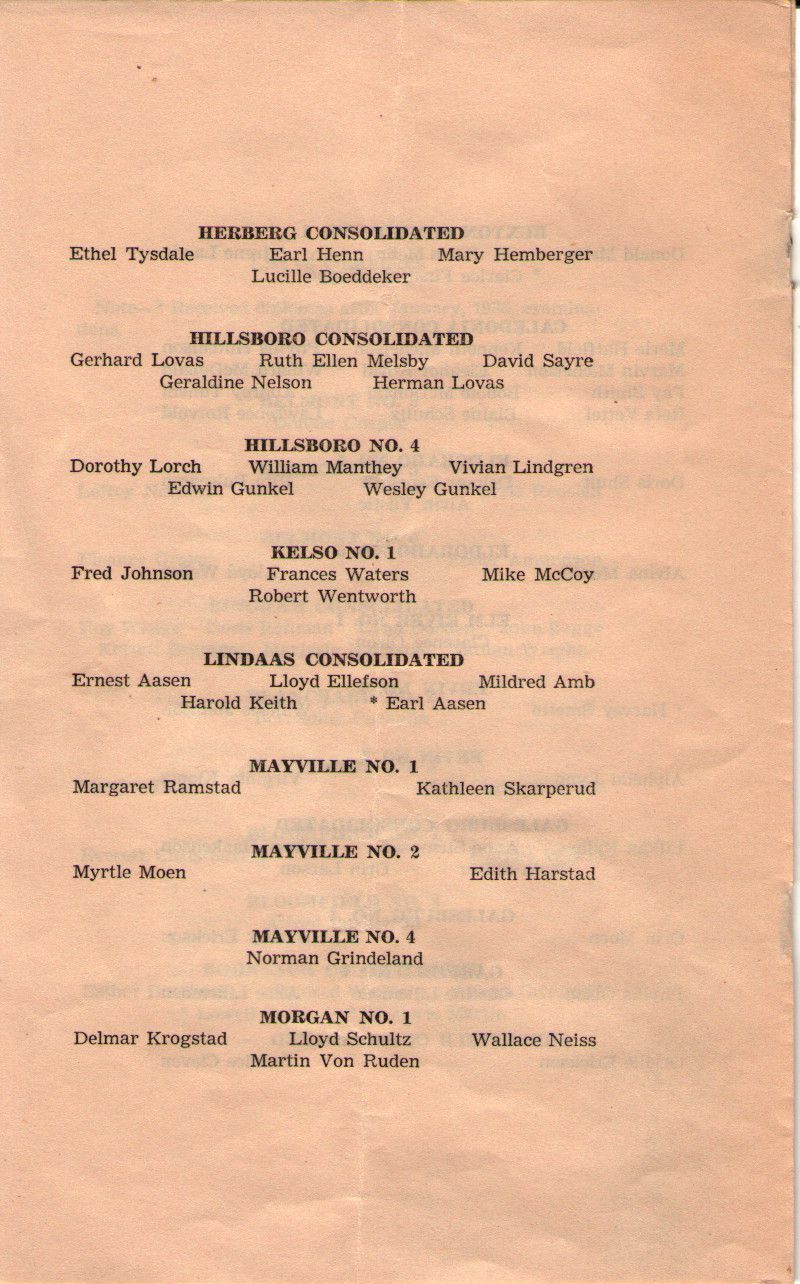 Bingham Consolidated: Roy Wegge, Doris Rohman, Lynn Doeden, John Bagge, Kermit Bratager, Marjorie Haugstad, and Nathan Wright.