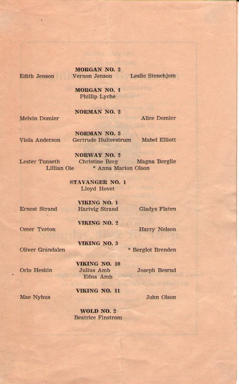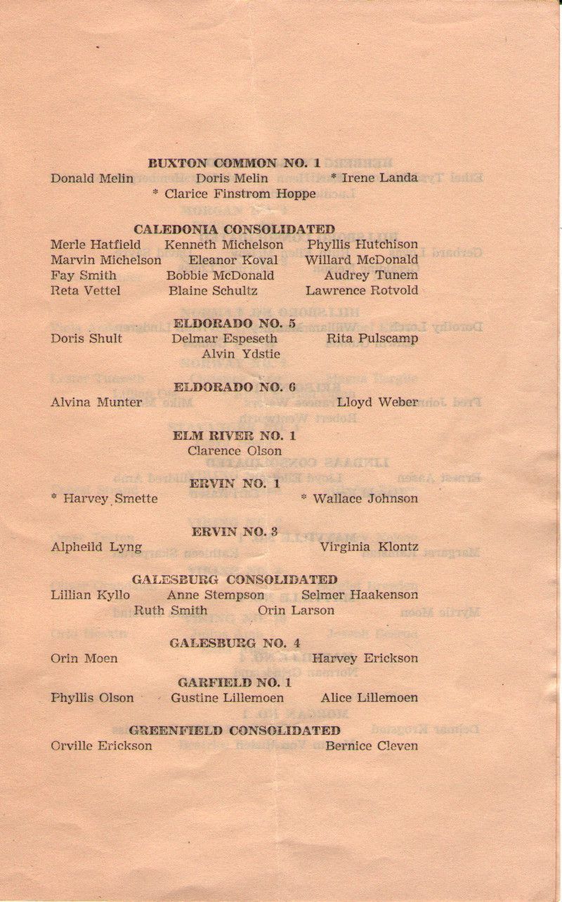 Caledonia Consolidated: Merle Hatfield, Kenneth Michelson, Phyllis Hutchison, Marvin Michelson, Eleanor Koval, Willard McDonald, Fay Smith, Bobbie McDonald, Audrey Tunem, Reta Vettel, Elaine Schultz and Lawrence Rotvold