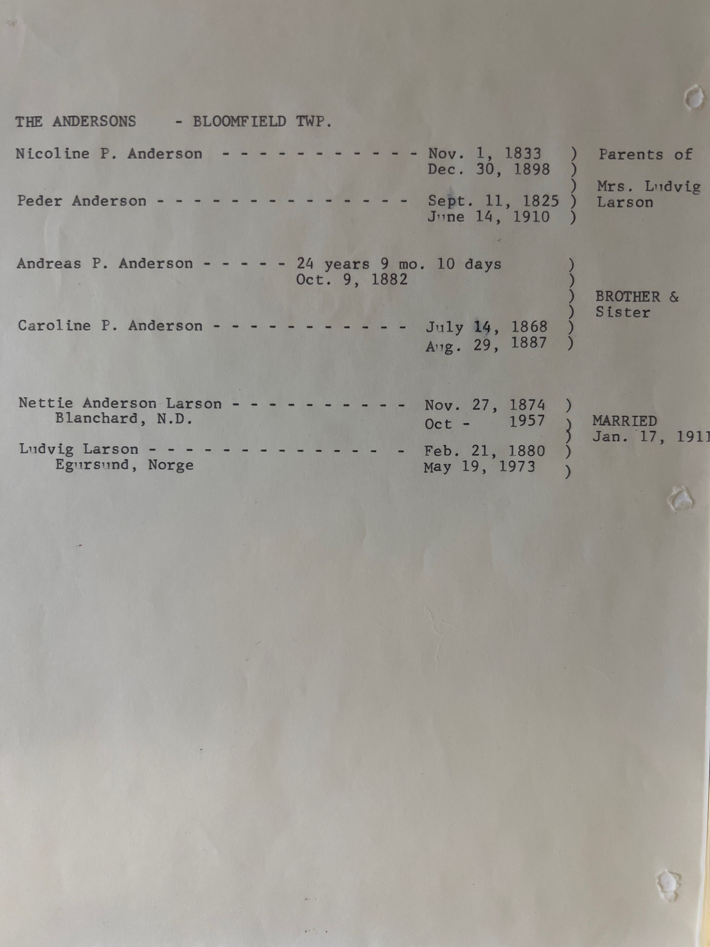 This file had a family chart completed by Nettie Anderson (Mrs. Ludvig Larson). Nettie's parents, Peder & Nicoline Anderson, were pioneers of Bloomfield Township in Traill County, DT.Acquisition