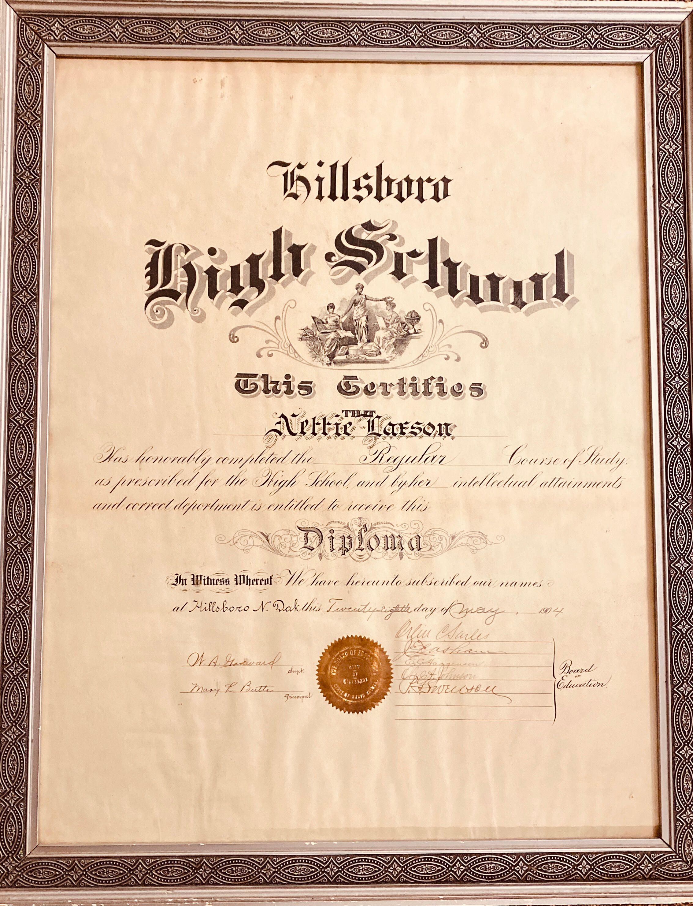 Nettie Larson - Hillsboro High School Diploma 1904Cataloged By