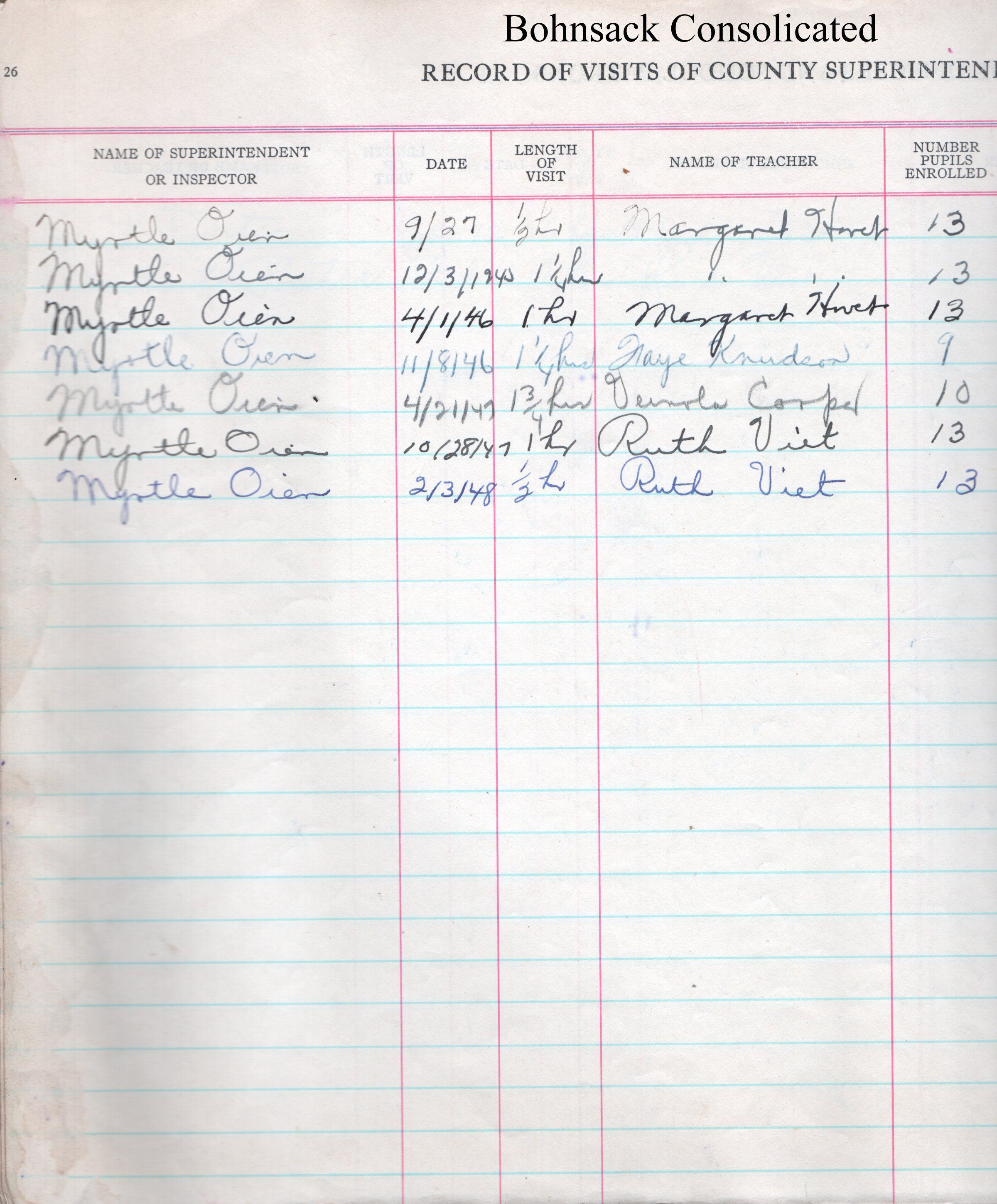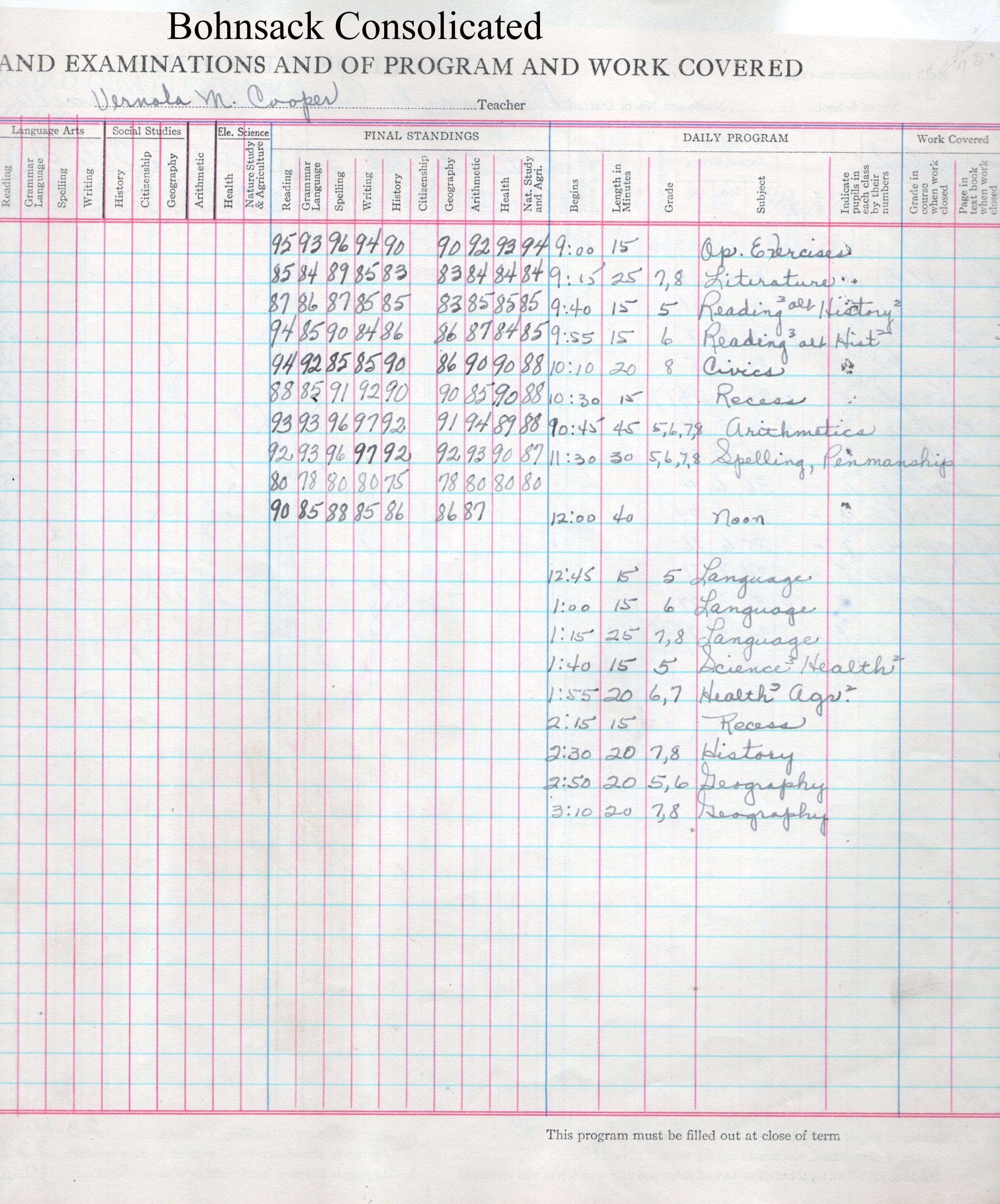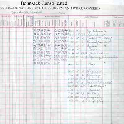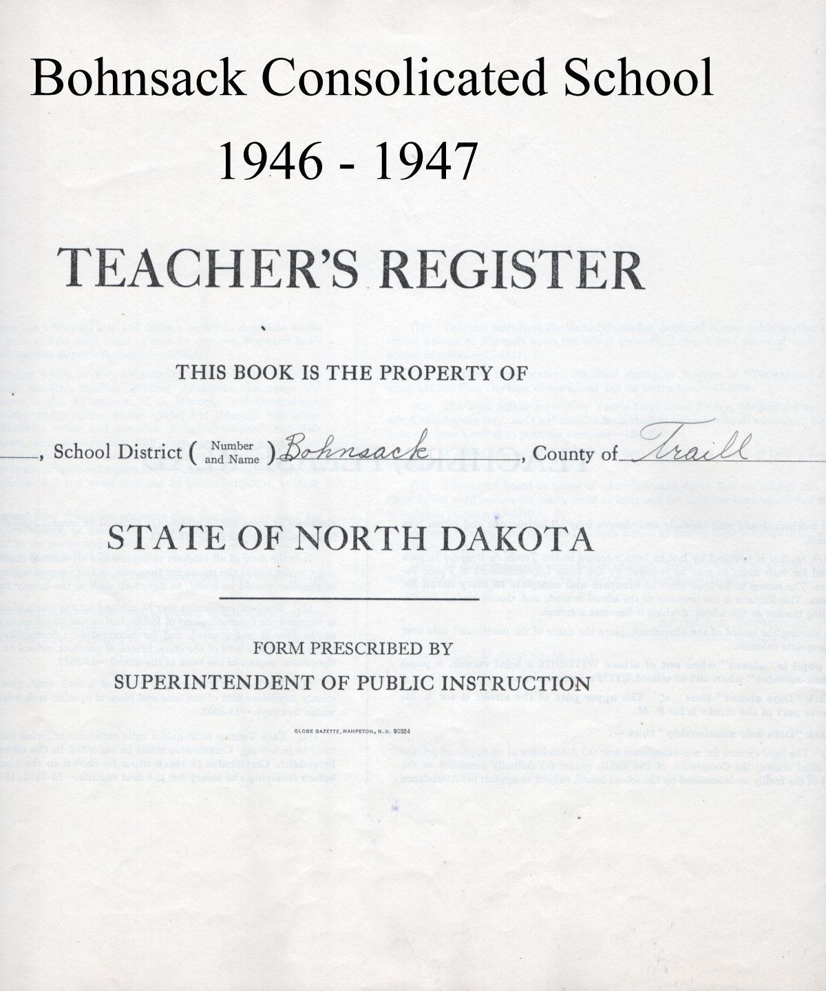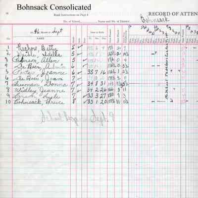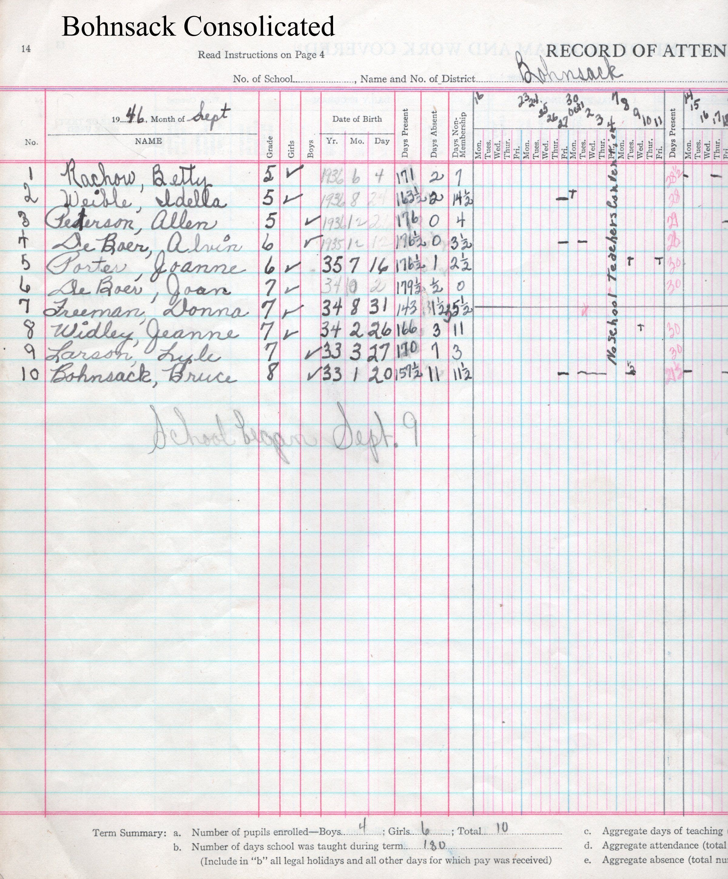 During the 1946-1947 school year, Bohnsack Consolidated teacher Vernola Cooper recorded the attendance of students in her grades 5 to 8. Students included Bruce Bohnsack, Alvin De Boer, Joan De Boer, Donna Freeman, Lyle Larson, Allen Peterson, JoAnne Porter, Betty Rachow, Idella Weible and Jeanne Widley.