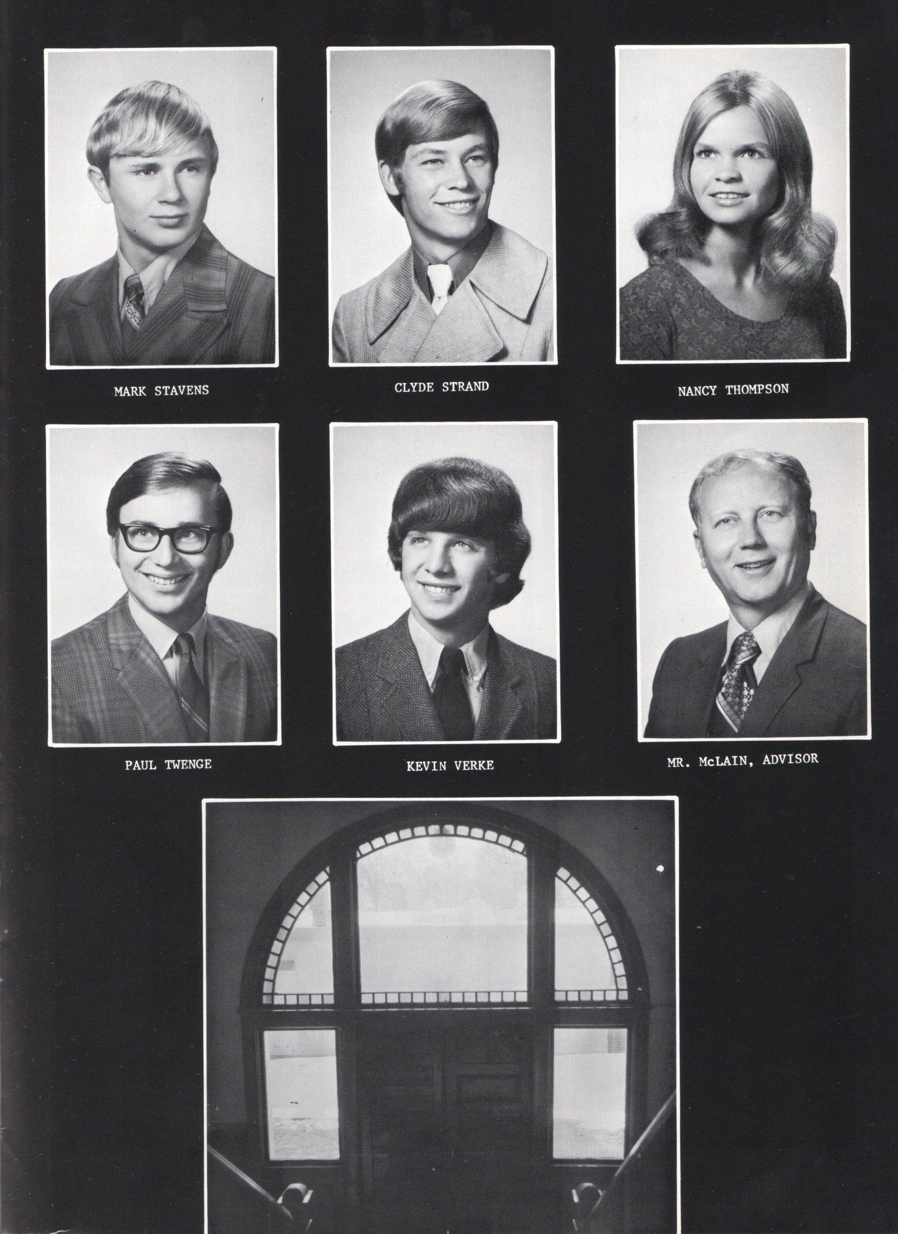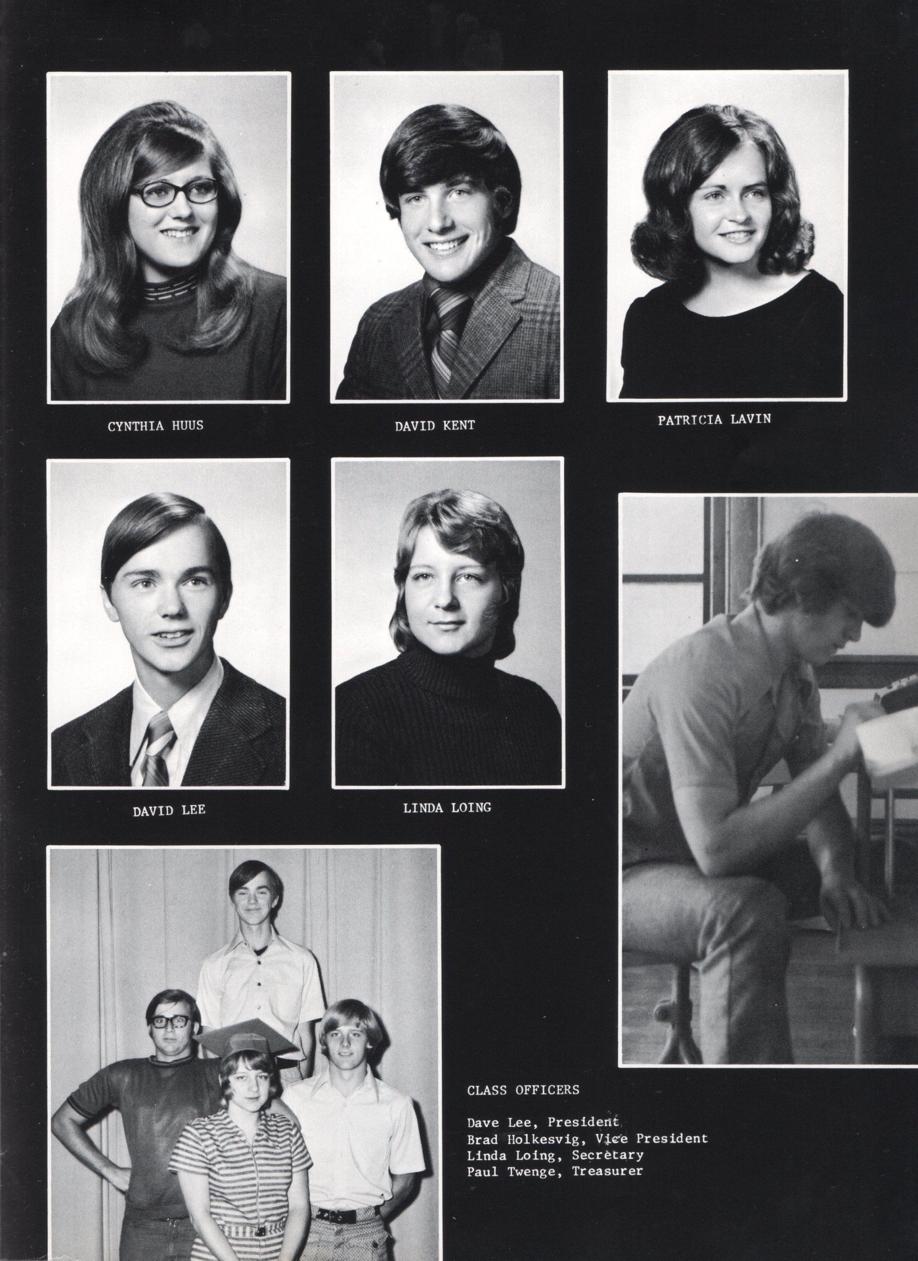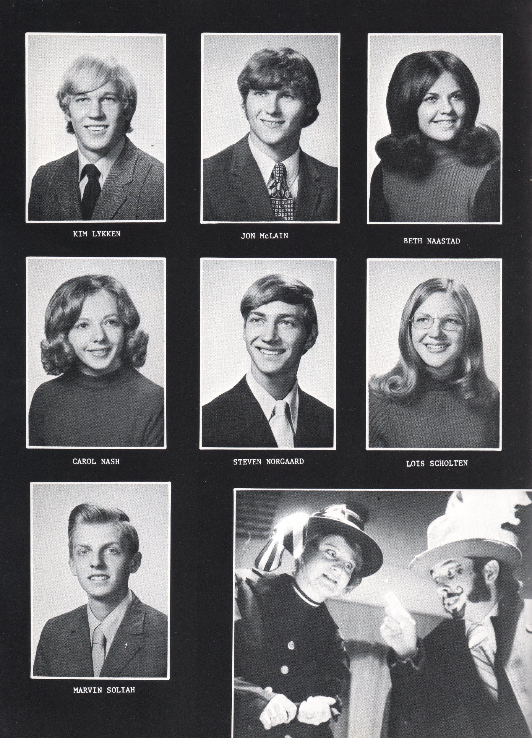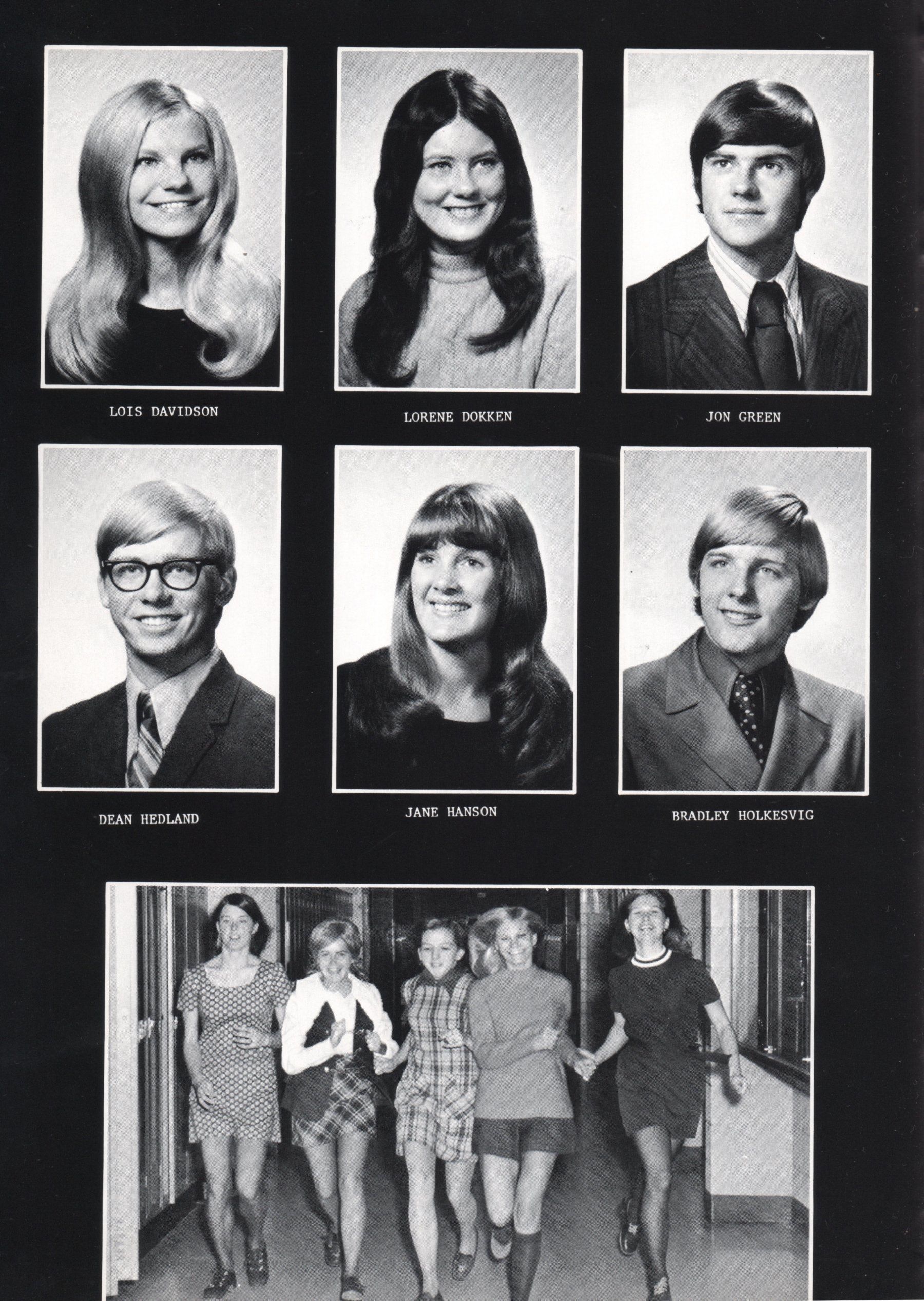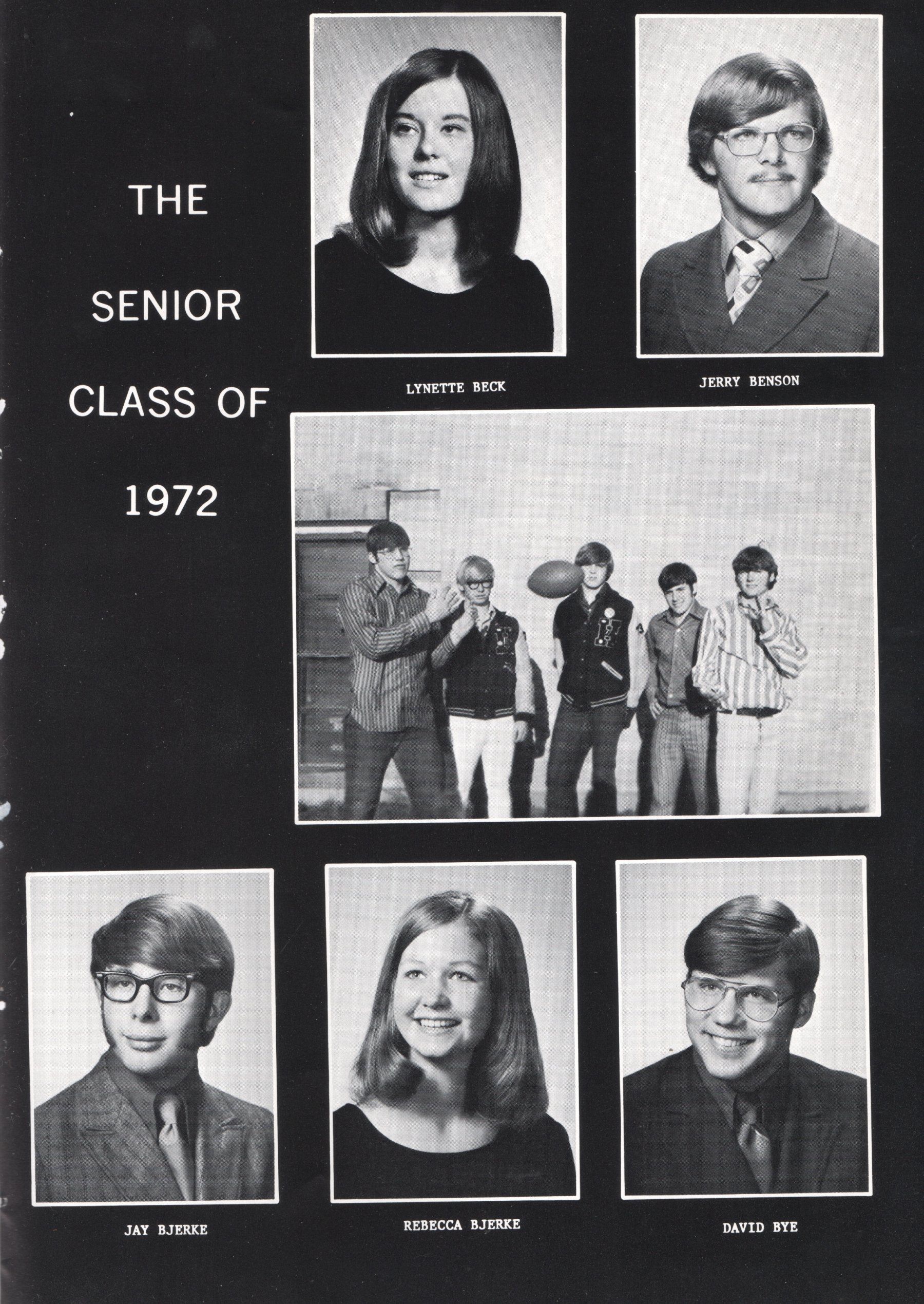 The 1972 yearbook includes five pages of Senior student photographs for: Lynette Beck, Jerry Benson, Jay Bjerke, Rebecca Bjerke, David Bye, Lois Davidson, Lorene Dokken, Jon Green, Jane Hanson, Dean Hedland, Bradley Holkesvig, Cynthia Huus, David Kent, Patricia Lavin, David Lee, Linda Loing, Kim Lykken, Jon McLain, Beth Naastad, Carol Nash, Steven Norgaard, Lois Scholten, Marvin Soliah, Mark Stavens, Clyde Strand, Nancy Thompson, Paul Twenge and Kevin Verke.