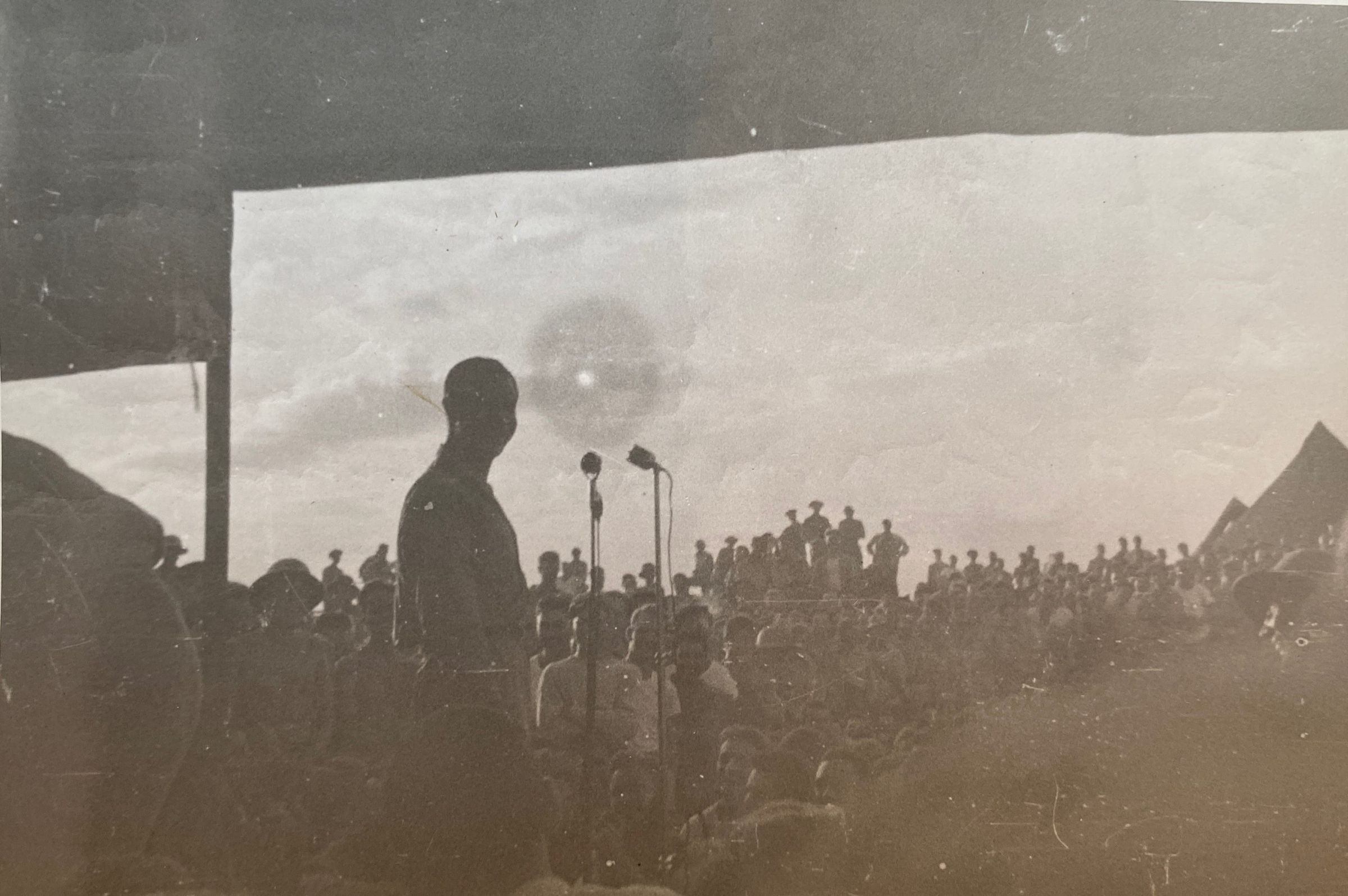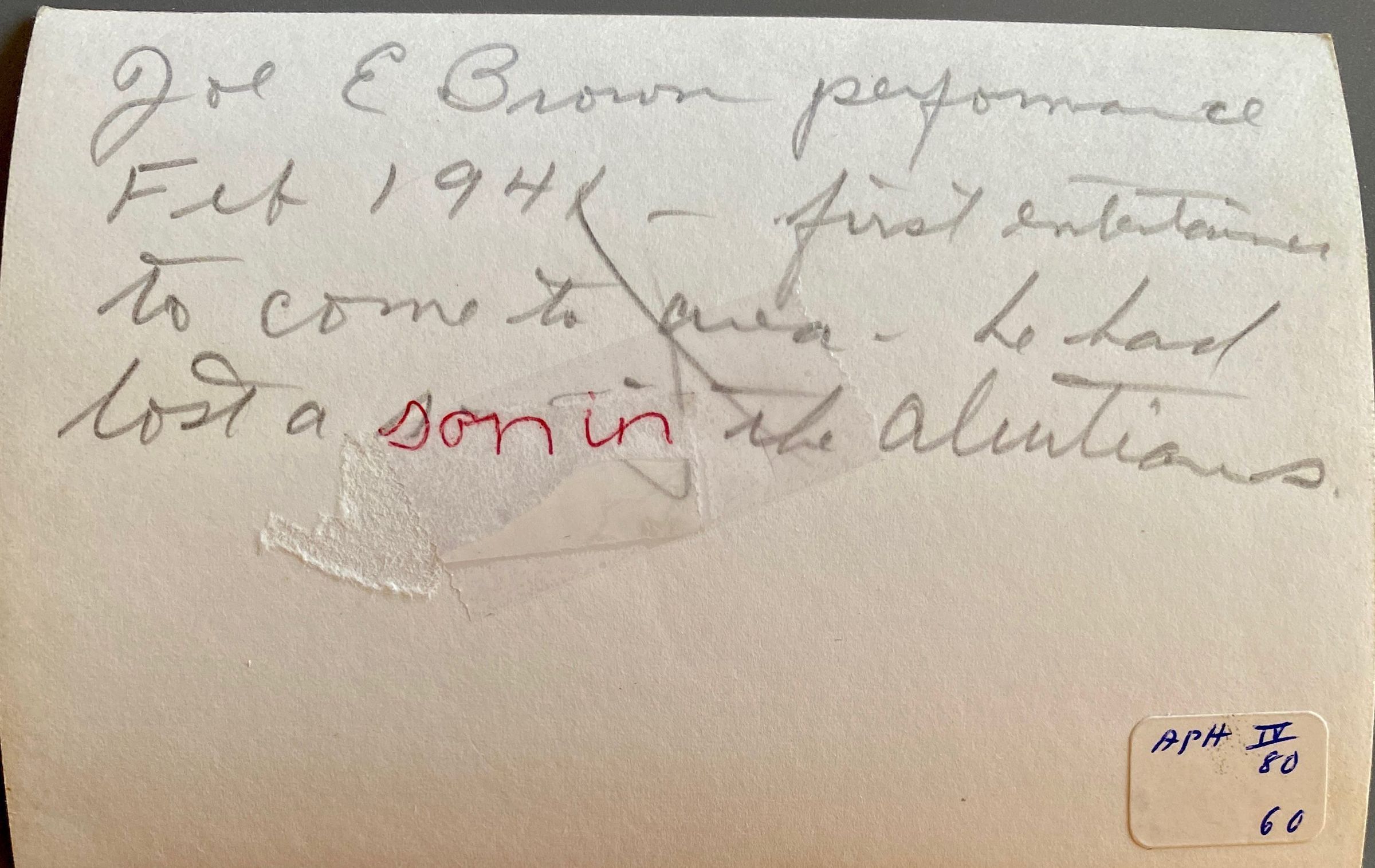 A February 1941 photograph of Joe E. Brown entertaining National Guard soldiers at Camp Claiborne, LA. The first Entertainer to come to Camp Claiborne.Cataloged By