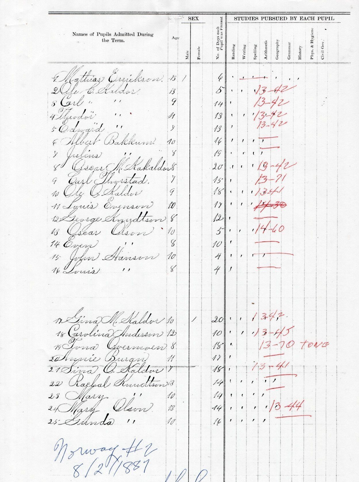 On 2 August 1887, Norway School No. 2 teacher, Martha O. Stern, reported the attendance of 25 students: Caroline Anderson, Albert Bakkum, Julius Bakkum, Annie Buran, Mathias Erickson, Lewis Evenson, John Hanson, Louis Hanson, Carl Kaldor, Edward Kaldor, Gina Kaldor, Ole C. Kaldor, Ole O. Kaldor, Sina Kaldor, Theodor Kaldor, Oscar M. Kaldor, George Knudtson, Mary Knudtson, Rachal Knudtson, Even Olson, Gunda Olson, Mary Olson, Oscar Olson, Tona Overmoen, and Carl Thorstad.
