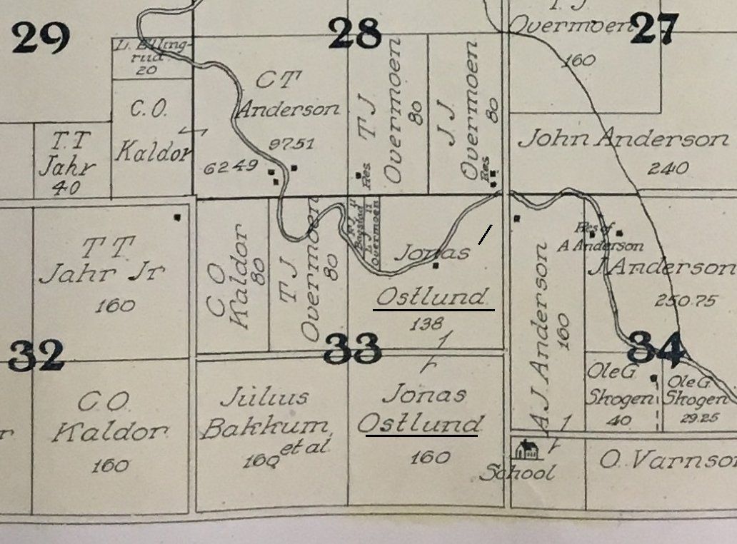 After they married, Oscar and Pauline lived on the Ostlund farm in Norway Township, which was located in the east -half of Sect. 33 [see 1909 plat map, below]. Note that the farmstead was located near the Goose River, and a school was located nearby in Sect. 34.