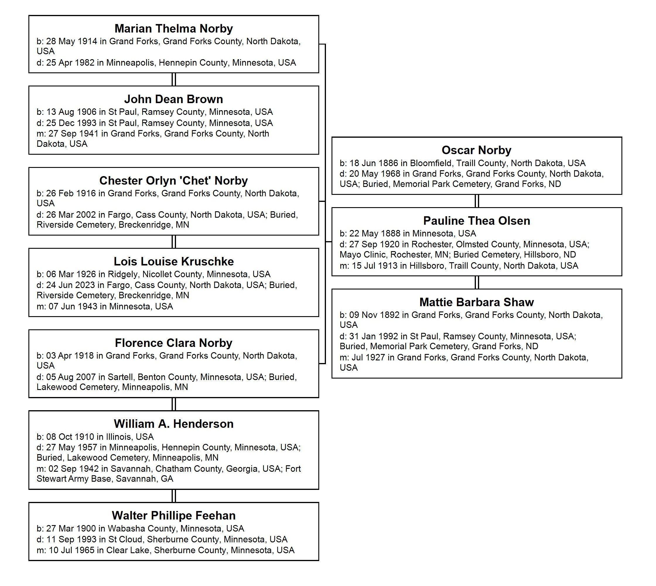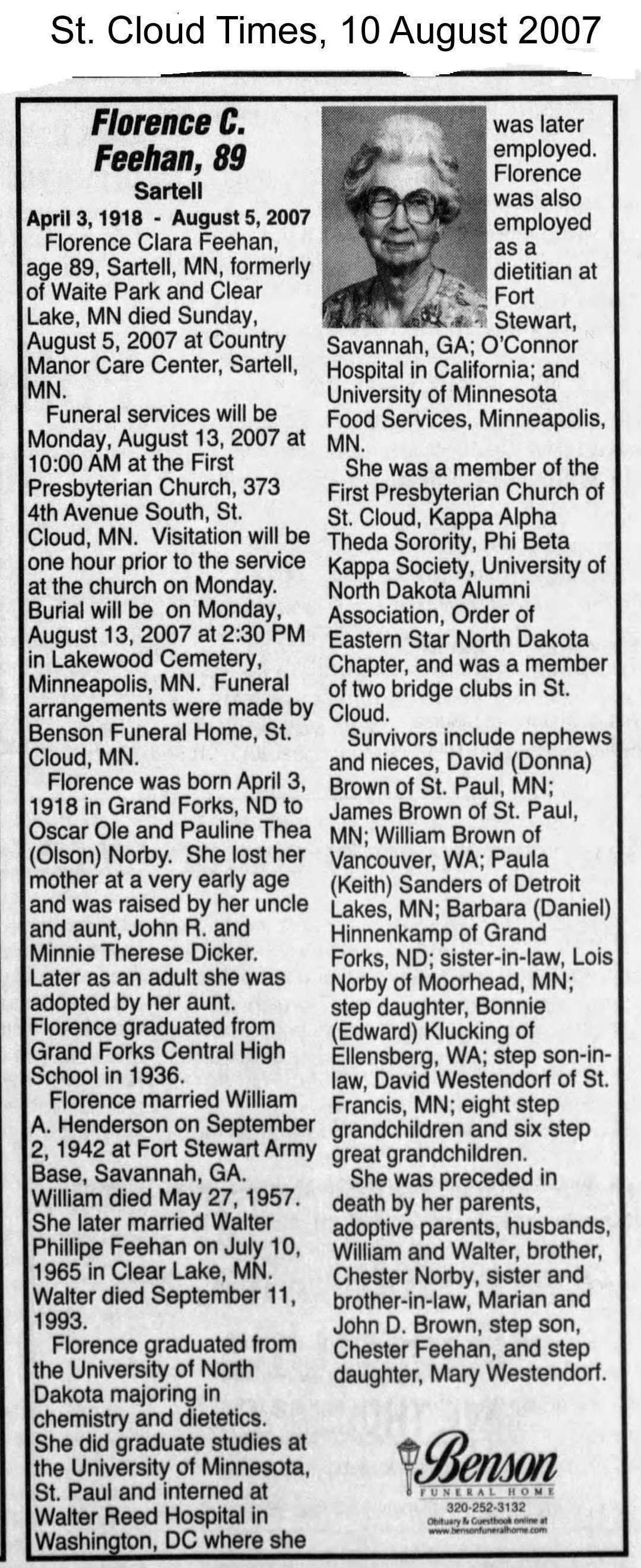Oscar and Pauline's second daughter, Florence Clara Norby, was born on 3 April 1918 in Grand Forks. In the 1920 US Census, Florence was 1. I did not find Florence Norby with her family in the 1930 US Census because when her mother, Pauline died in 1920, Florence was only 2, so Florence was raised, and later adopted, by her uncle and aunt, John and Minnie Dicker of Grand Forks. Florence (Norby) Dicker graduated from Grand Forks Central High School with the Class of 1936 [Sr Photo, below]. In 1940, Florence, 22, graduated in chemistry and dietetics from the University of North Dakota, Grand Forks [obituary info, below]. While employed as a dietician at Fort Stewart in Savannah, Georgia, Florence Clara (Norby) Dicker married William A. Henderson on 2 September 1942, where William was serving in the US Army. William was born on 8 October 1910 in Illinois. After serving during WWII, William and Florence returned to the Midwest. Unfortunately, William A. Henderson died at age 46 on 27 May 1957 in Minneapolis, MN [obit info]. William was interred in the Lakewood Cemetery in Minneapolis. On 10 July 1965, Florence (Norby-Dicker) Henderson married widow Walter Phillipe Feehan in Clear Lake, MN. Walter was born on 27 March 1900 in Wabasha County, MN. Walter and Florence resided in Waite Park and Clear Lake, MN. Walter Feehan died, age 93 on 11 September 1993 in St. Cloud, MN, and was interred in Fort Snelling National Cemetery in Minneapolis [obit, St. Cloud times, 14 September 1993]. Florence (Norby-Dicker) Henderson-Feehan died, age 89, on 5 August 2007 in Sartell in Benton County, MN [obit, St Could Times, 10 August 2007]. Florence was interred in Lakewood Cemetery in Minneapolis.