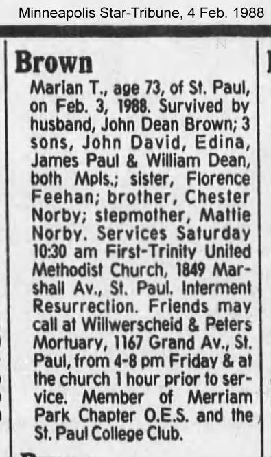 Their oldest daughter, Marian Thelma Norby was born on 20 May 1914 in Grand Forks, ND. In the 1920 US Census for Norway Township, Marian was 5. By 1930, Marian, 15, had moved with her family to Chestnut Street in Grand Forks, ND [1930 US Census]. In the 1940 US Census, Marian, 25, still resided at Chestnut St., and interestingly, a lodger, John D. Brown, 33, was in the household. On 27 September 1941, Marian Thelma Norby married John Dean Brown in Grand Forks [ND Marriage License, Grand Forks County]. John was born on 13 August 1906 in St. Paul, MN. After John and Marian married, they first lived in Grand Forks, but by the time of the 1950 US Census, they had moved to St. Paul where John was a "Lawyer" in a "Law Office". John and Marian had three sons, John David Brown, James Patrick Brown and William Dean Brown. Marian (Norby) Brown passed away, age 73, on 3 February 1988 in Minneapolis [Obituary, Star-Tribune, 4 Feb. 1988, below]. Some records, such as the US. Soc. Sec. Death Index, have Marian's date of death as 25 April 1982, however, the obituary is clear about Marian Thelma (Norby) Brown's passing on 3 February 1988. John Dean Brown lived to the age of 87, passing away on 25 December 1993 in St. Paul, MN.